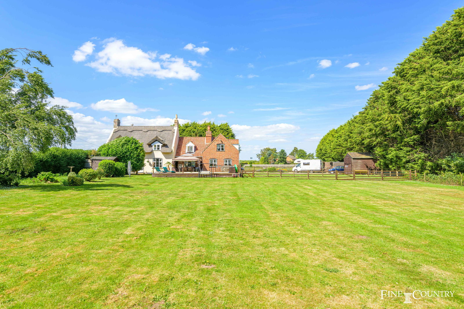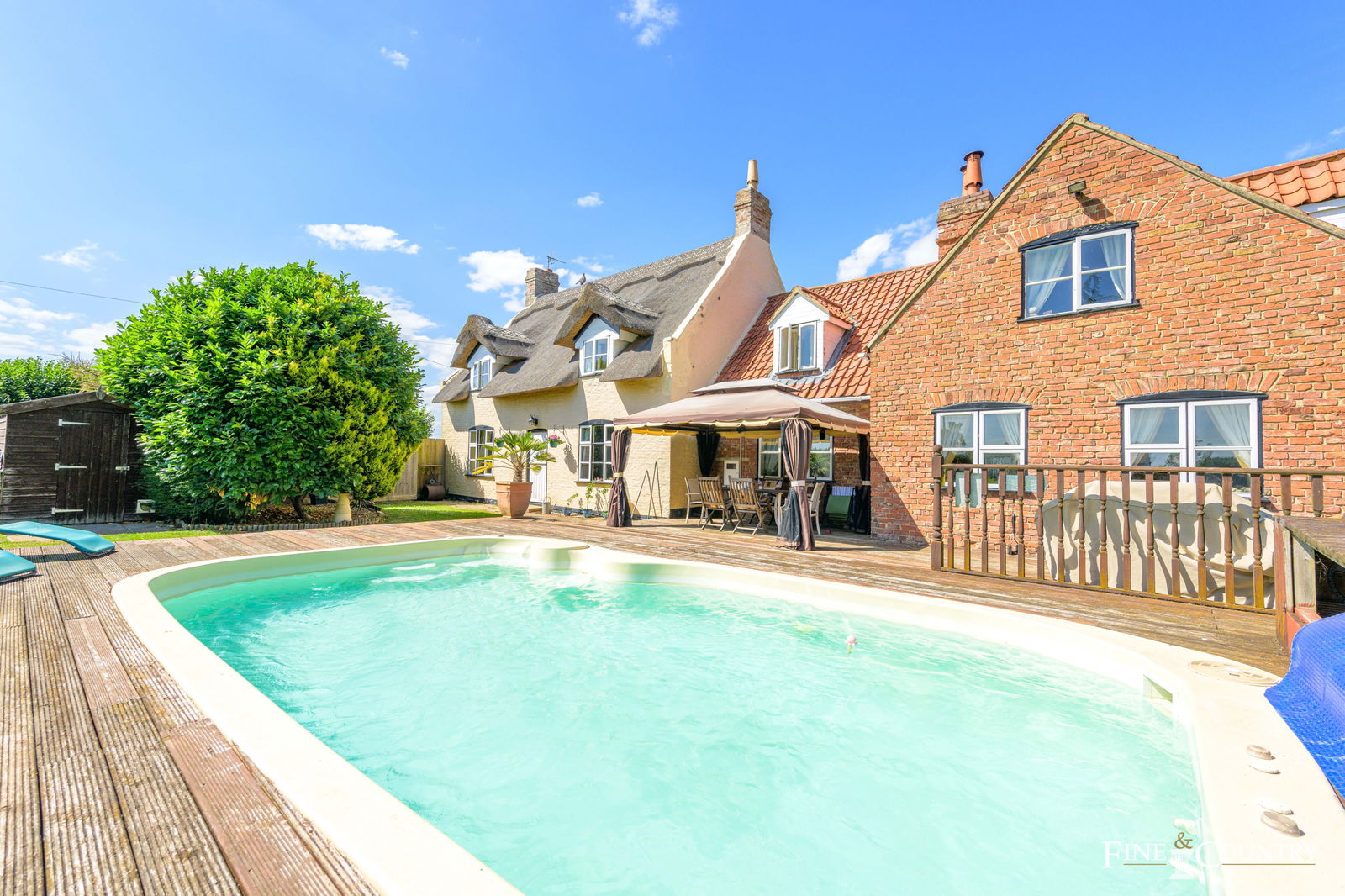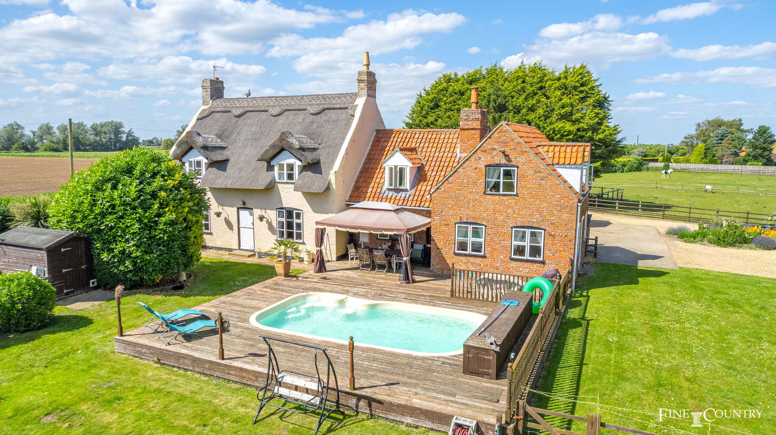 A charming extended, thatched cottage sits in a rather idyllic rural spot surrounded by its garden and paddocks just north of the pretty market town of Spalding with easy access to excellent schools, shopping and facilities. The grade II listed, four bedroomed house, the principal one en suite, is full of character and enjoys a good connection with the garden and its swimming pool, as well as a sizeable annex which could be used for extra accommodation or be an extensive office suite for a business. Further outbuildings include stables, a workshop and storage.
