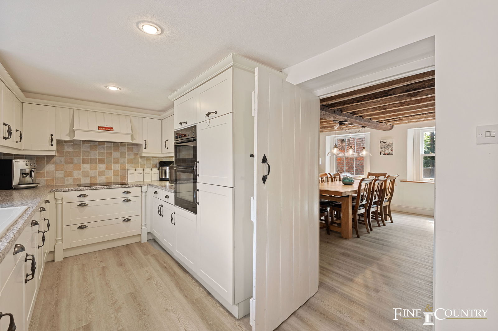 Inside, the house is arranged over three floors, with many original features retained. The main entrance opens into a hallway where the staircase rises to the upper floors. To either side are two elegant reception rooms: the drawing room and the family room, each with a fireplace and generous windows that draw in natural light. Beyond, the dining room is a particularly atmospheric space, with a large fireplace and a beamed ceiling that speaks to the building’s eighteenth-century origins. The kitchen, reached via the dining room, is a practical yet inviting space, fitted with timeless shaker-style units and equipped with integrated appliances, including eye-level ovens, an electric hob, and a built-in dishwasher. A utility room and boot room with cloakroom complete the ground floor.