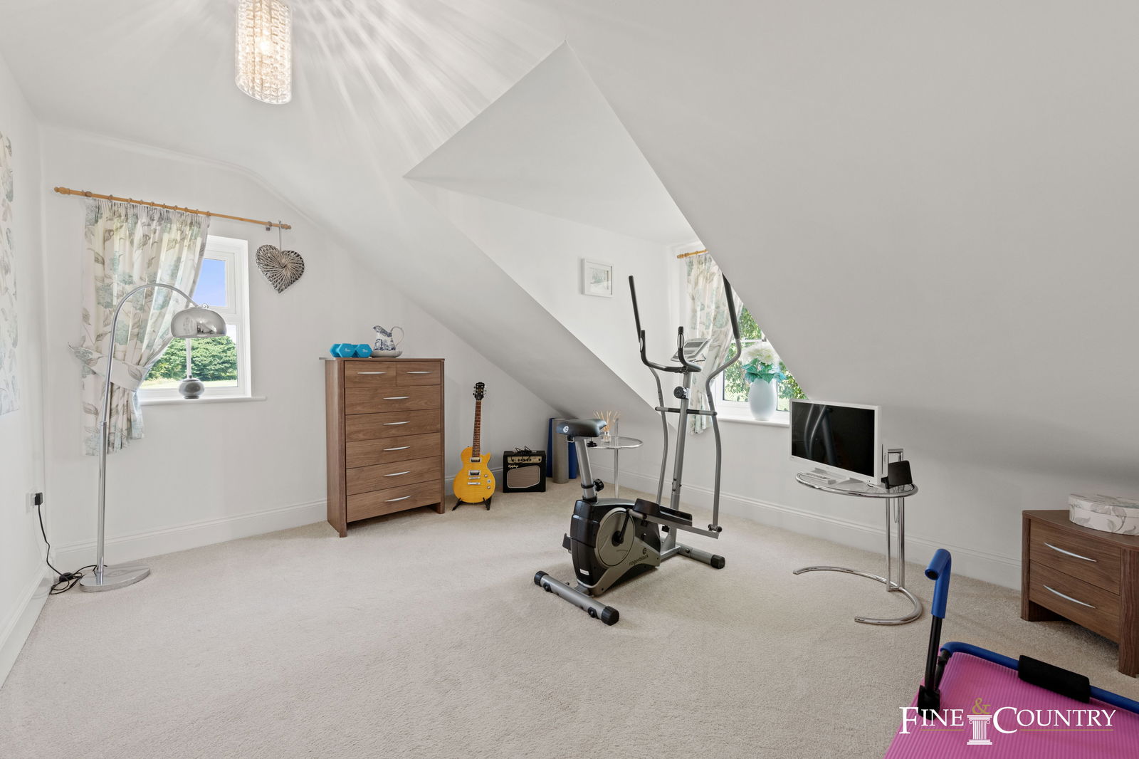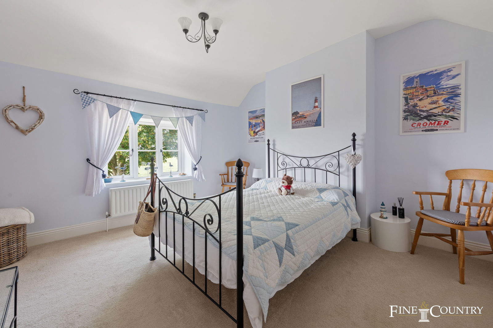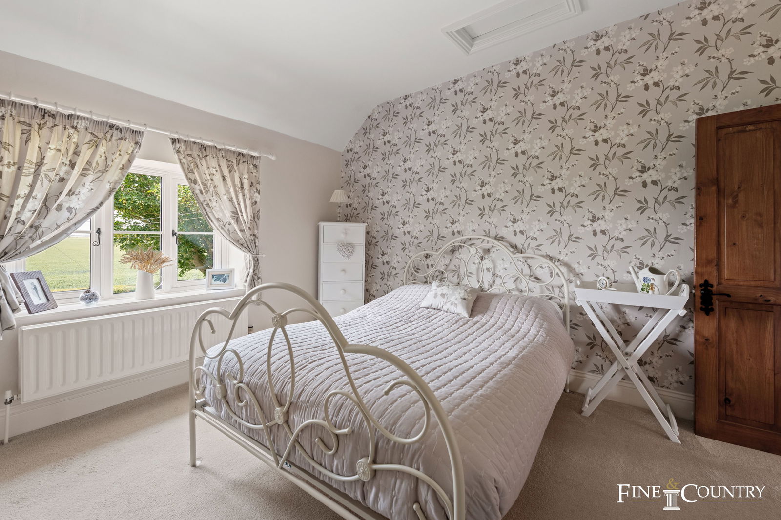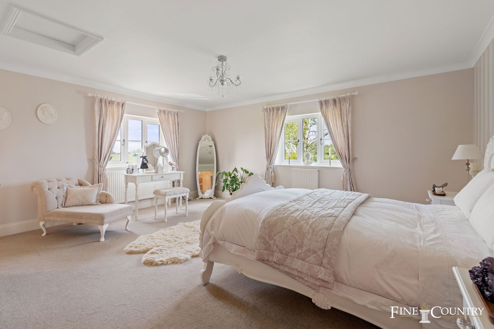 Upstairs are five bedrooms, including a generous principal suite with dual-aspect views, a walk-in wardrobe and an en suite shower room. A wide landing provides space for a reading corner or additional seating, and the family bathroom includes both a freestanding roll-top bath and separate shower. The overall feel throughout the house is welcoming and characterful, with a considered mix of traditional features and more striking decorative touches that reflect a clear sense of style and attention to detail.