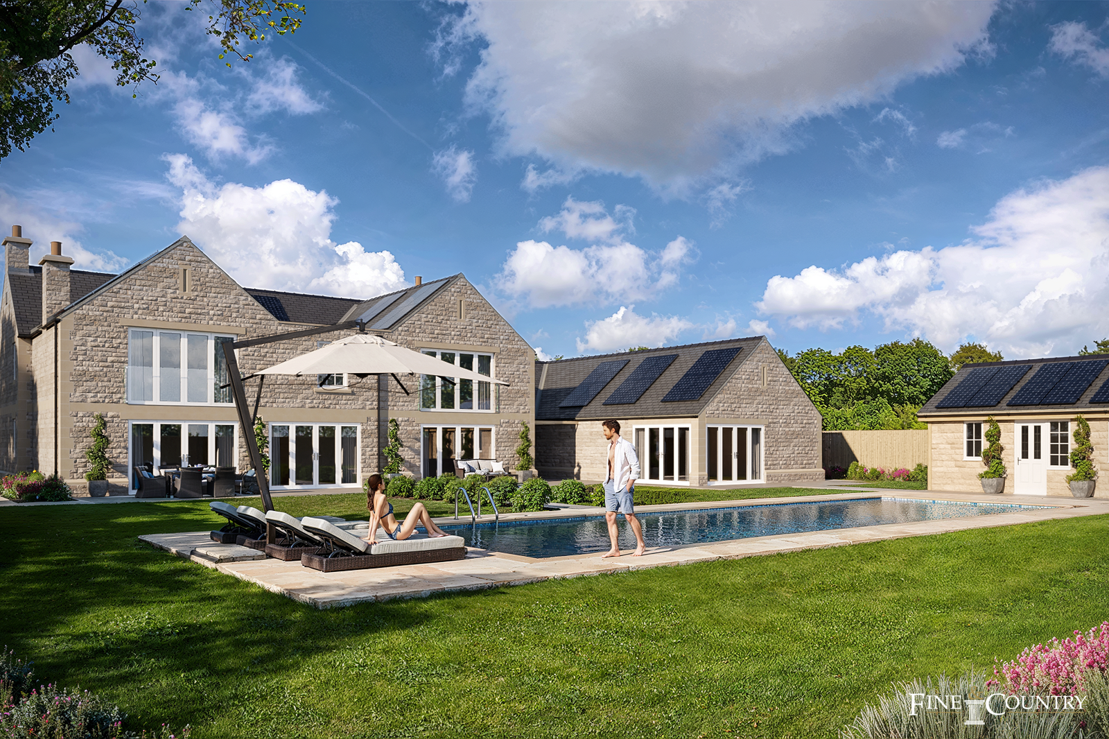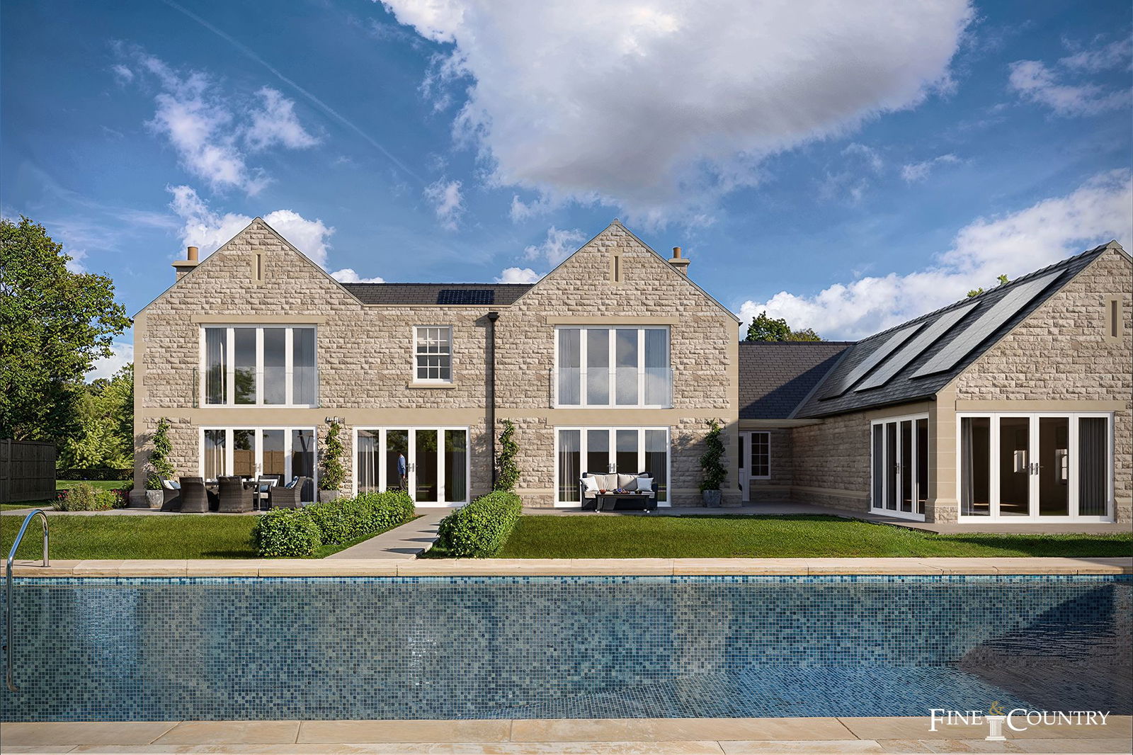 The sunlit, enclosed rear garden is designed for leisure and entertainment, will be featuring an outdoor swimming pool and a spacious patio terrace ideal for al fresco dining. The remainder of the grounds will be featuring a central lawn, a pond, and a variety of trees and shrubs along the perimeter.