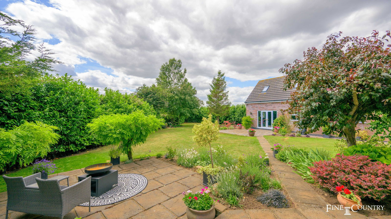 The garden wraps around the house and offers a blend of lawn and planted borders, with open rural views beyond the rear boundary.