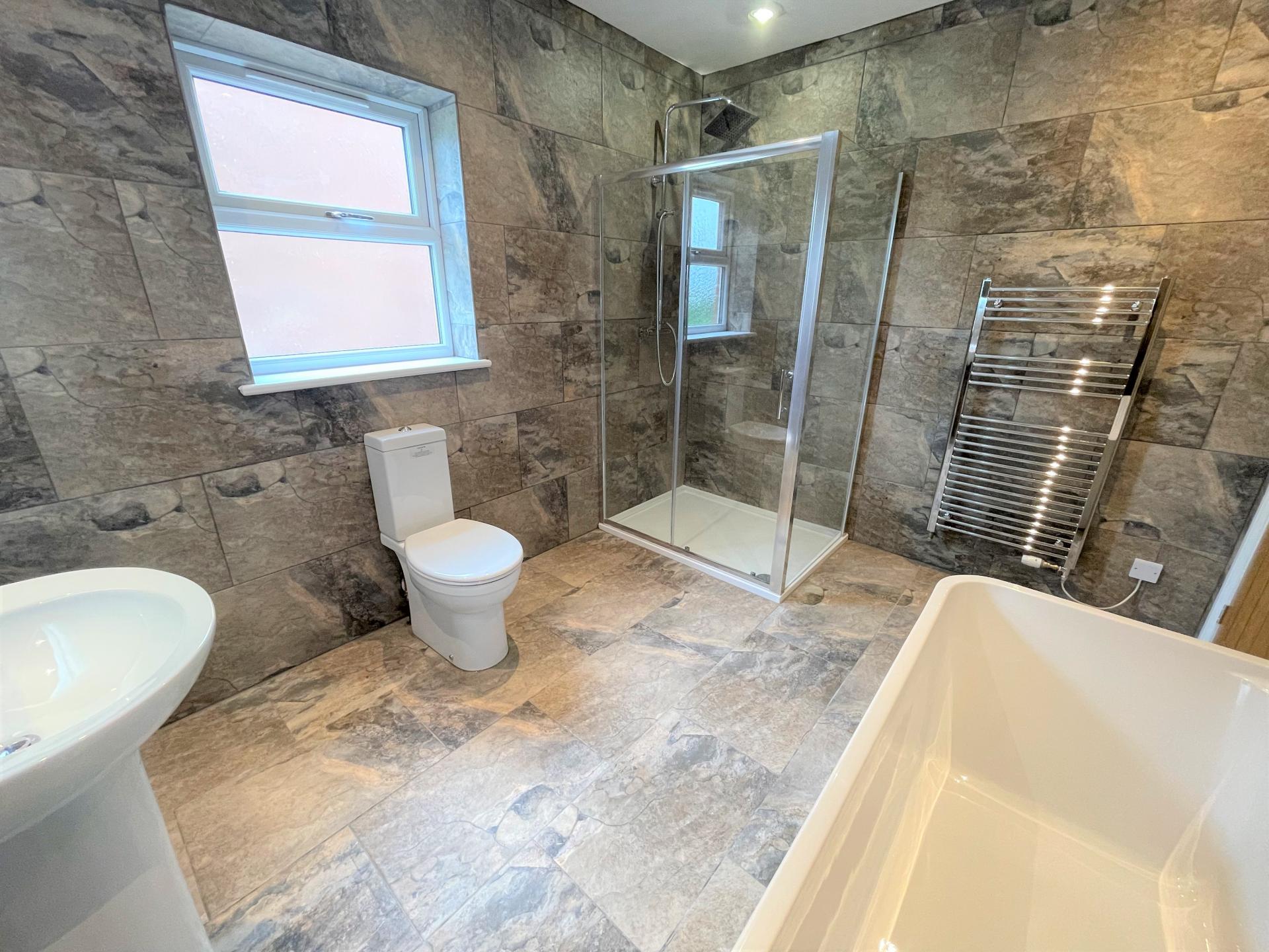 There is a side door to the property into the utility area, and from here there is a door back to the kitchen, and another door to a large luxurious downstairs shower room.