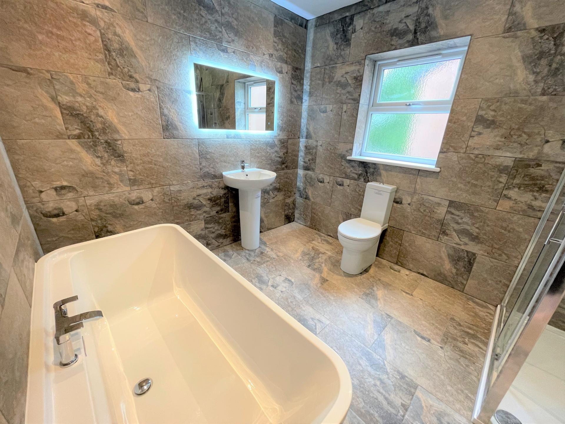 The family bathroom is extremely lavish; following the existing theme of the grey wall and floor tiles, underfloor heating, this is a truly exceptional space.