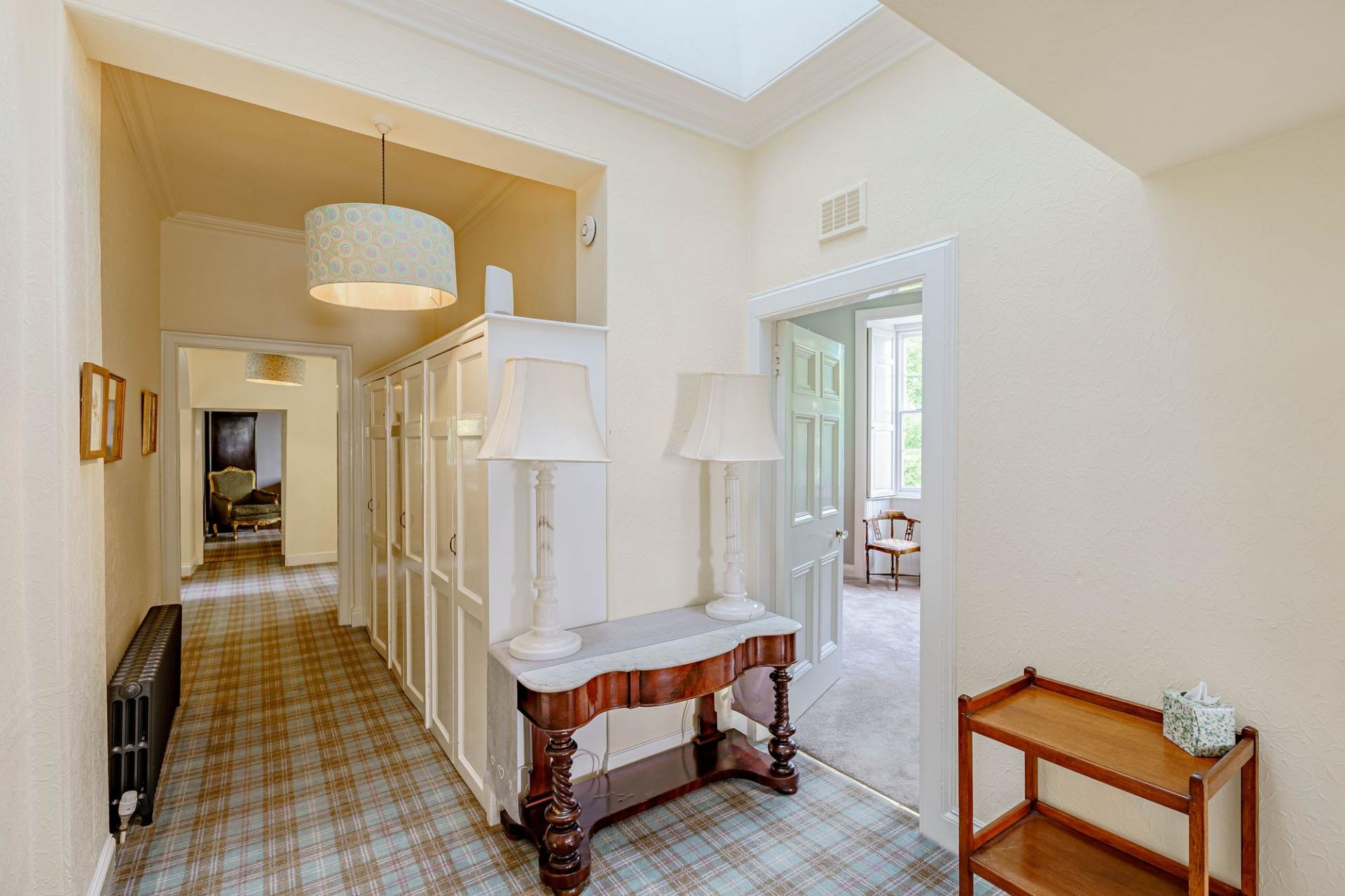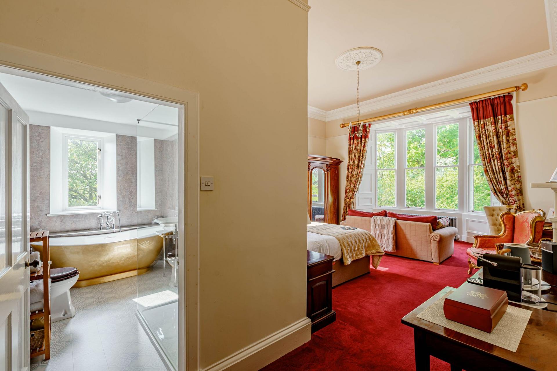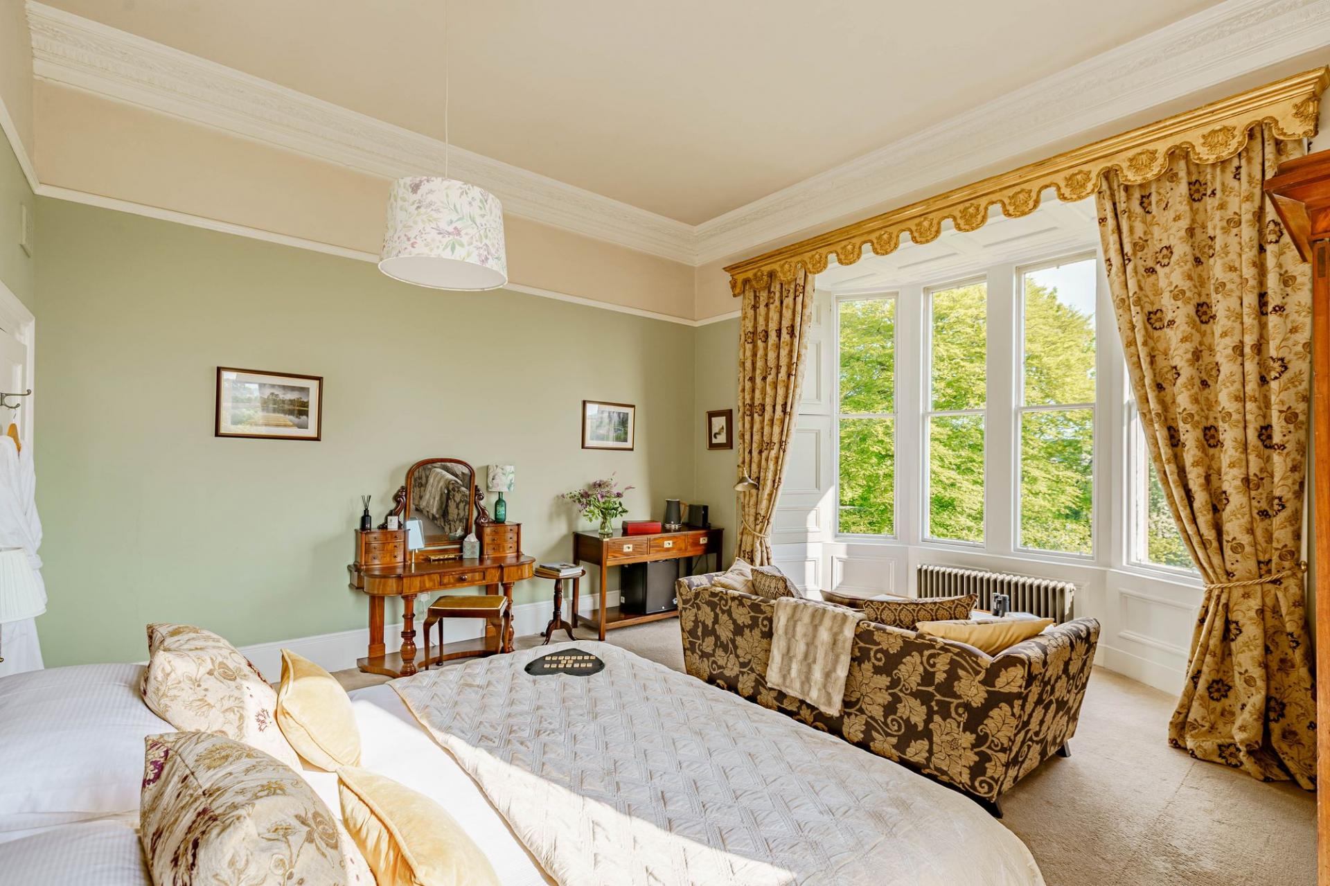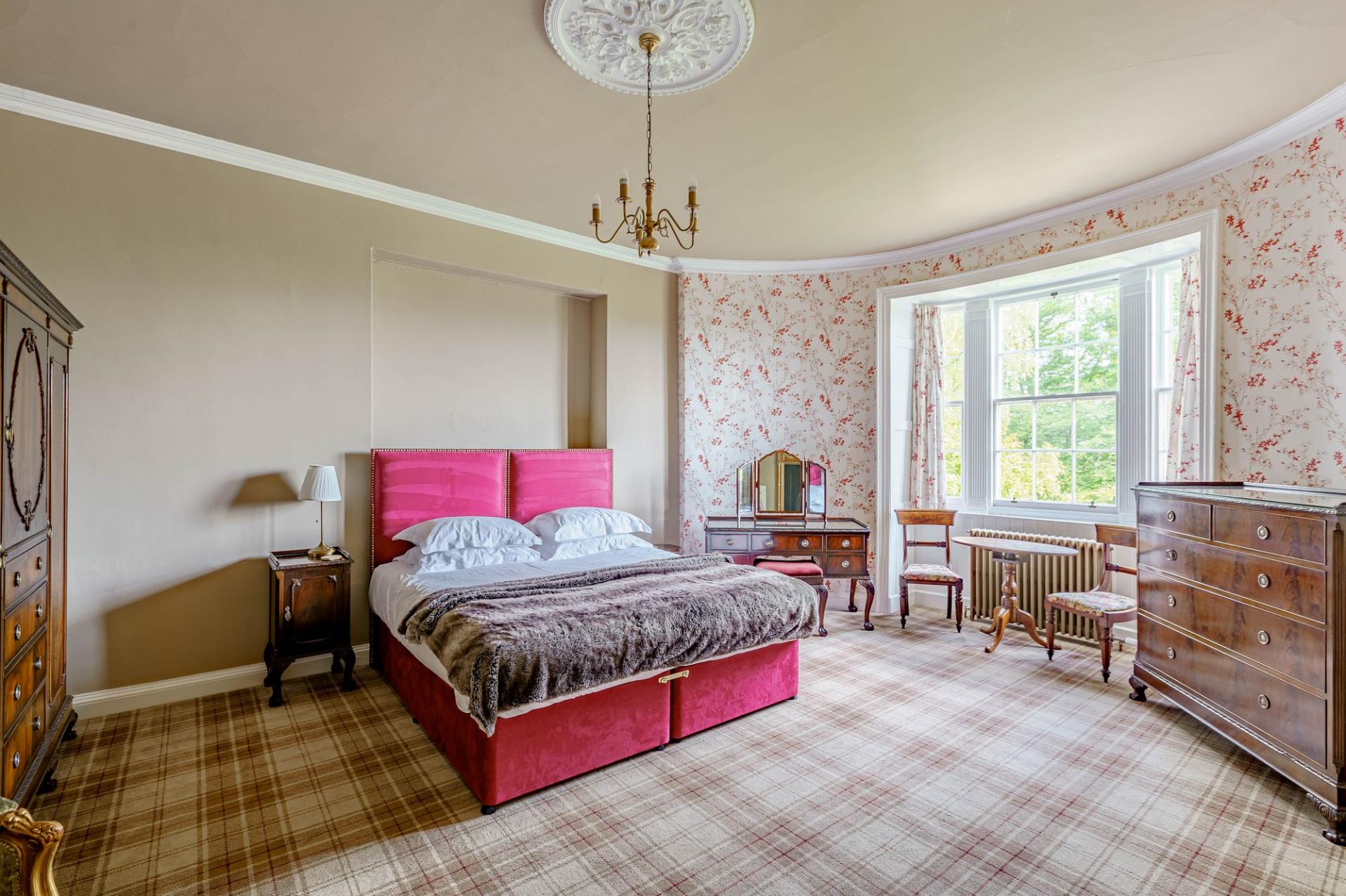 As you ascend the stairs there is a cosy reading nook at half landing level, with built-in bookshelves. On the first floor, six double bedrooms can be found (two with ensuite bathrooms), along with the family shower room. The two principal suites boast fabulous views either over the lawn, field and Lowther hills, or over the River Nith to Tynron Doon and the Nithsdale Valley beyond, and they feature superb, contemporary ensuite bathrooms with freestanding baths, large walk-in shower with rainhead attachments and high quality sanitaryware. Two of the rooms feature lovely bow-ended walls with far reaching views and the remaining two bedrooms offer views over the front lawns and field. The shower room is modern yet traditional, in keeping with the history of the building, and comprises a large walk-in shower with rainhead shower attachment, WC and wash hand basin.