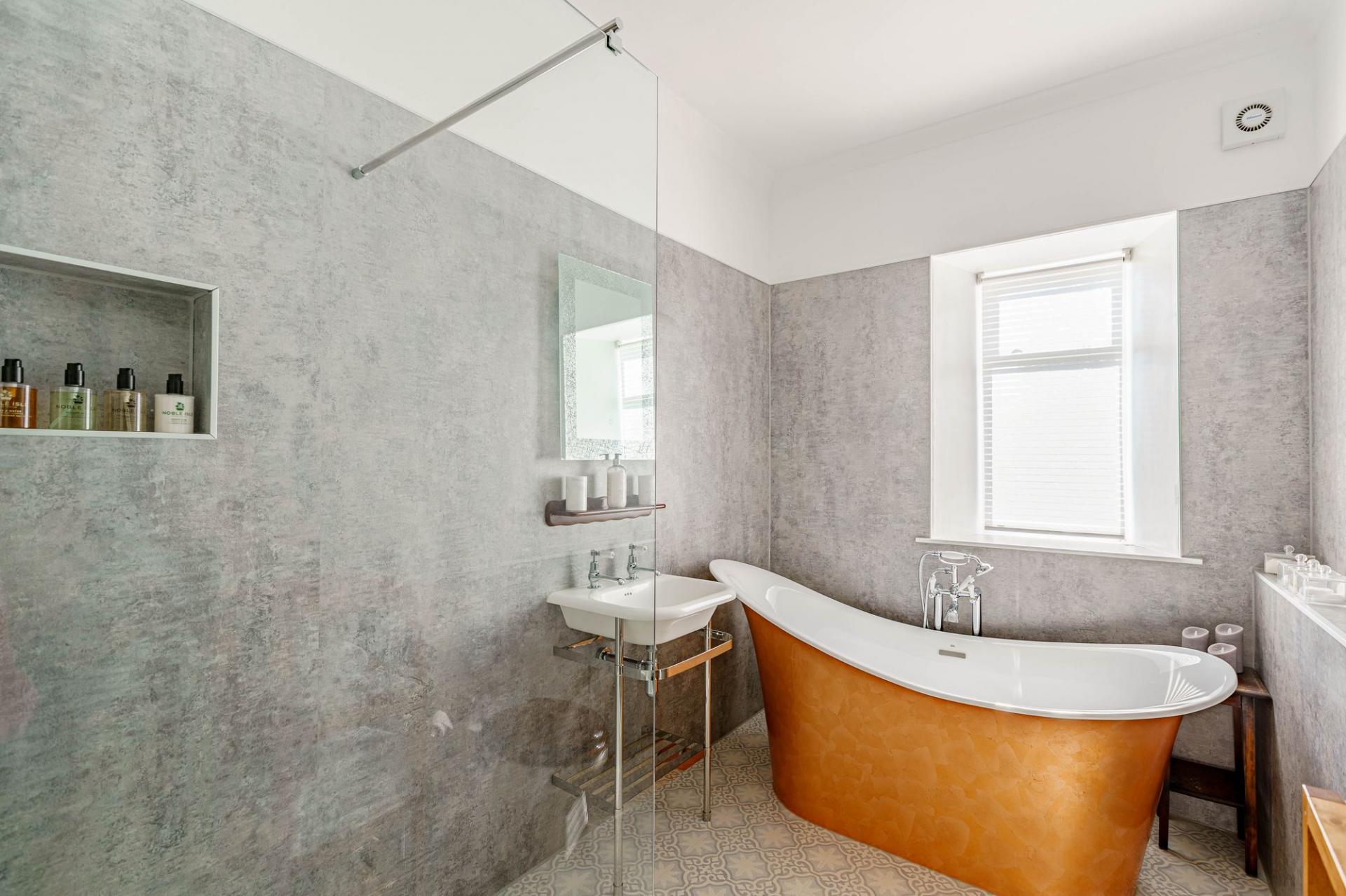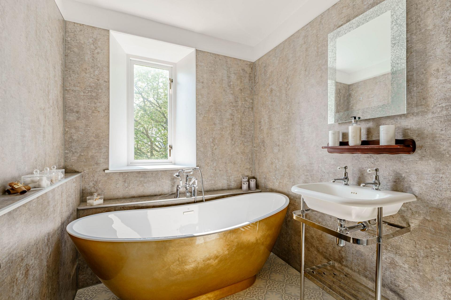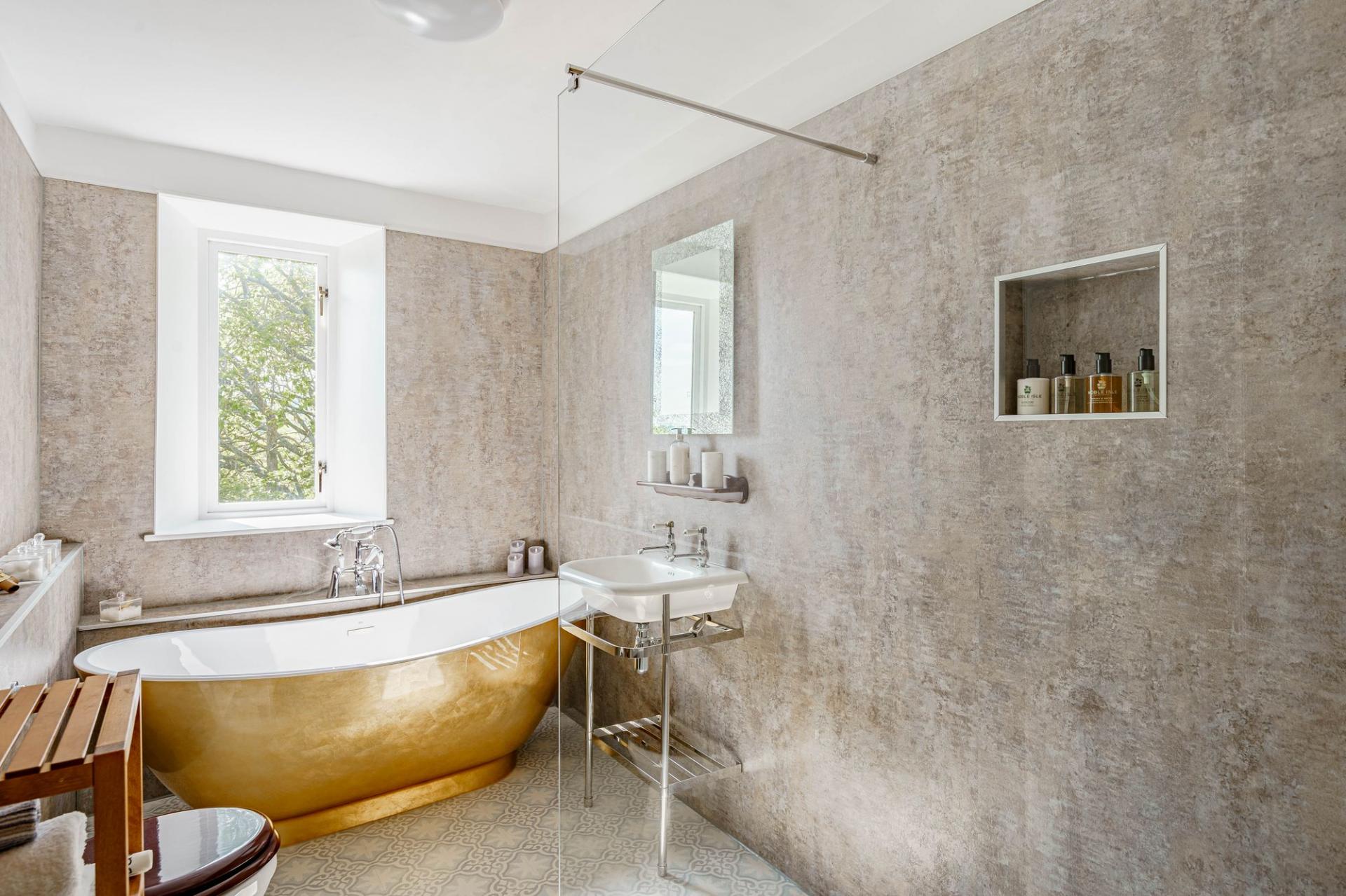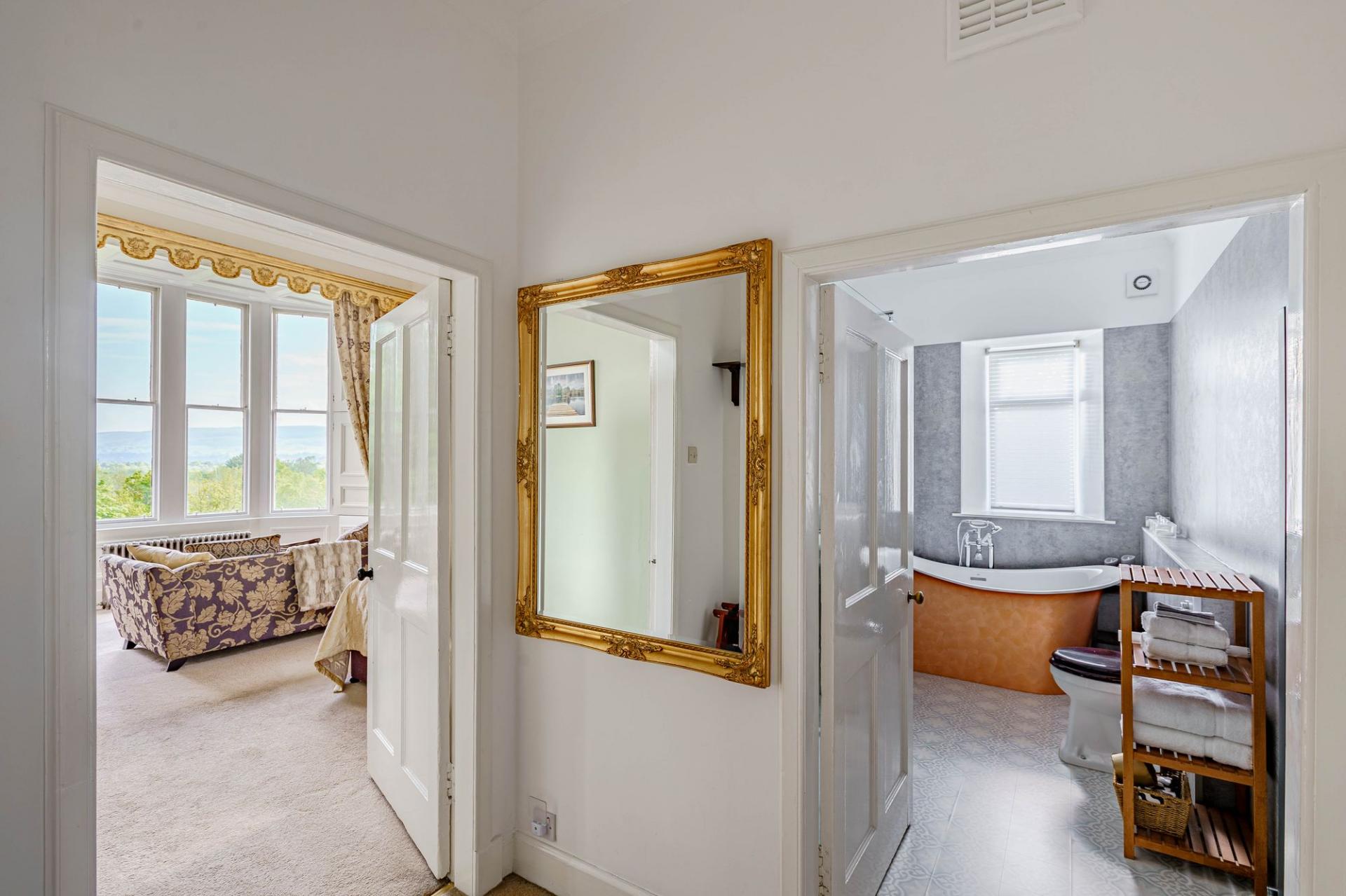 As you ascend the stairs there is a cosy reading nook at half landing level, with built-in bookshelves. On the first floor, six double bedrooms can be found (two with ensuite bathrooms), along with the family shower room. The two principal suites boast fabulous views either over the lawn, field and Lowther hills, or over the River Nith to Tynron Doon and the Nithsdale Valley beyond, and they feature superb, contemporary ensuite bathrooms with freestanding baths, large walk-in shower with rainhead attachments and high quality sanitaryware. Two of the rooms feature lovely bow-ended walls with far reaching views and the remaining two bedrooms offer views over the front lawns and field. The shower room is modern yet traditional, in keeping with the history of the building, and comprises a large walk-in shower with rainhead shower attachment, WC and wash hand basin.