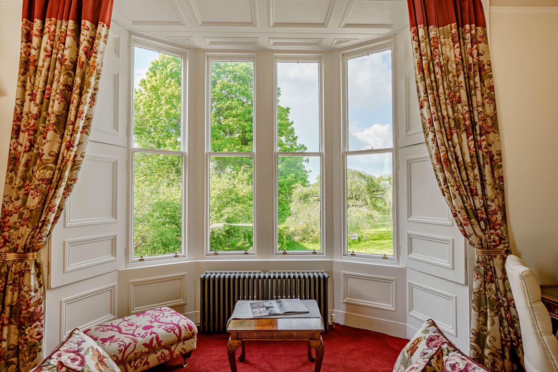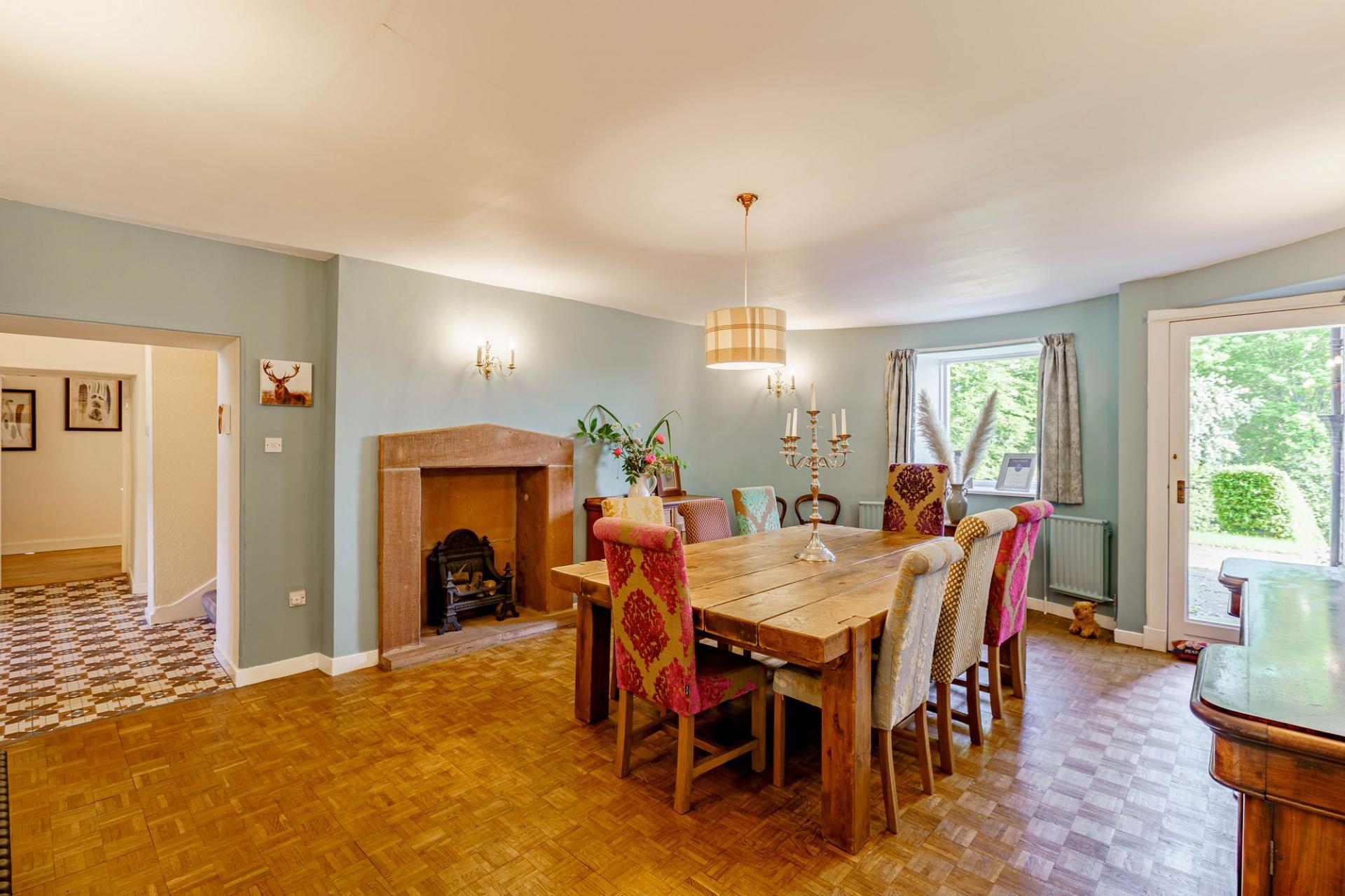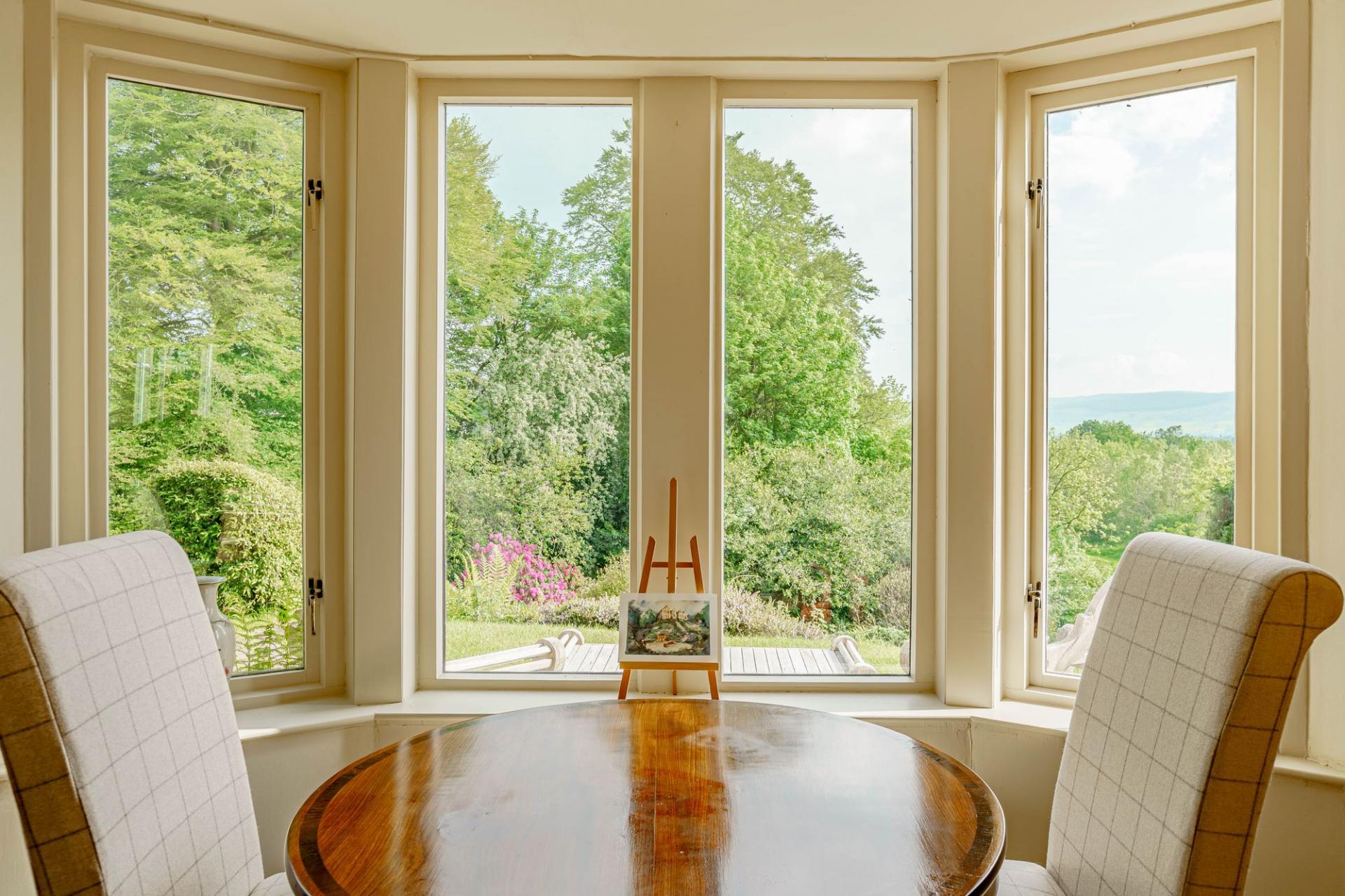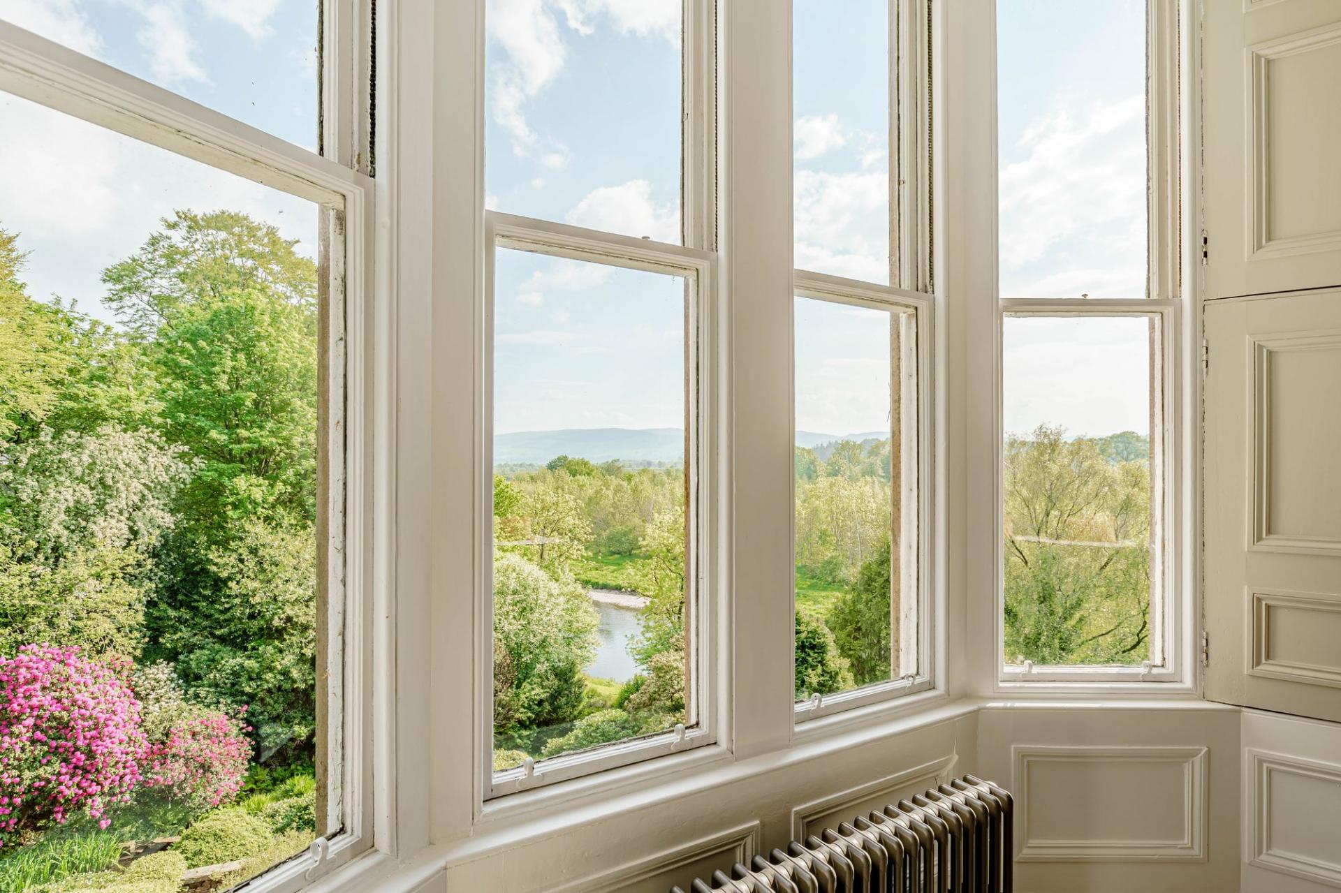 There are three reception rooms on the ground floor. The dining room is another lovely bow-ended room, with parquet floor, a sandstone fireplace and a glazed door leading out to the terrace and garden. This room leads through to the drawing room, which is a bright and spacious room with bay window and additional large window to the side elevation, giving impressive views down to the river and beyond. There is a parquet floor and an open fire set in a stone surround. A door from the drawing room leads through to the billiard room, which is a flexible use room with windows to the front and side, and built-in window seat.
