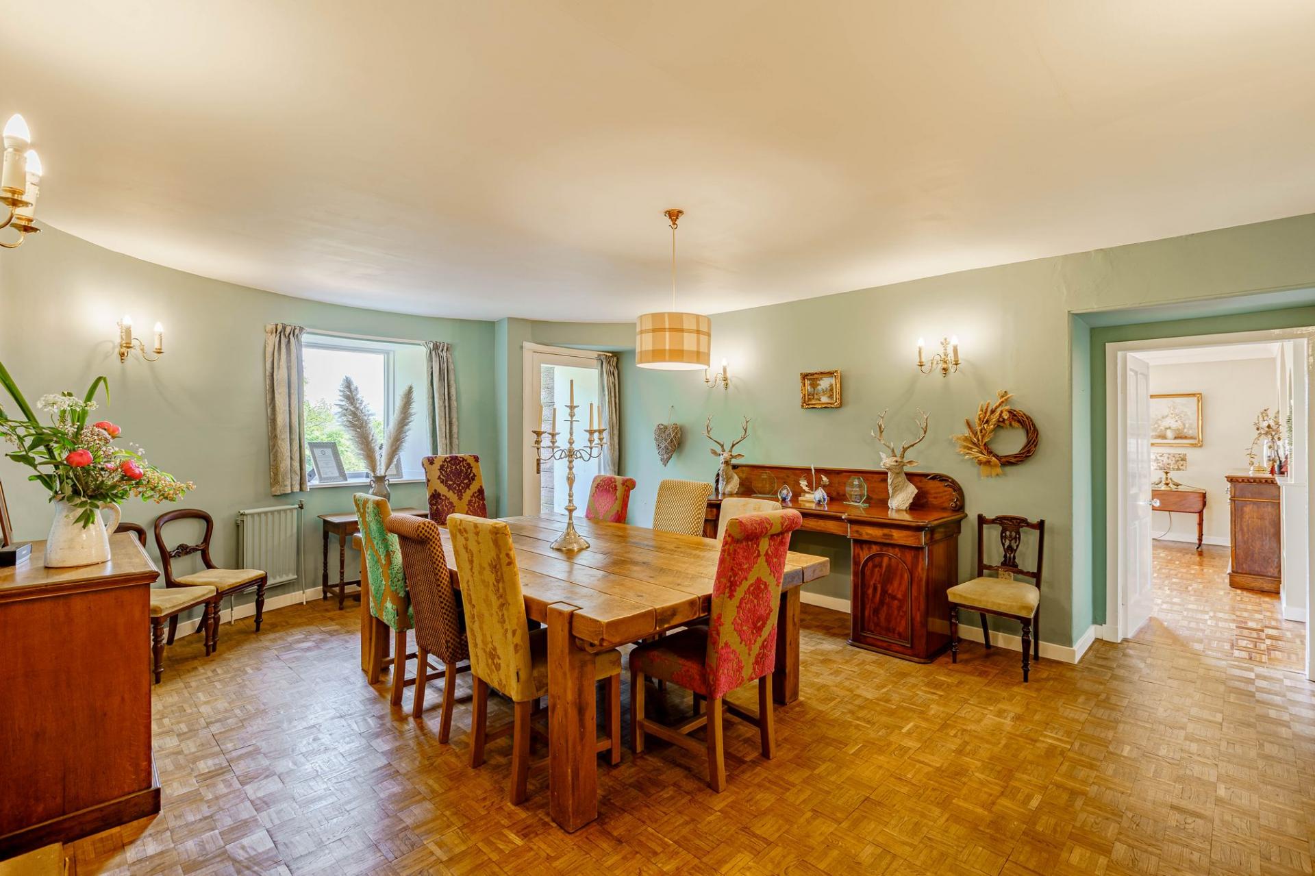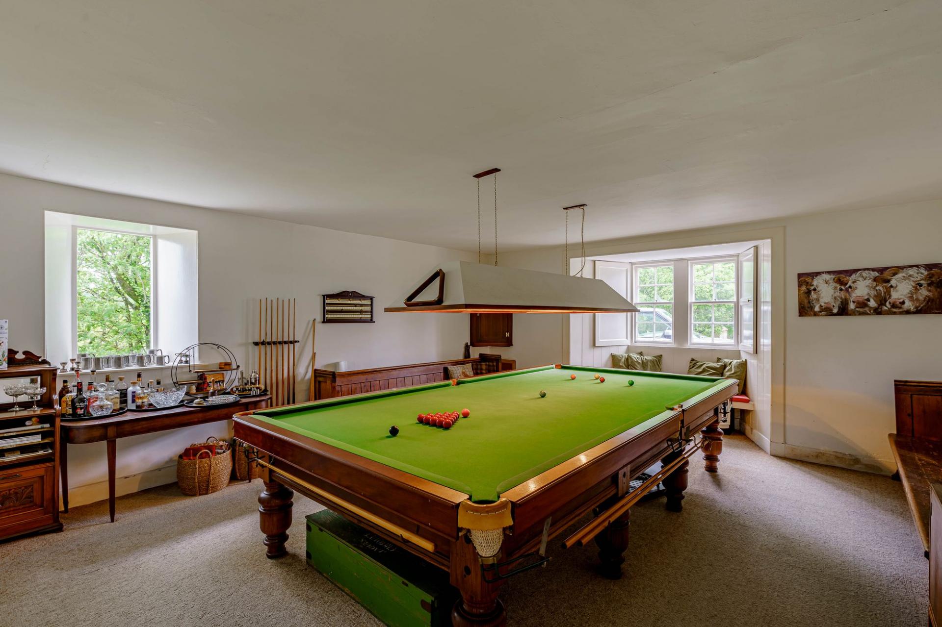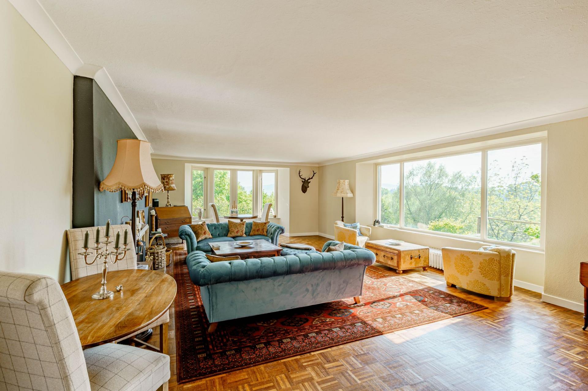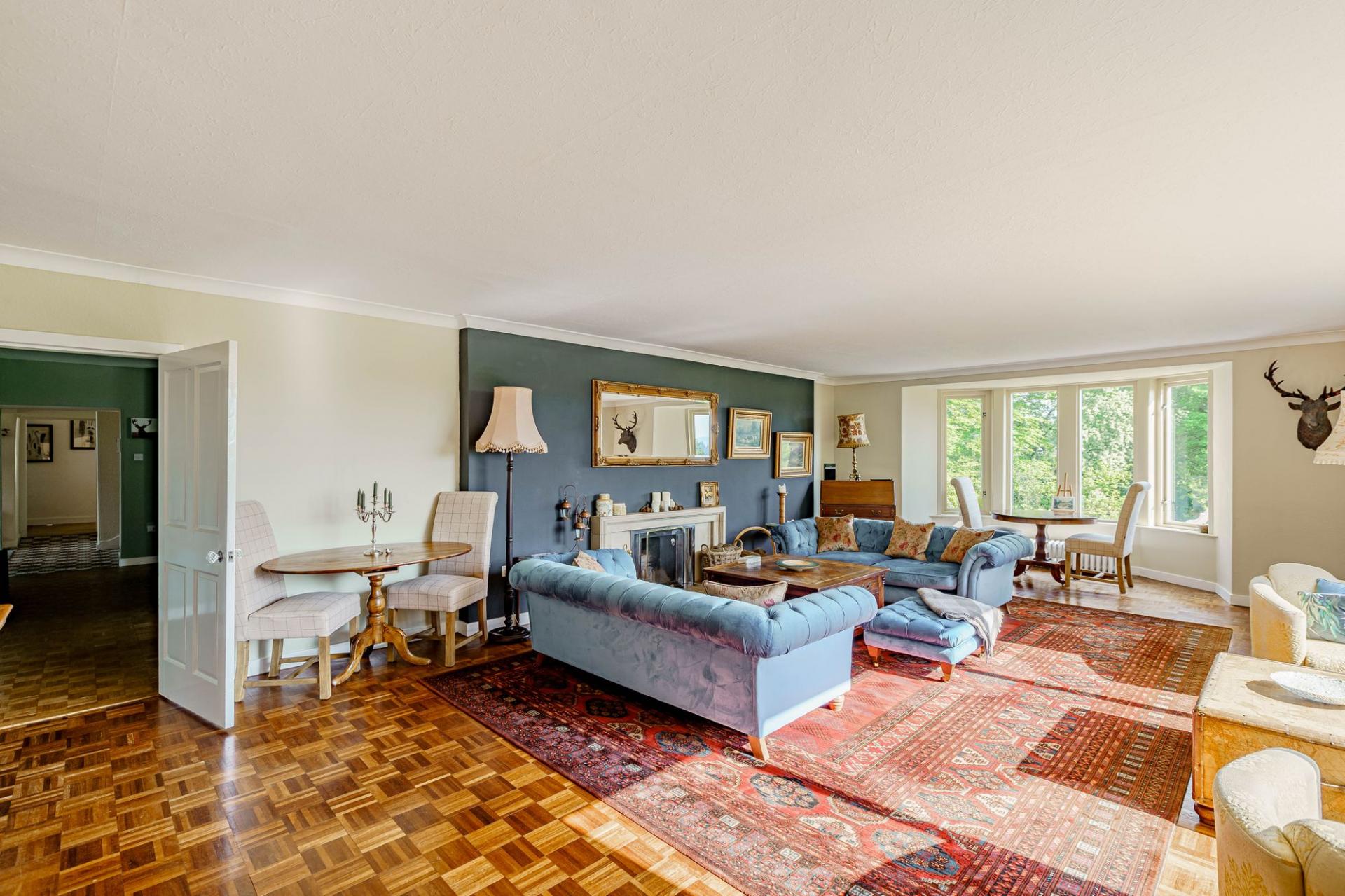 There are three reception rooms on the ground floor. The dining room is another lovely bow-ended room, with parquet floor, a sandstone fireplace and a glazed door leading out to the terrace and garden. This room leads through to the drawing room, which is a bright and spacious room with bay window and additional large window to the side elevation, giving impressive views down to the river and beyond. There is a parquet floor and an open fire set in a stone surround. A door from the drawing room leads through to the billiard room, which is a flexible use room with windows to the front and side, and built-in window seat.