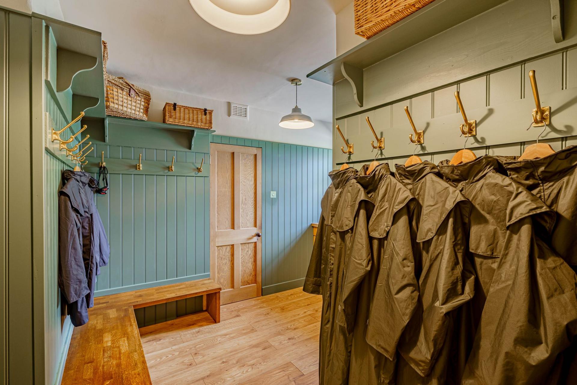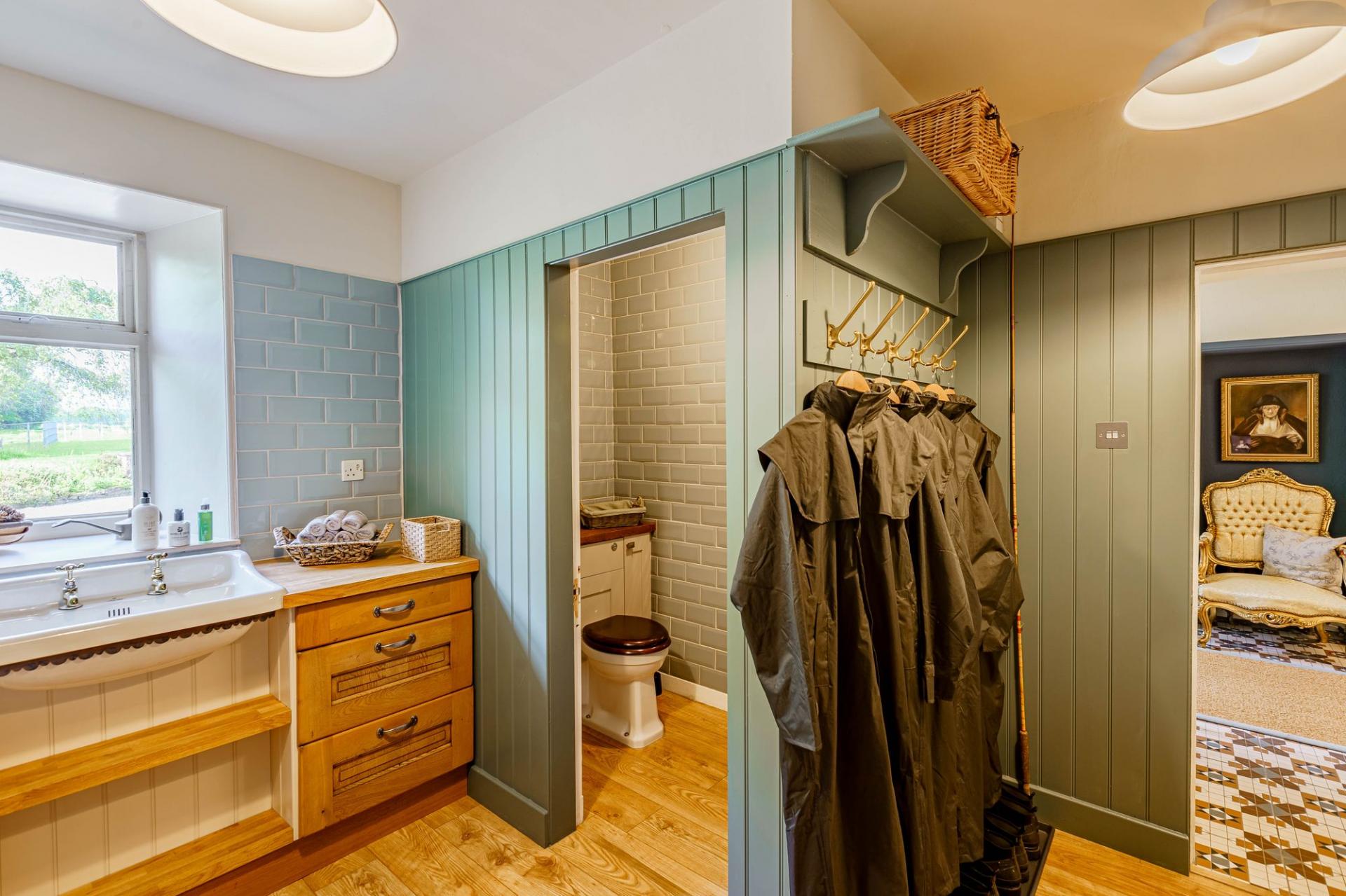 Double doors open into the vestibule, where glazed inner doors lead into the hall. Off the hall is a stylish cloakroom/bootroom, with fitted storage, cloaks area and vanity unit. There is a laundry room and WC off.