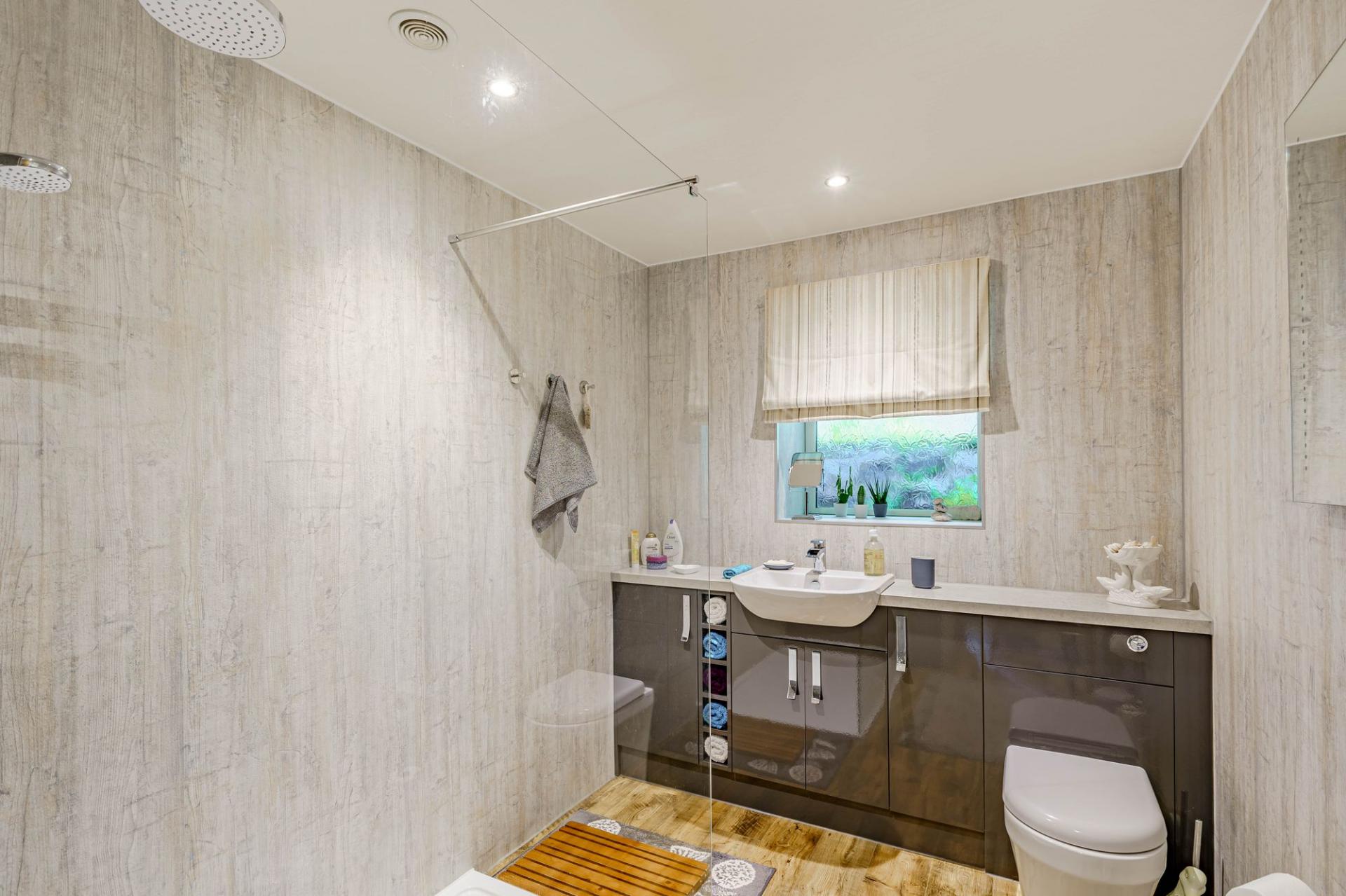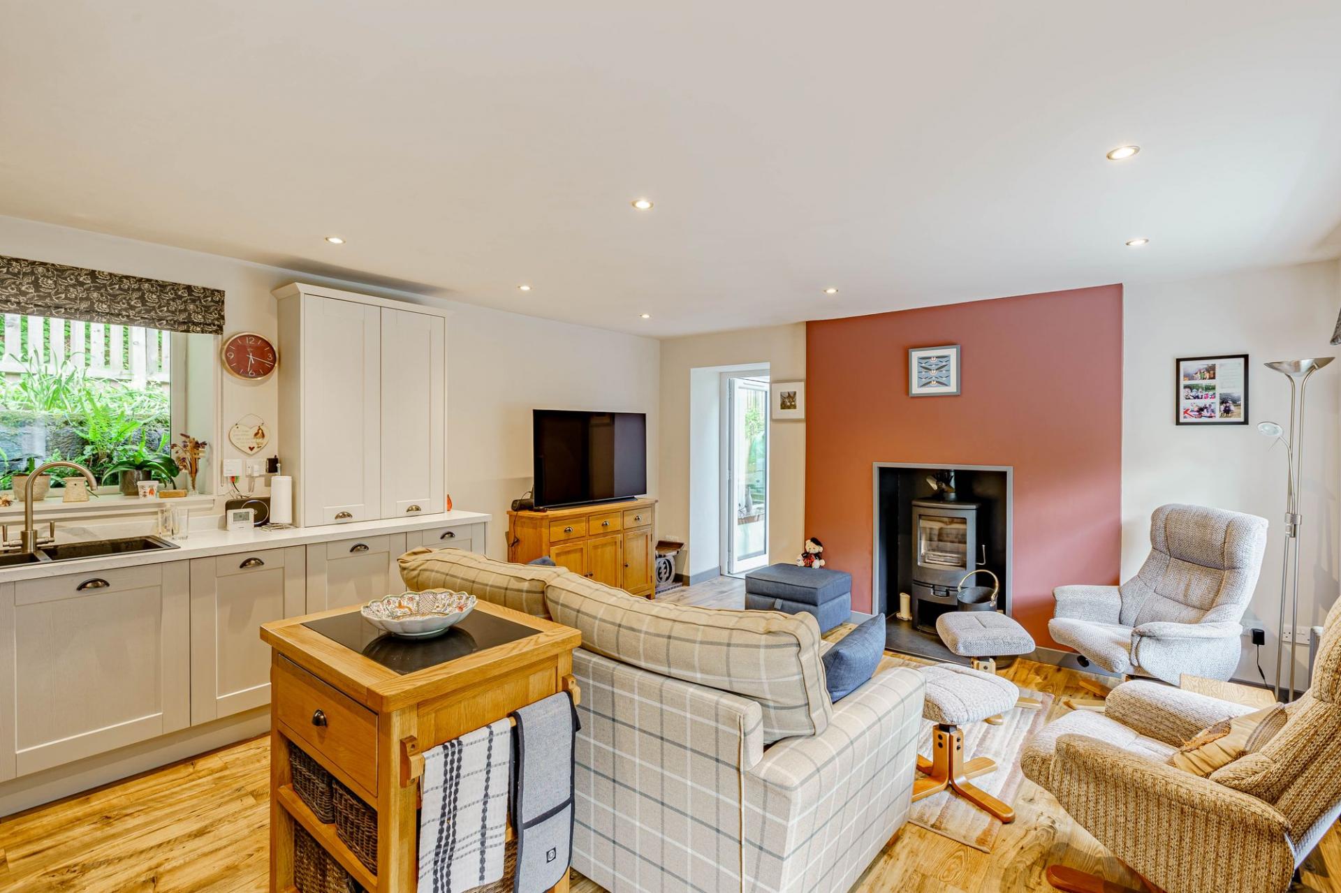 The property can be accessed via the front door or via the French doors to the conservatory. The hallway gives direct access to the bedroom, shower room and kitchen/living room and also has a cupboard housing the washing machine and controls for its air-source heating system. The kitchen area comprises an excellent range of modern fitted units with sink, integrated slimline dishwasher and integrated fridge/freezer. There is also an electric range cooker. Windows look out to the garden, and there is a modern multifuel stove to the living area. A glazed door leads through to the dining conservatory, which is glazed on three elevations and has direct garden access. The double bedroom is generous in size and there is a modern shower room, with large walk-in shower, WC and a wash hand basin set into a vanity unit.