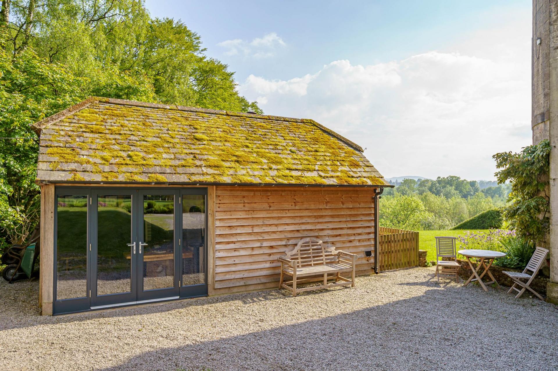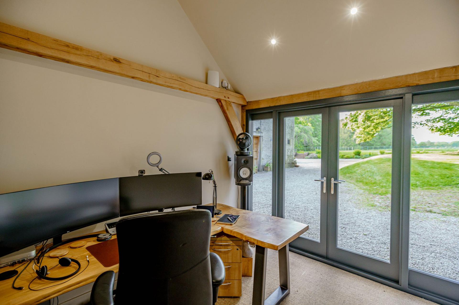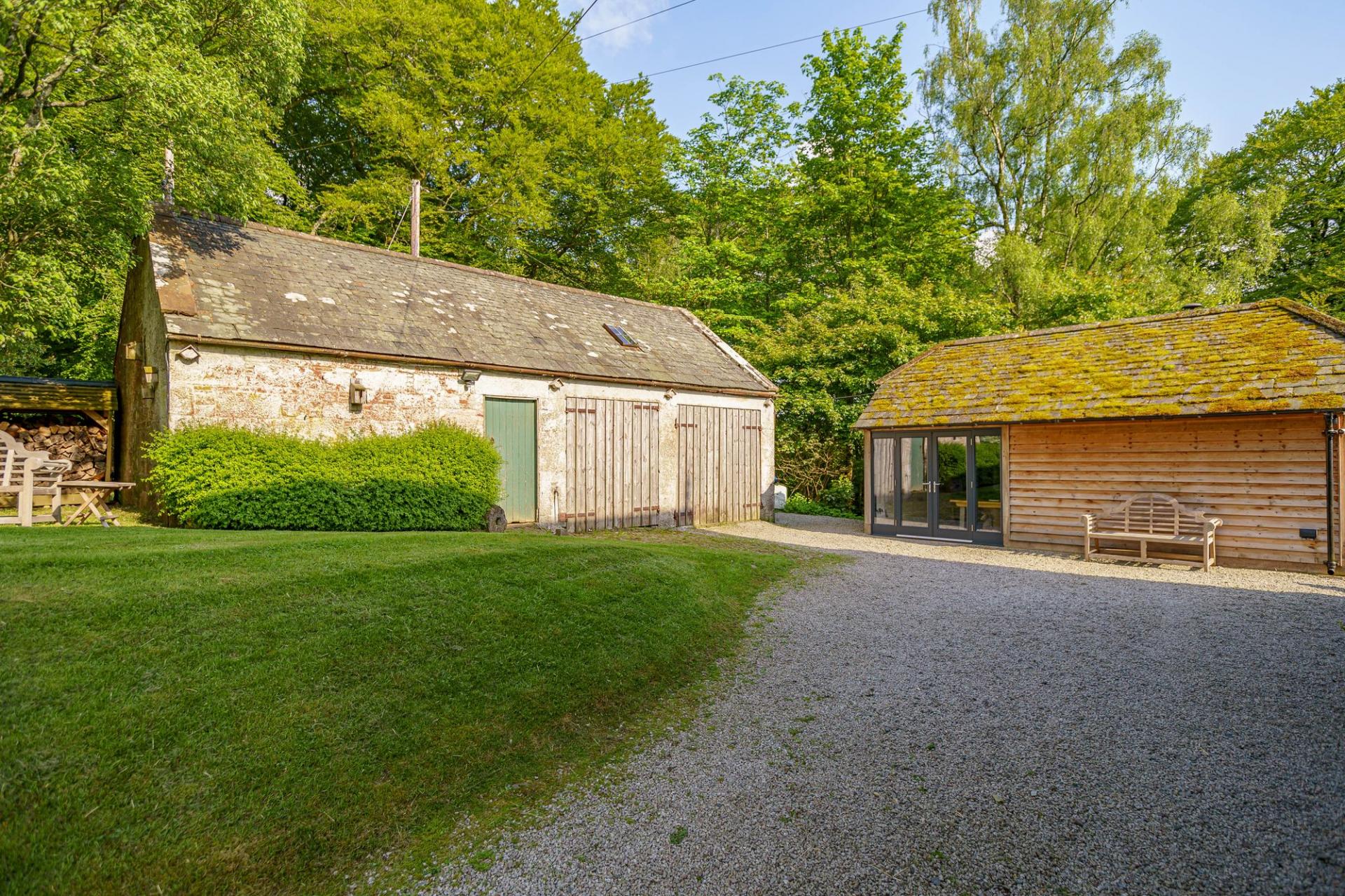 A newly constructed, timber clad oak frame barn with Burlington slate roof. This delightful building offers an insulated home office space with French doors to the courtyard, and houses the biomass boiler and a wood pellet store.