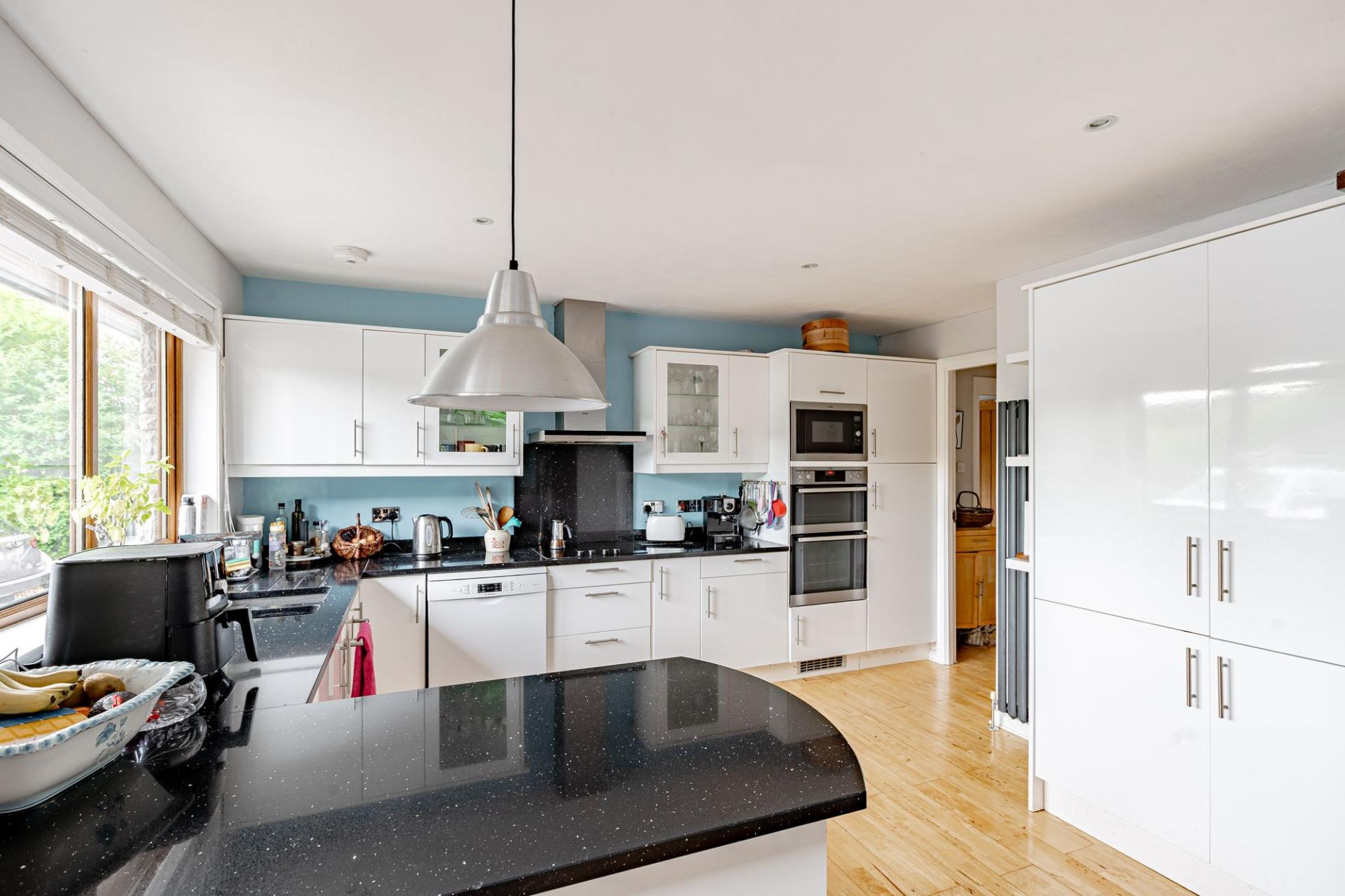 The sunny kitchen/breakfast room boasts two large windows to the front elevation, lovely views and an attractive solid wood floor. There is an excellent range of white gloss units with granite worksurfaces and a breakfast bar, 1 ½ bowl sink with mixer tap and integrated appliances include a microwave, double oven, electric hob with extractor hood over, fridge freezer and an additional full freezer.