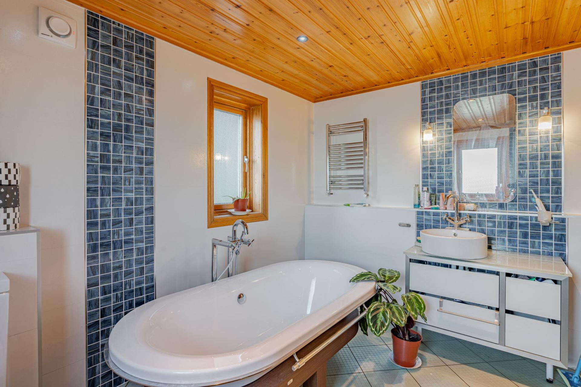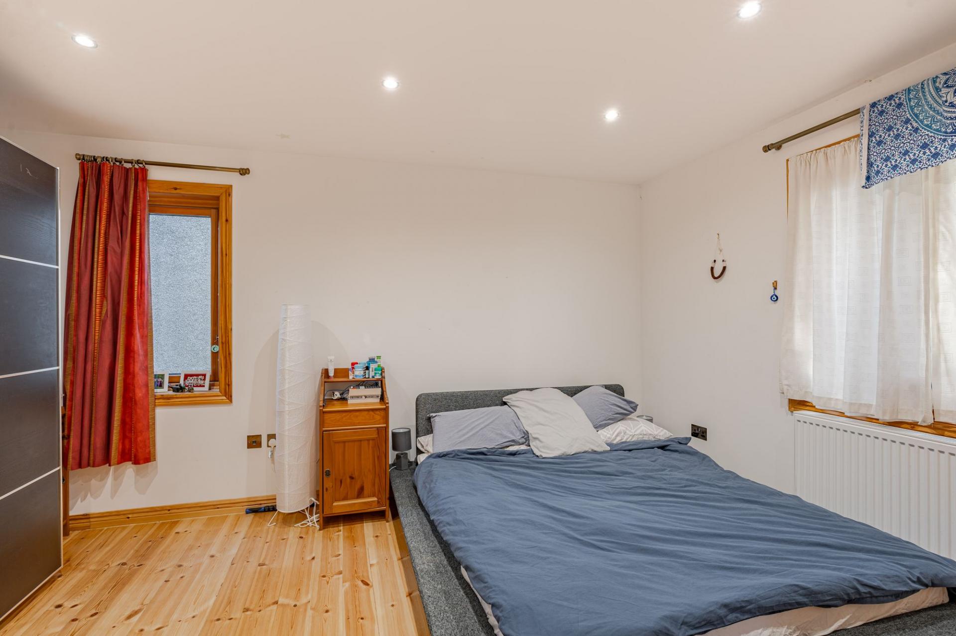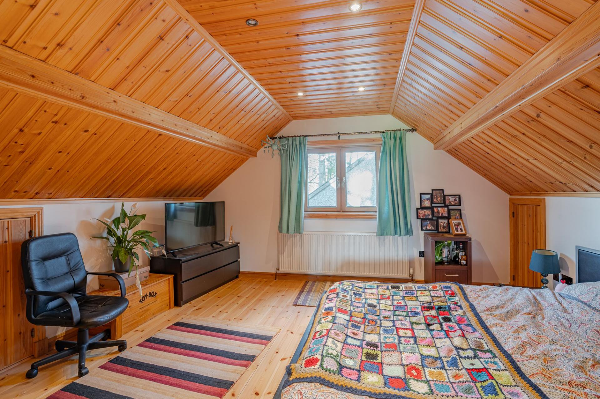 The bespoke staircase rises to a bright and spacious first floor landing, with sliding doors to a balcony. The first floor makes for a fantastic master suite if so desired, with useful home office (or perhaps a nursery/child’s bedroom) and a large principal bedroom with dressing room and views to the front over the loch, along with a contemporary bathroom, comprising a raised area with feature free standing bath, twin sinks and a roomy walk-in shower.