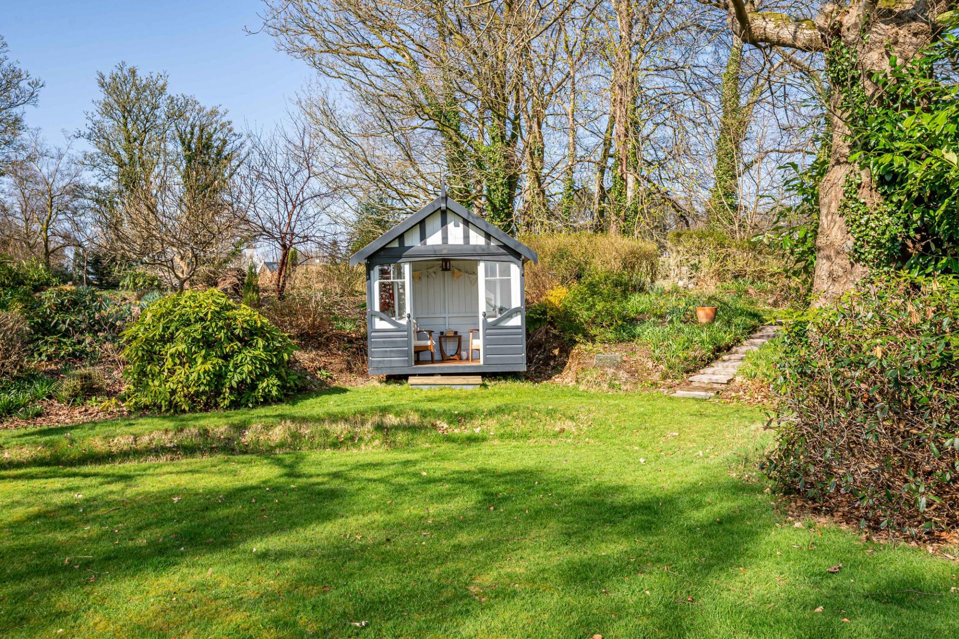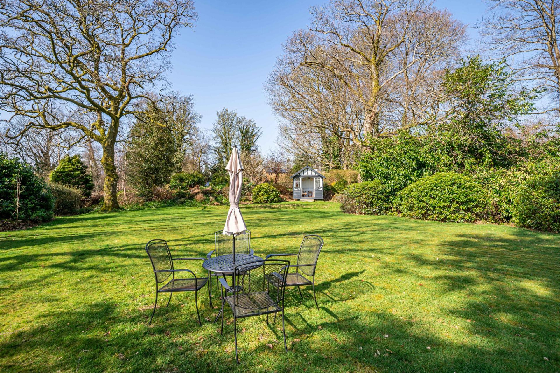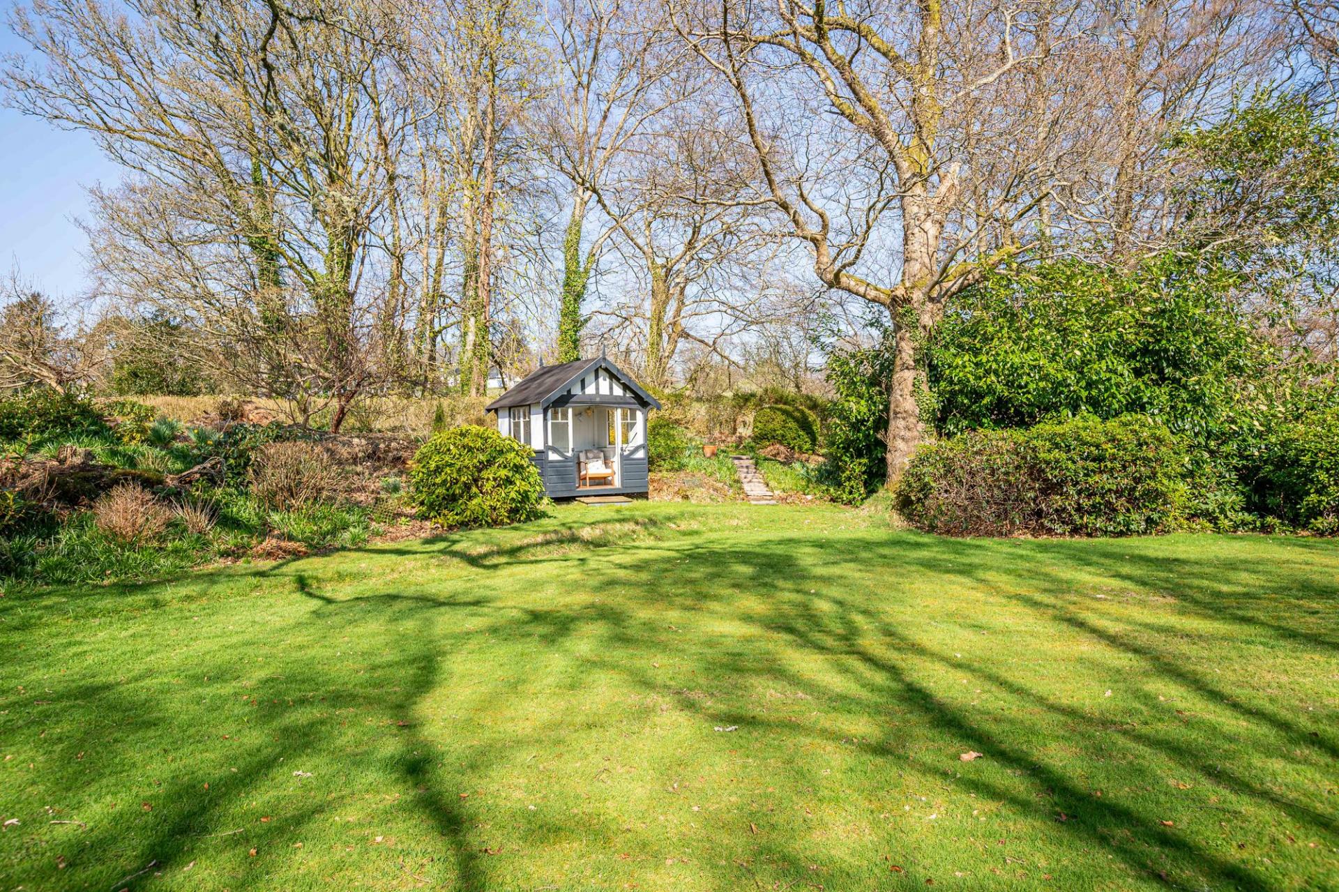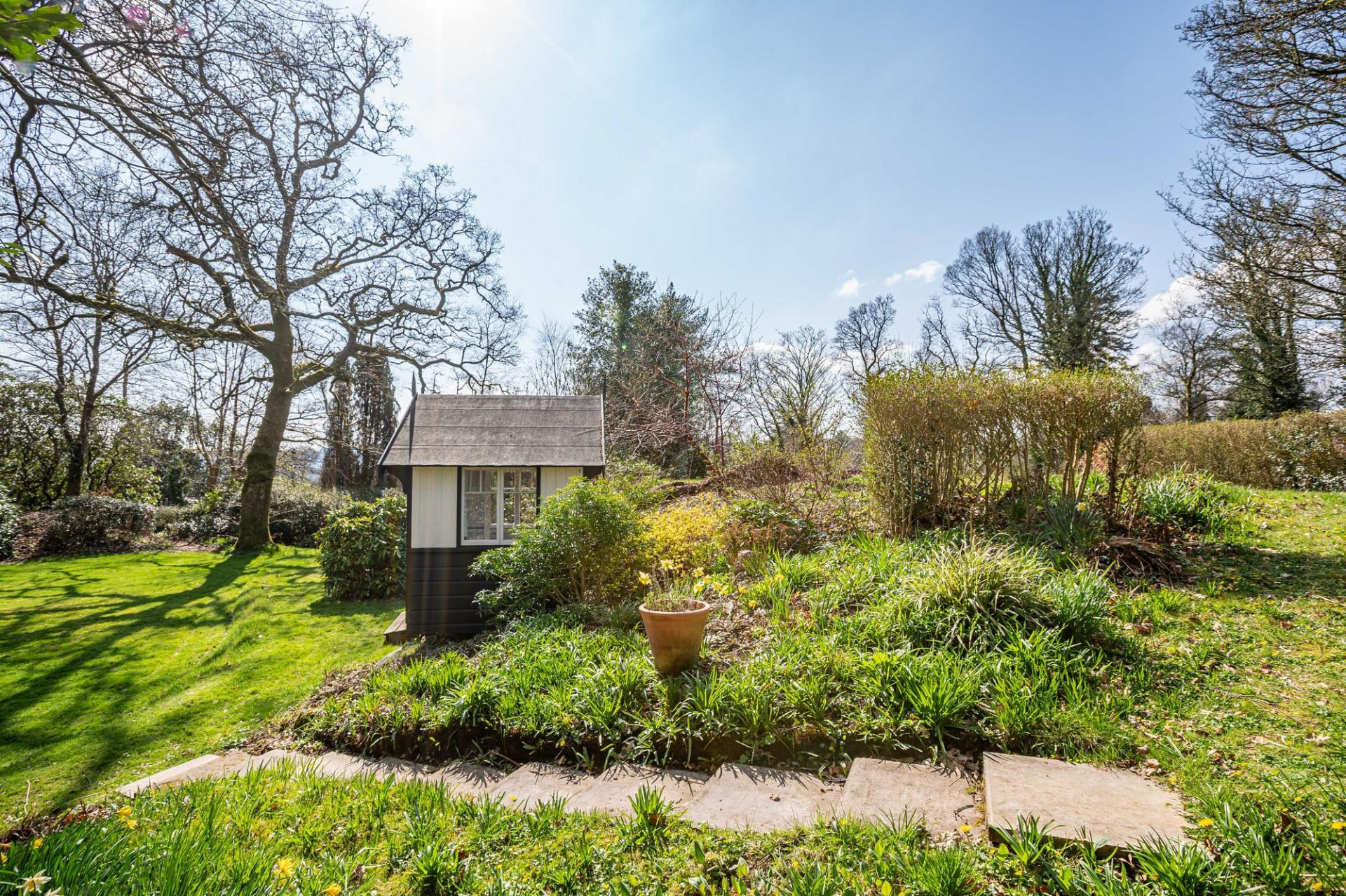 There are beautifully landscaped gardens that wrap around the property. Positioned on a sunny and slightly elevated site, the garden offers a high level of privacy. There are expanses of lawn, deep flower beds, mature shrubs and many rhododendrons that fill the garden with colour during the summer months. Paths meander around the grounds, which extend to just over 2.2 ac and includes a lovely area of woodland. There is a greenhouse, two external stores, and a wood store but the star feature of the garden is the charming summerhouse. This summerhouse is original to the property, originally made by Boulton & Paul, and has been fully restored by the present owners. It features a rotating base, ensuring that you can follow the sun as it moves around the garden.