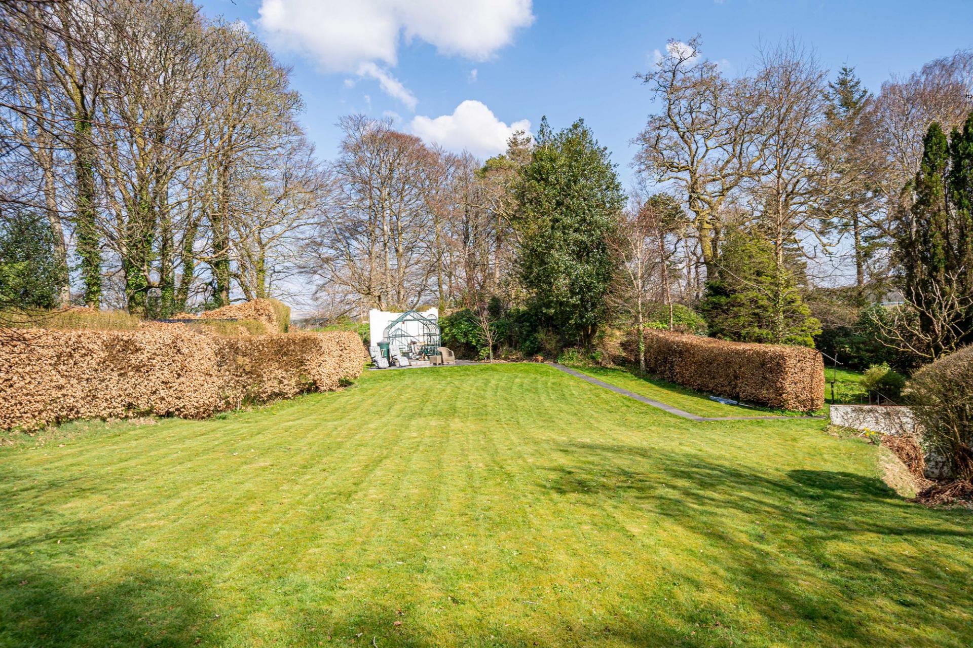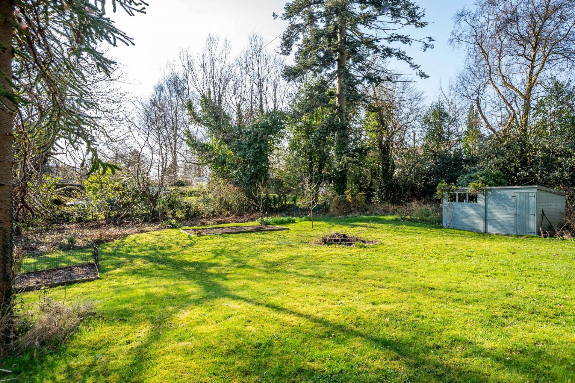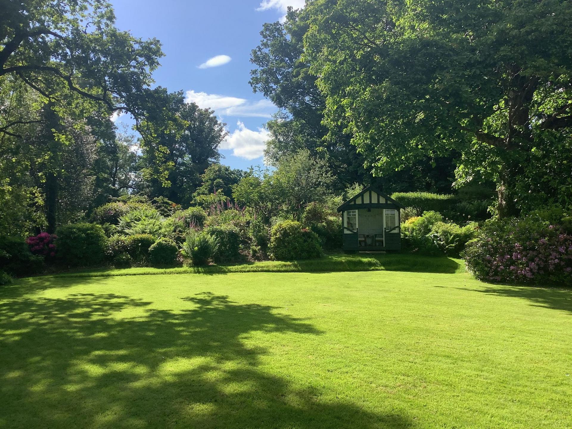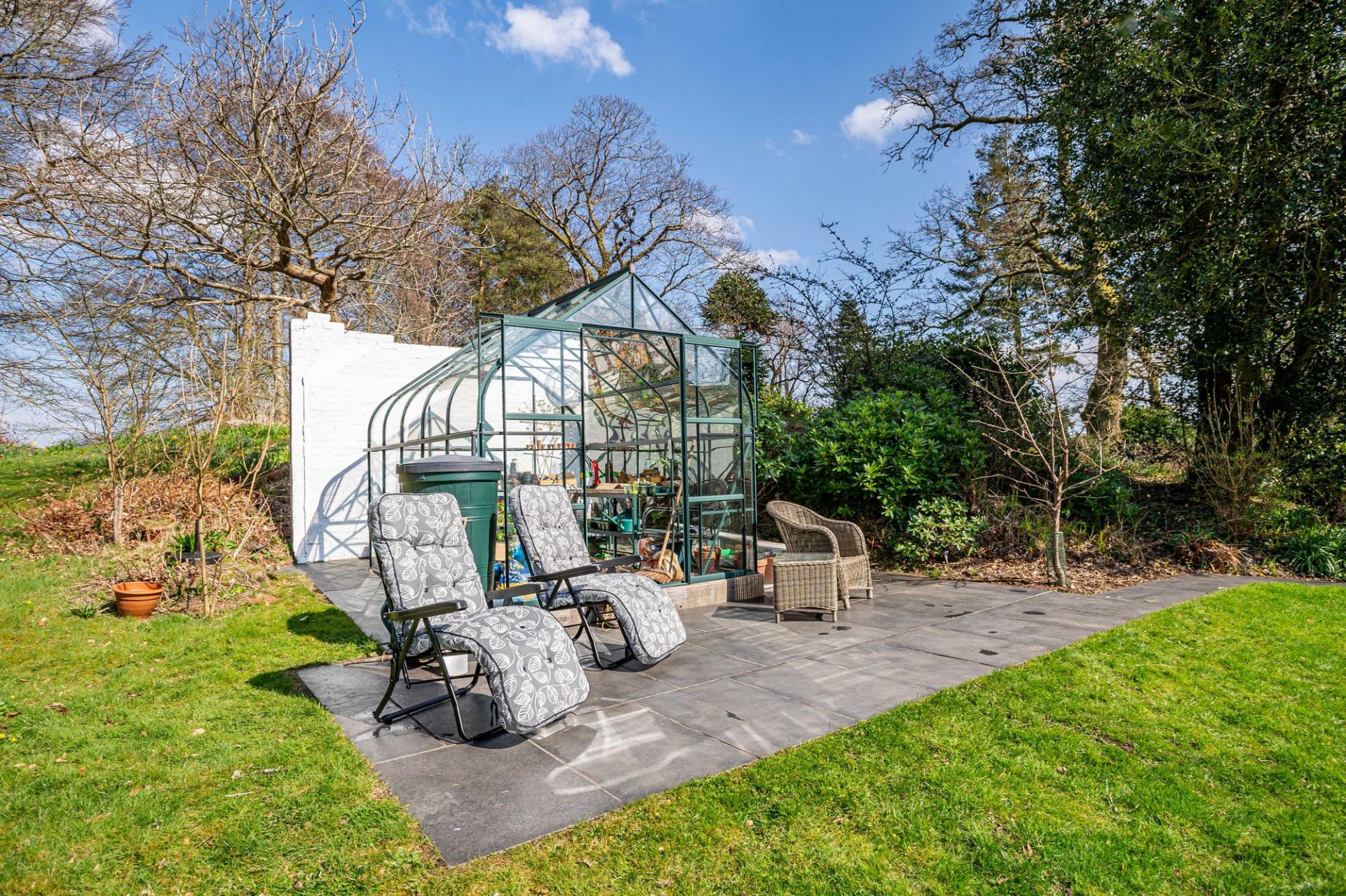 There are beautifully landscaped gardens that wrap around the property. Positioned on a sunny and slightly elevated site, the garden offers a high level of privacy. There are expanses of lawn, deep flower beds, mature shrubs and many rhododendrons that fill the garden with colour during the summer months. Paths meander around the grounds, which extend to just over 2.2 ac and includes a lovely area of woodland. There is a greenhouse, two external stores, and a wood store but the star feature of the garden is the charming summerhouse. This summerhouse is original to the property, originally made by Boulton & Paul, and has been fully restored by the present owners. It features a rotating base, ensuring that you can follow the sun as it moves around the garden.