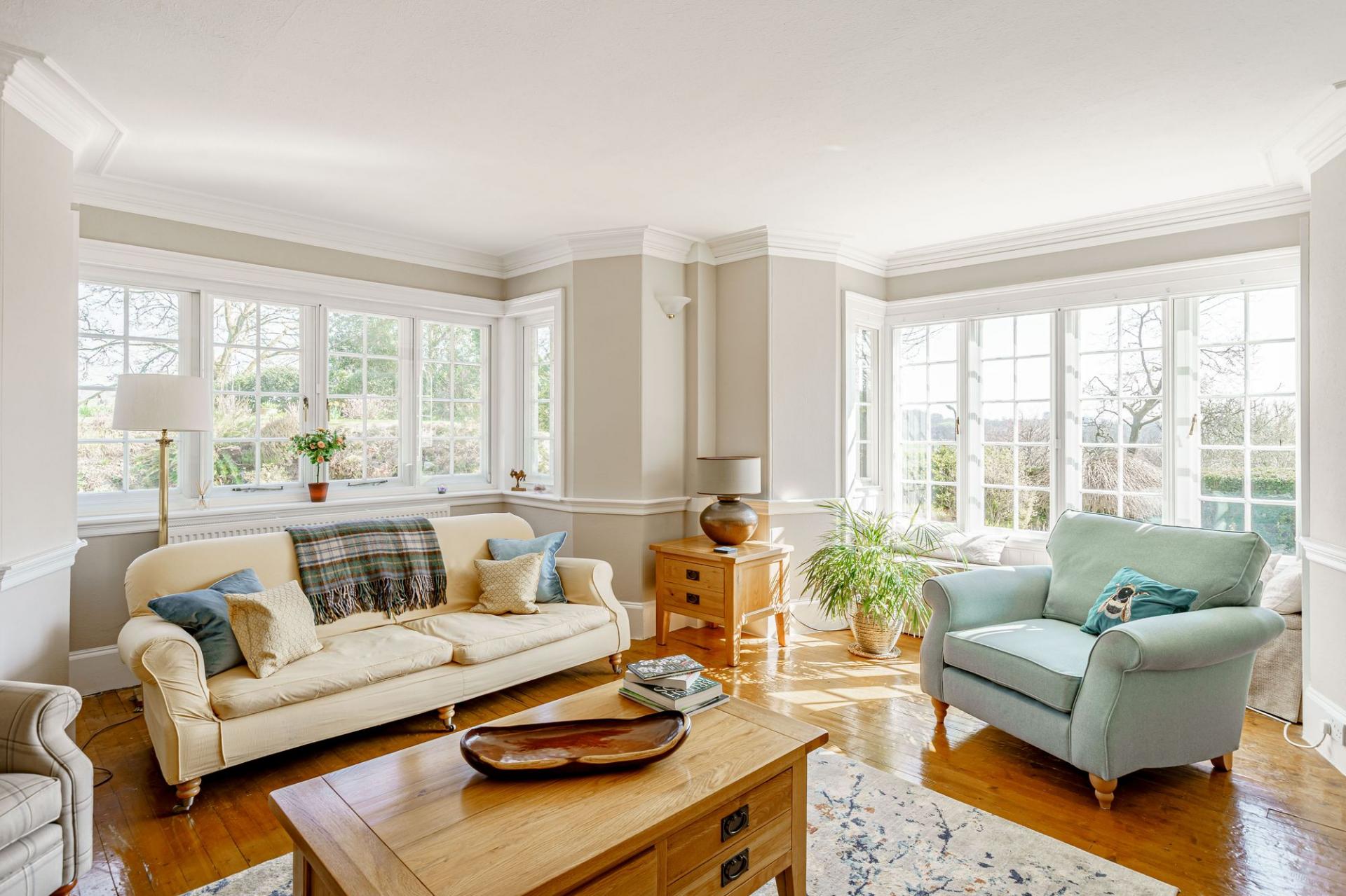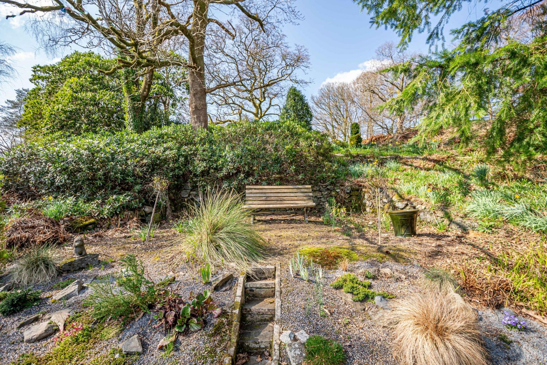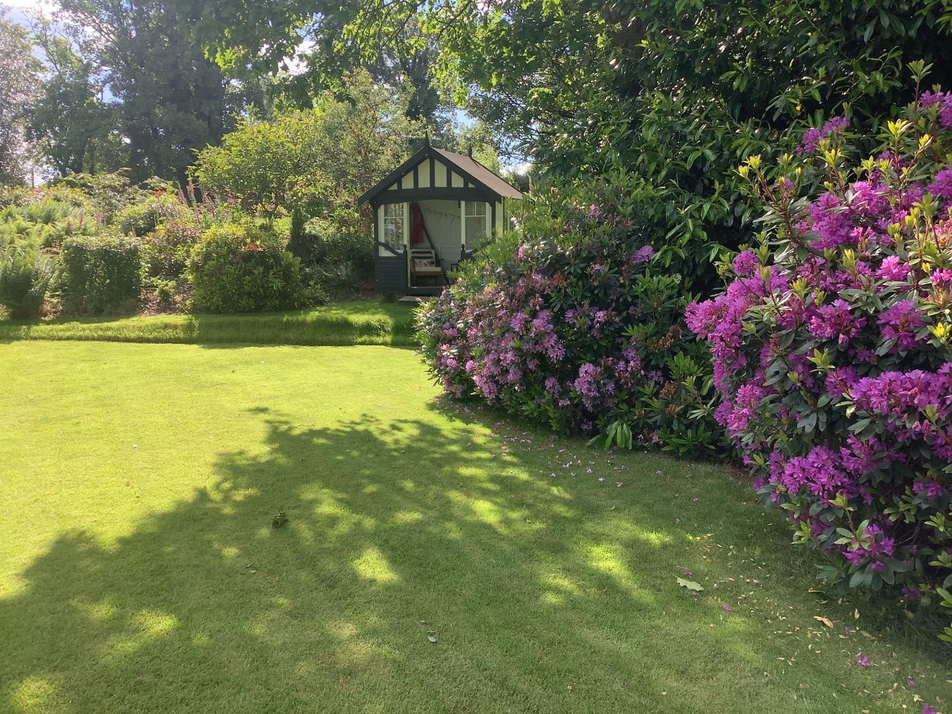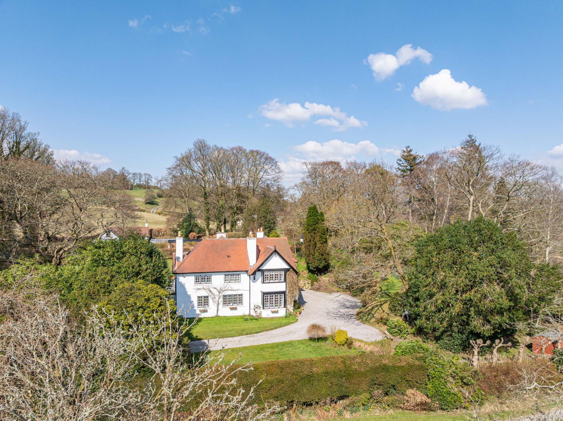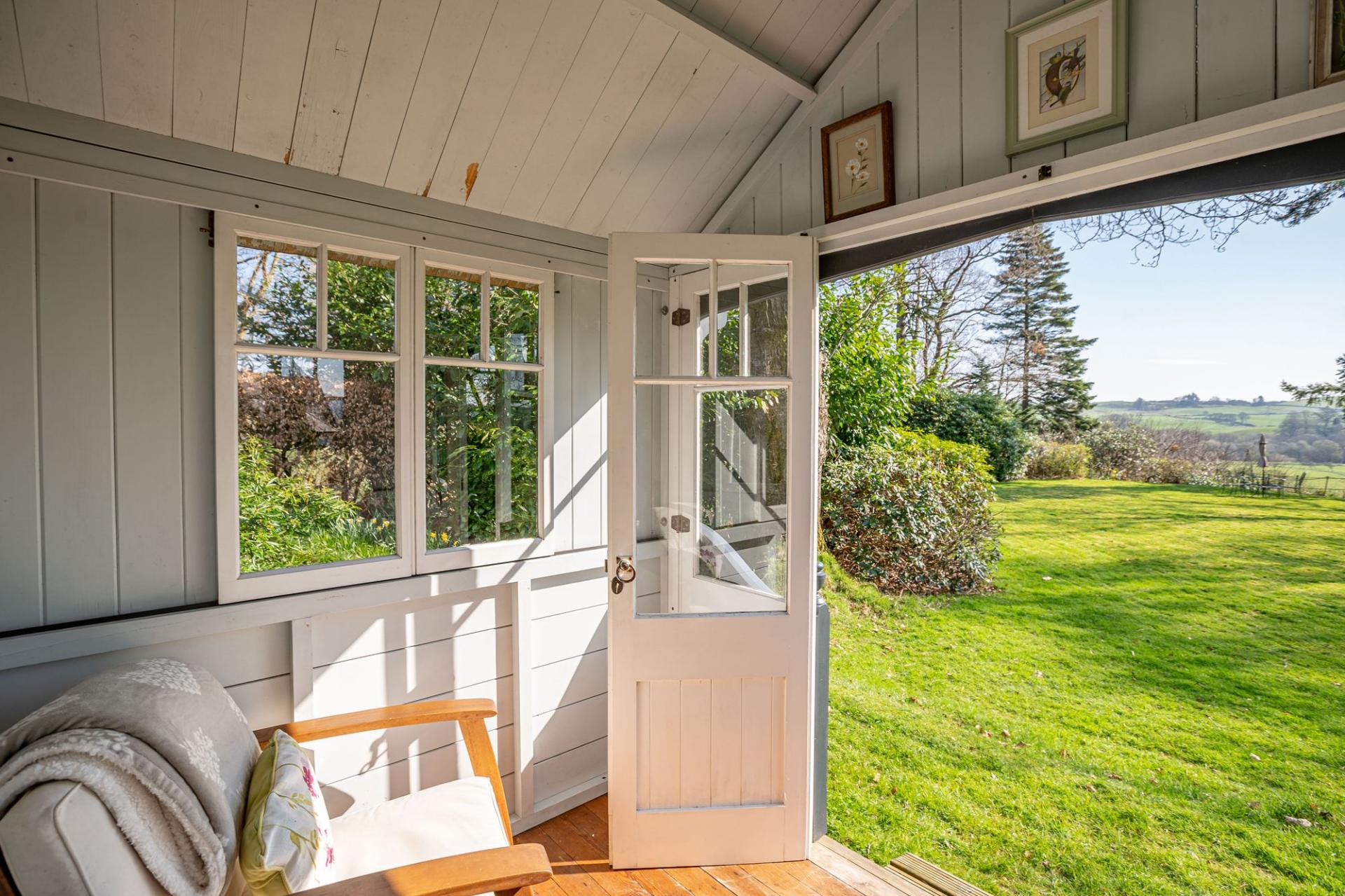 There are beautifully landscaped gardens that wrap around the property. Positioned on a sunny and slightly elevated site, the garden offers a high level of privacy. There are expanses of lawn, deep flower beds, mature shrubs and many rhododendrons that fill the garden with colour during the summer months. Paths meander around the grounds, which extend to just over 2.2 ac and includes a lovely area of woodland. There is a greenhouse, two external stores, and a wood store but the star feature of the garden is the charming summerhouse. This summerhouse is original to the property, originally made by Boulton & Paul, and has been fully restored by the present owners. It features a rotating base, ensuring that you can follow the sun as it moves around the garden.