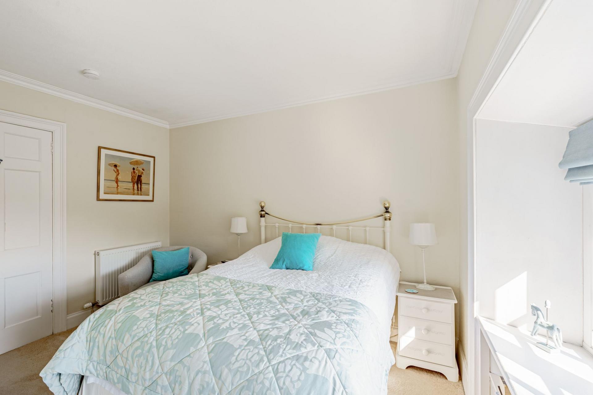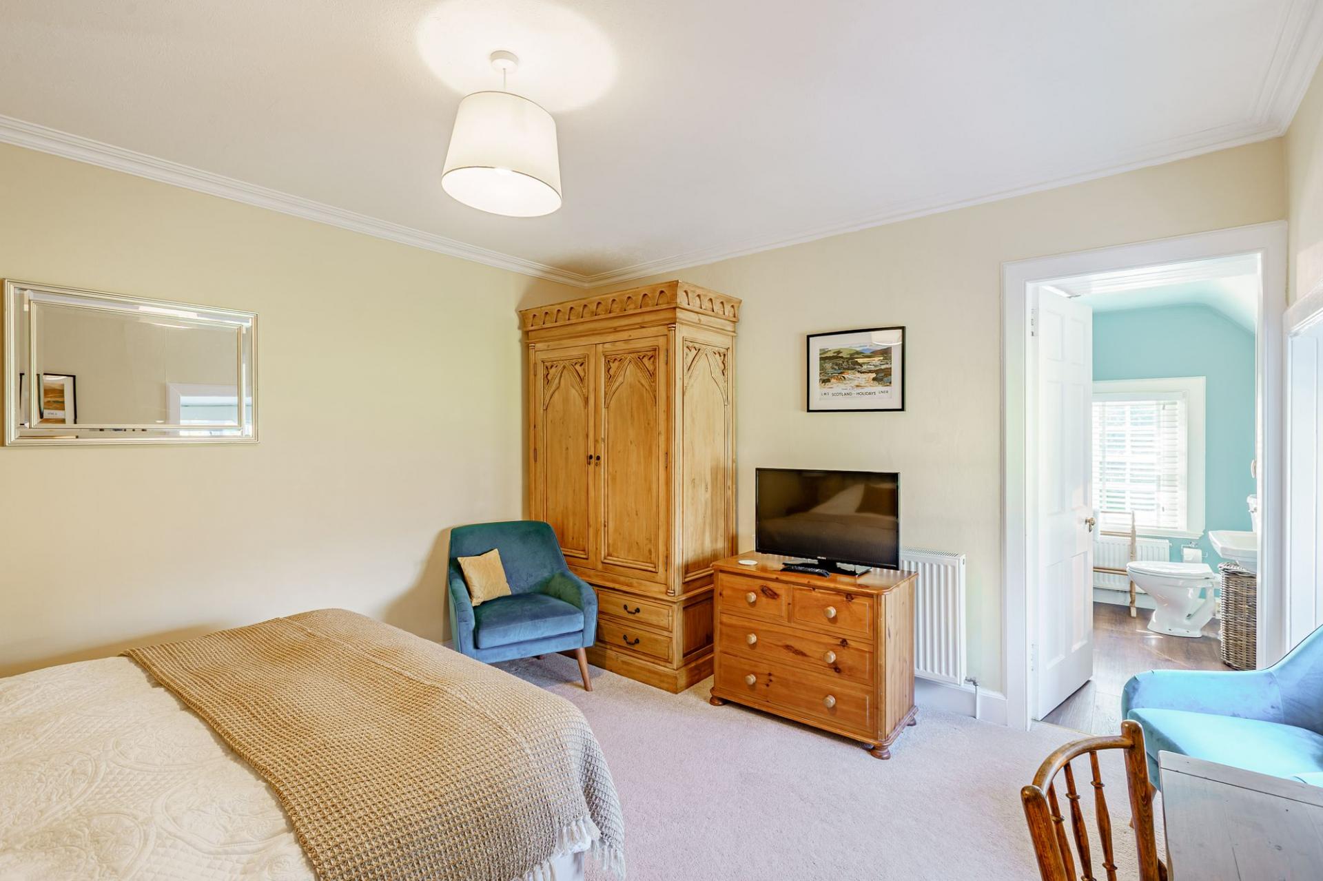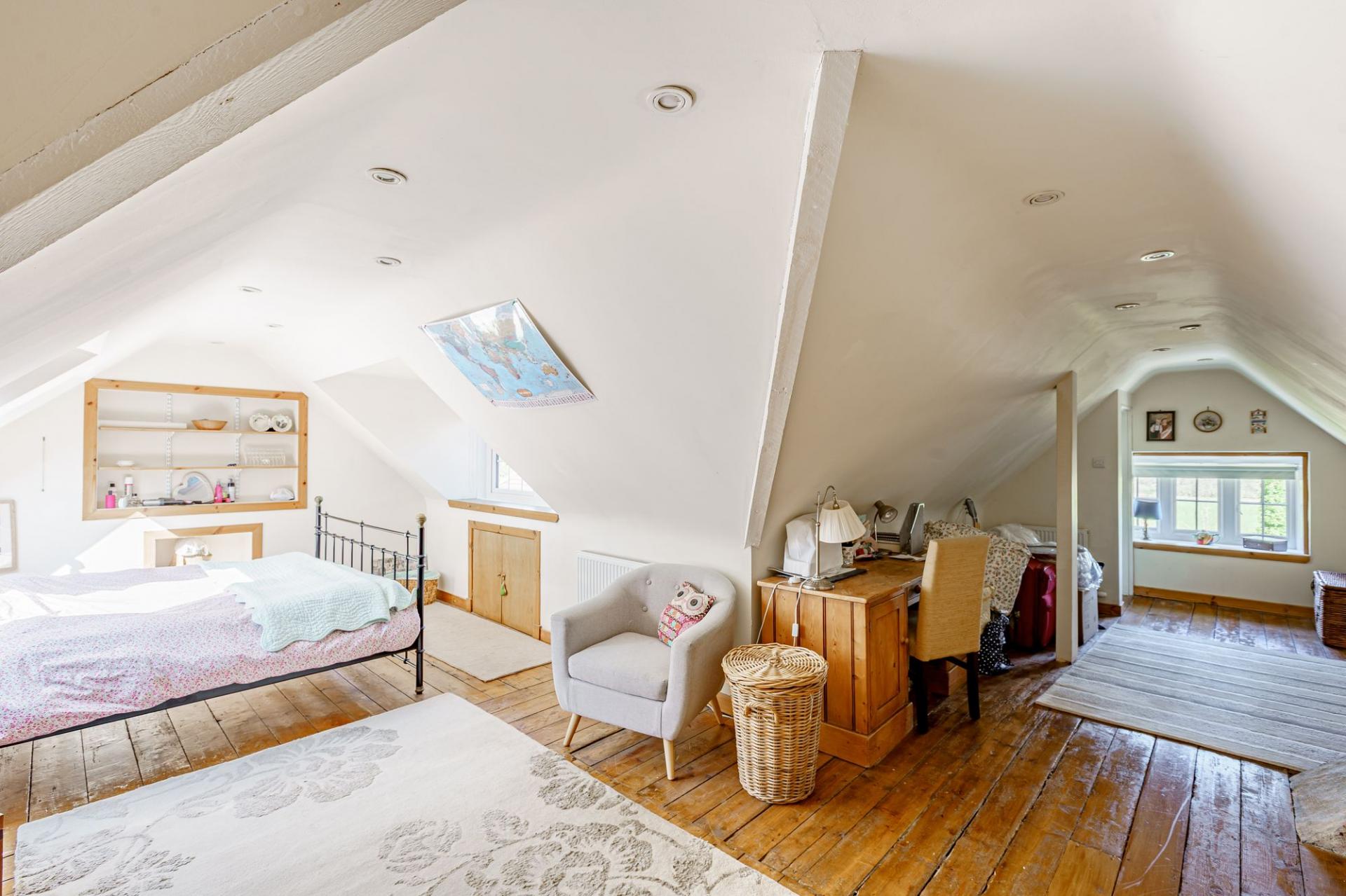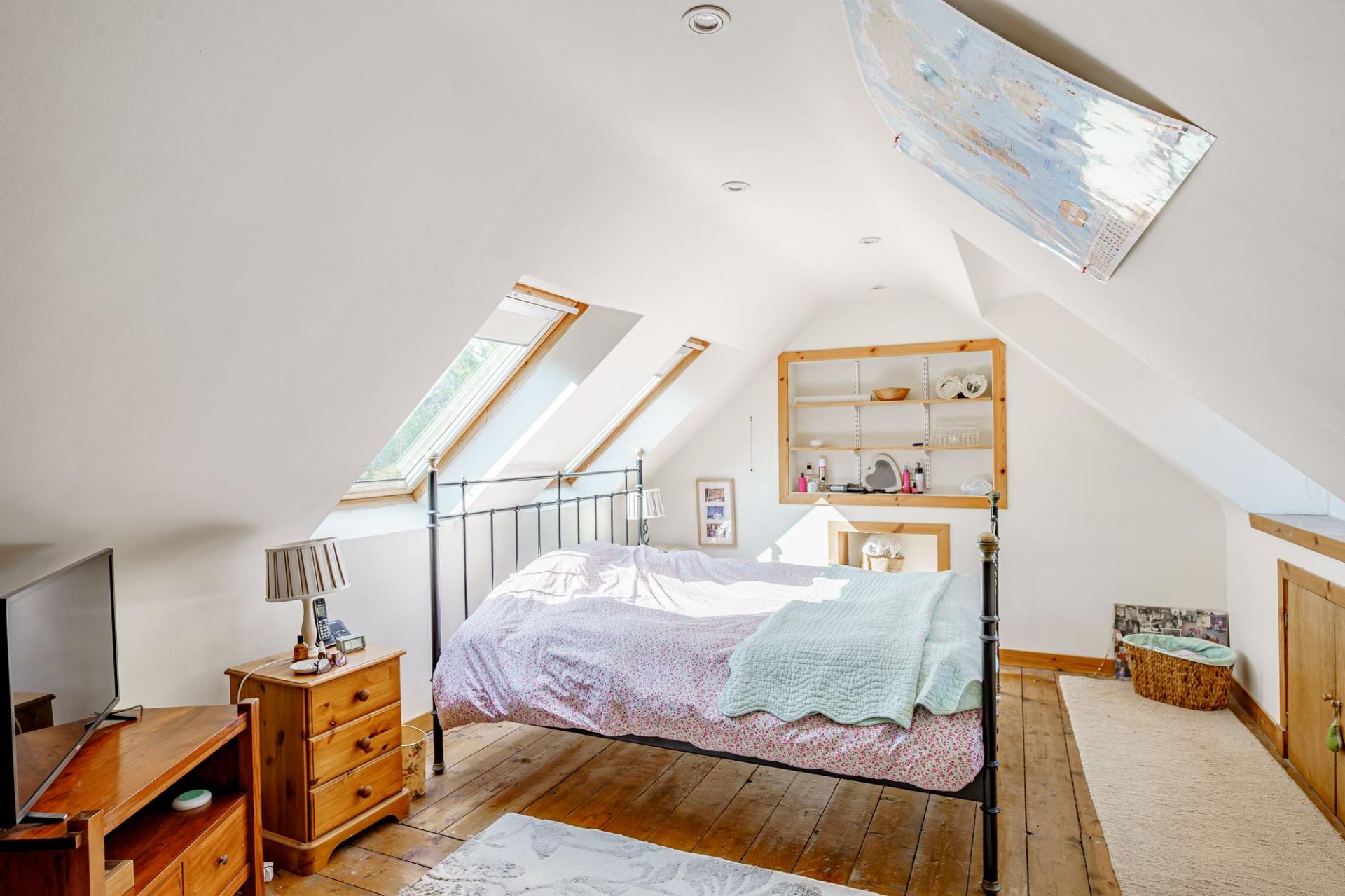Timber stairs rise from the first floor to the top floor bedroom, which is a large L-shaped room that could be used for a variety of purposes. It is lit via velux windows and a double-glazed dormer window and has a useful internal ensuite bathroom, comprising bath with hand held shower attachment.