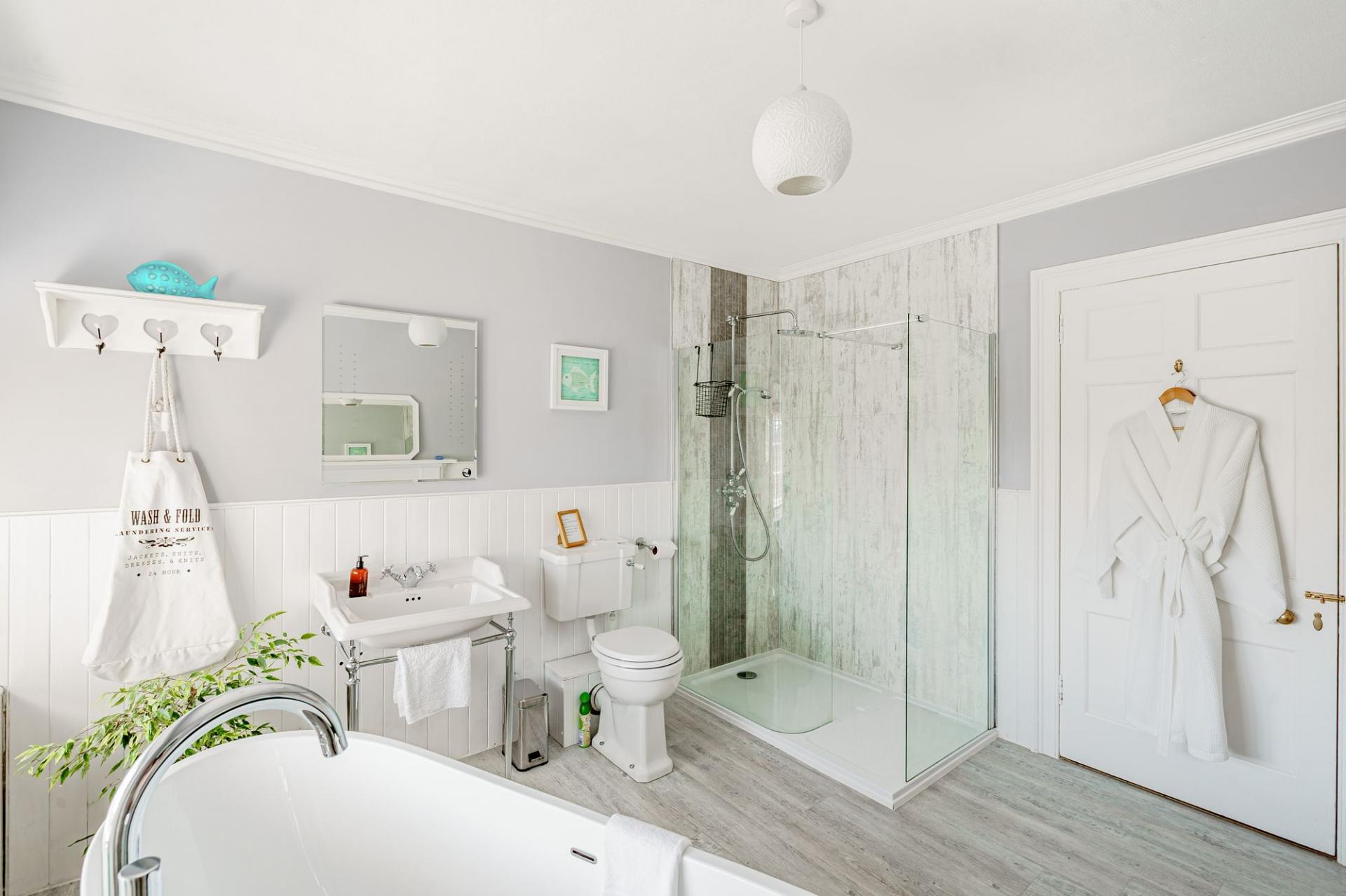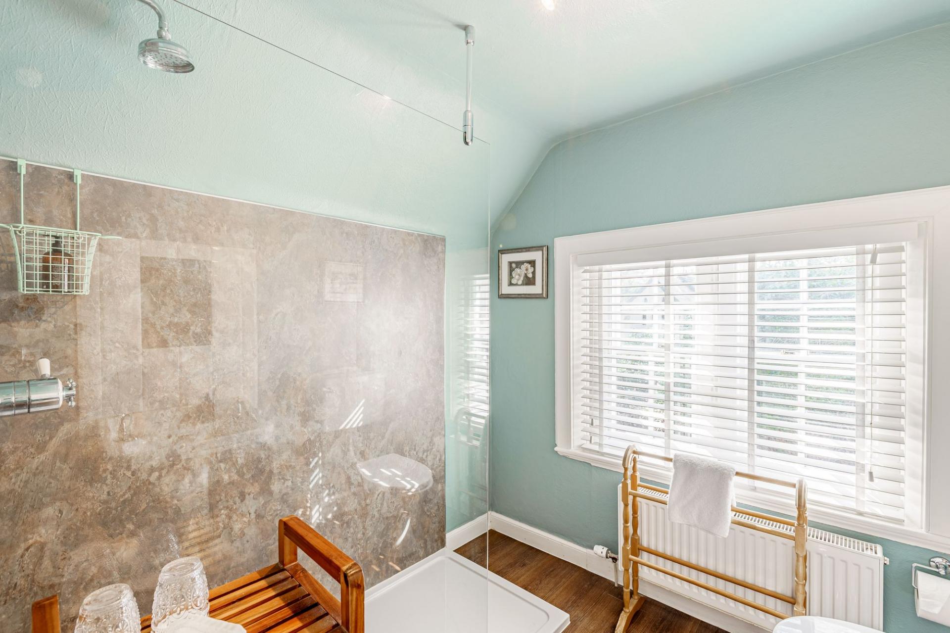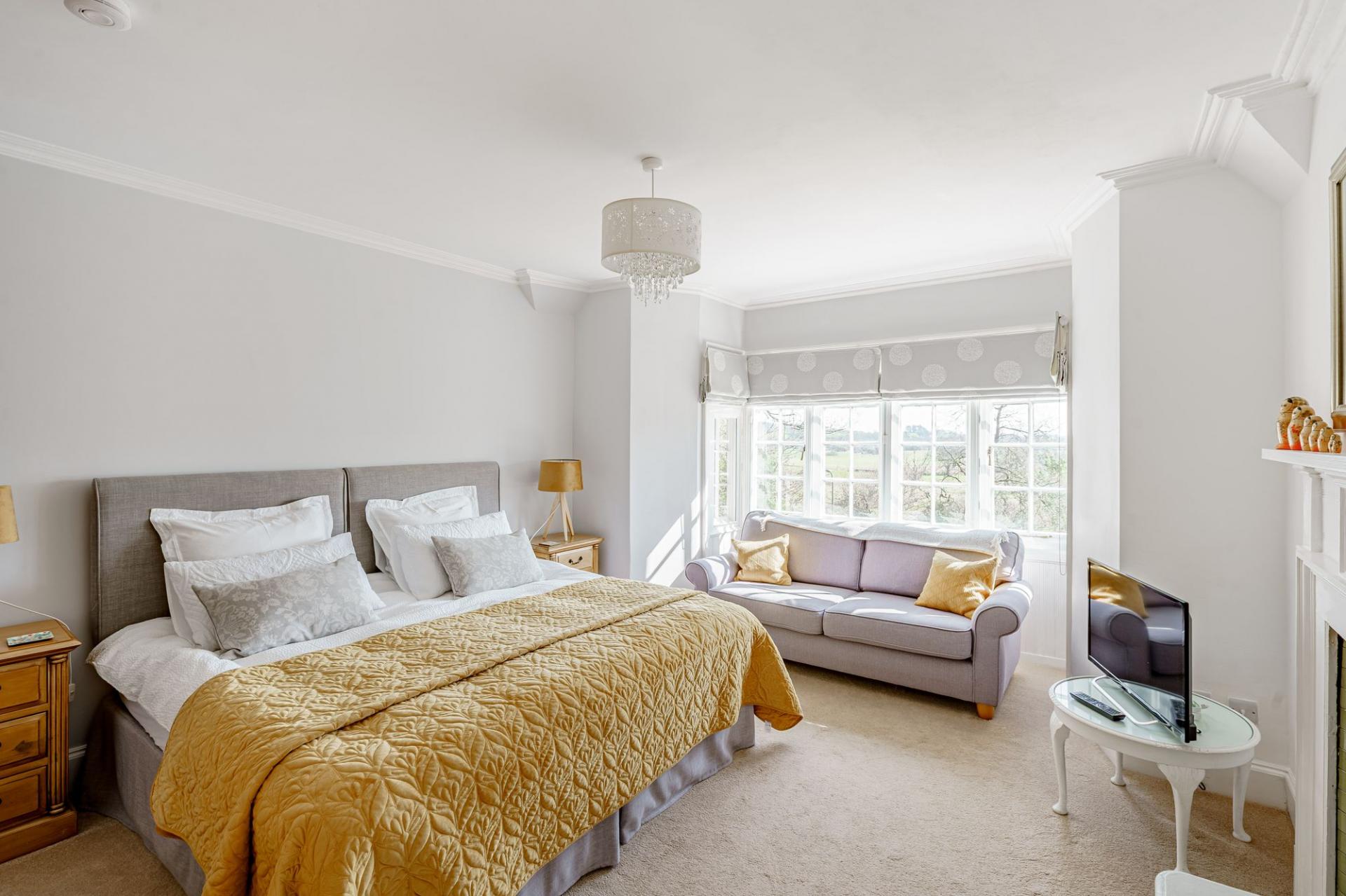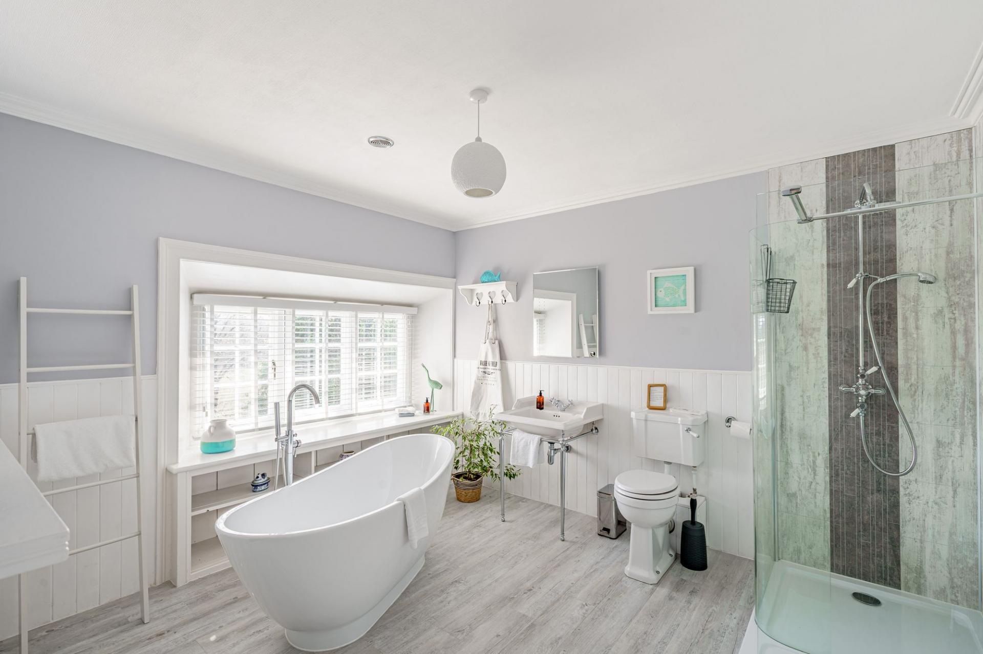 Timber stairs rise from the first floor to the top floor bedroom, which is a large L-shaped room that could be used for a variety of purposes. It is lit via velux windows and a double-glazed dormer window and has a useful internal ensuite bathroom, comprising bath with hand held shower attachment.