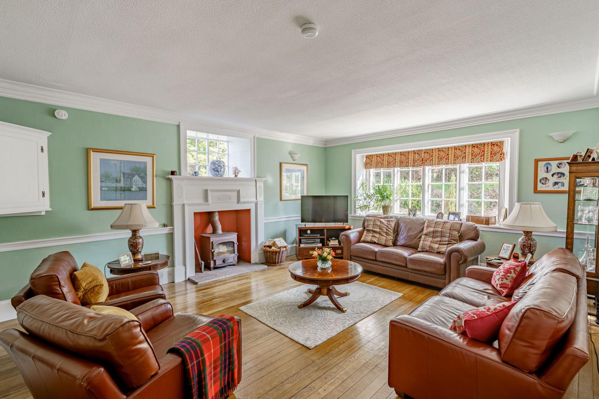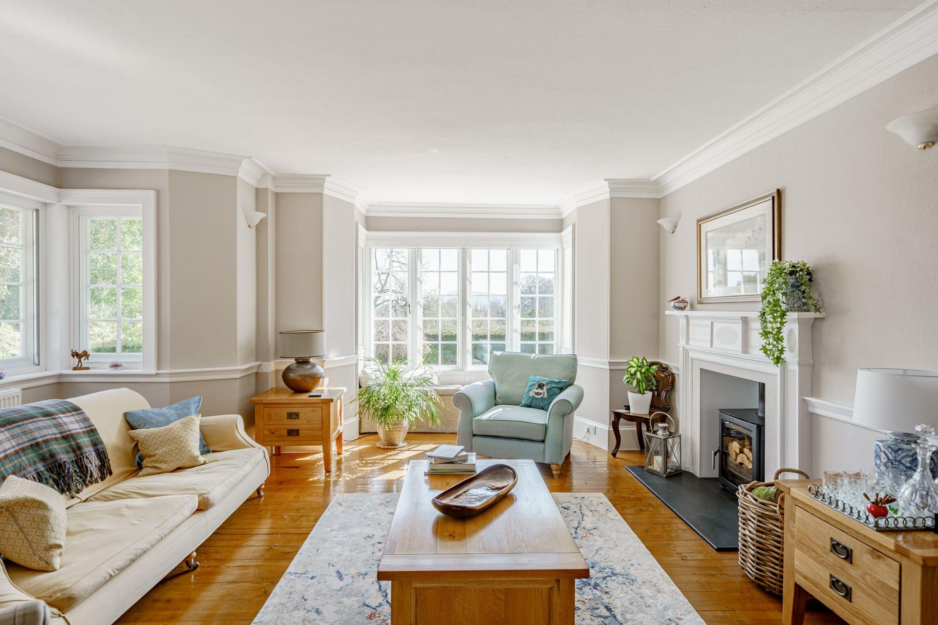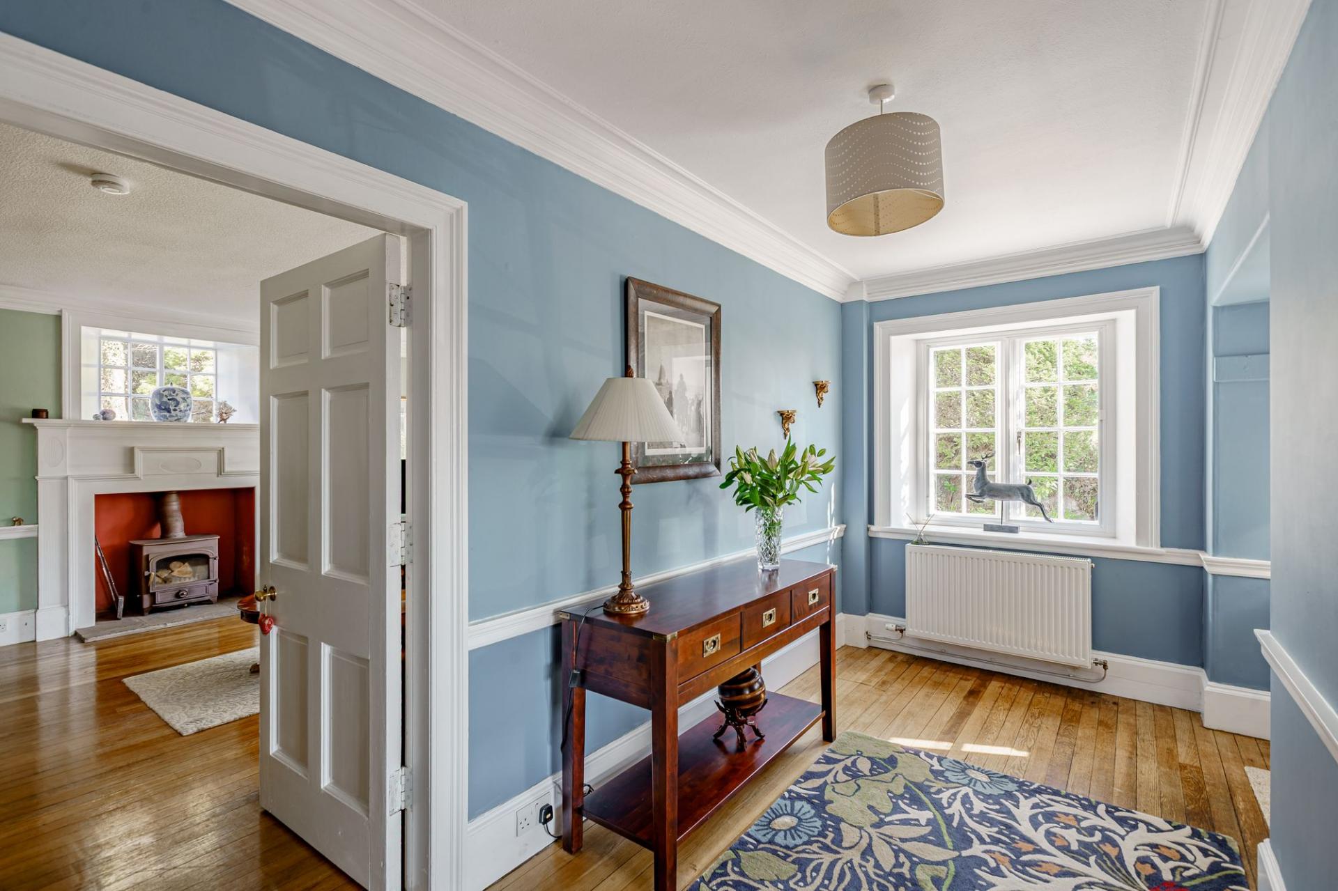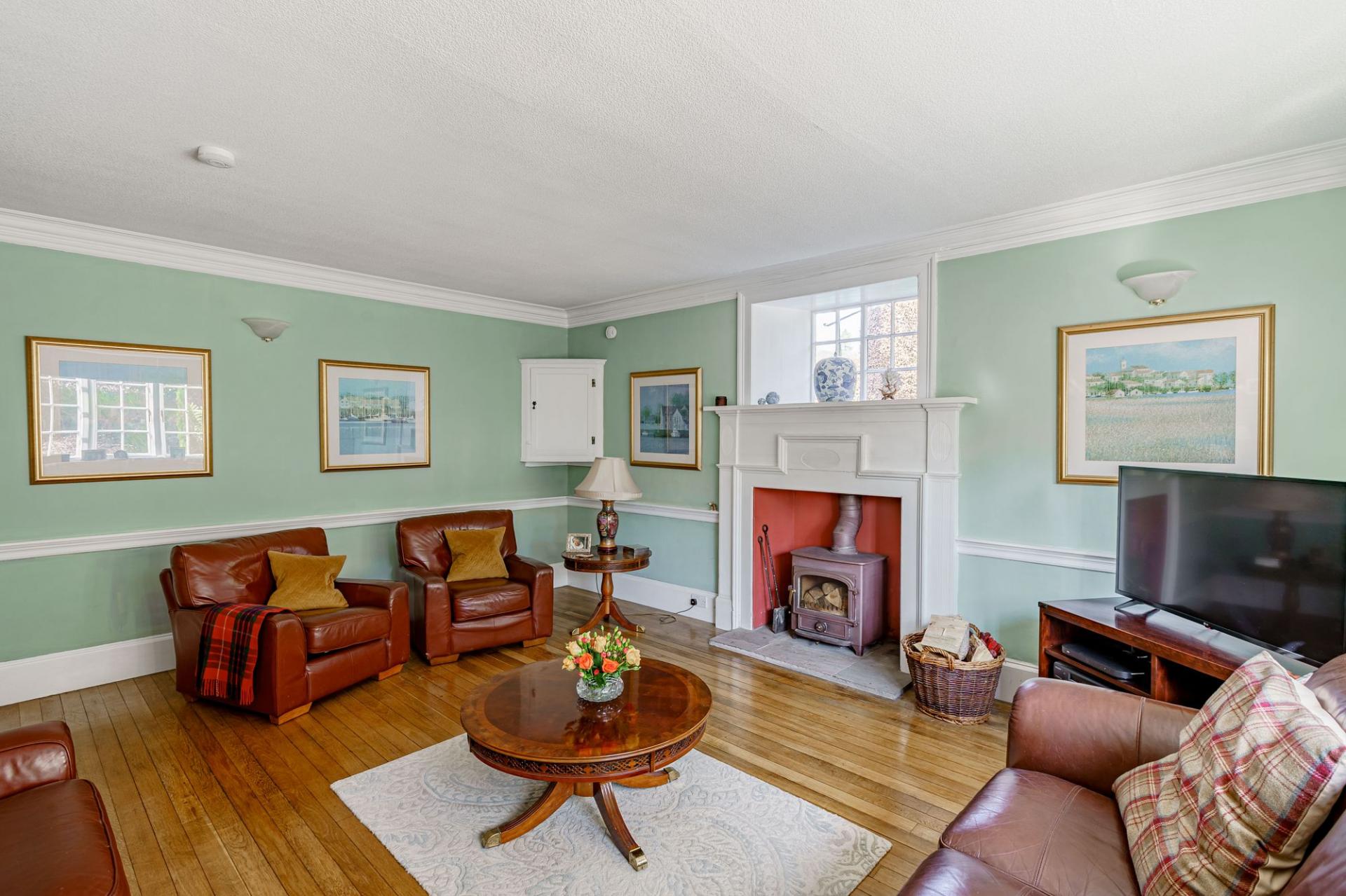 A solid timber front door opens into the vestibule, where a part glazed inner door leads into the reception hall. The impressive hall features original timber flooring to the floor, a charming fireplace (not in use) and a lovely staircase with barley twist balustrade. There are three principal reception rooms on the ground floor. The sitting room is filled with natural light and enjoys a dual aspect, with built-in window seat to the southern elevation and glorious views. There is a polished wood floor, built in shelving and a modern wood burning stove set within a timber surround.