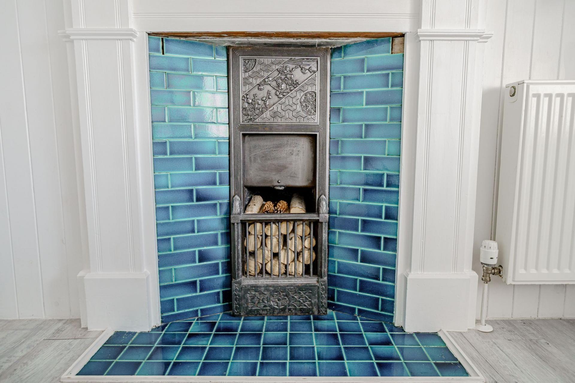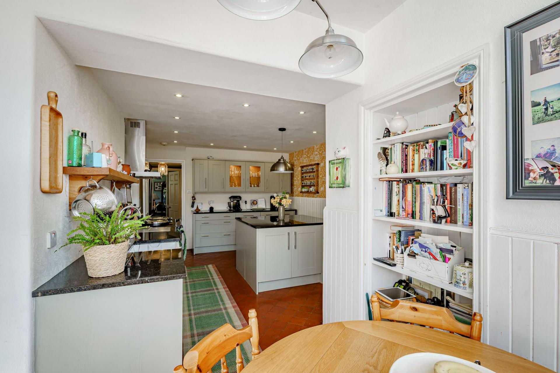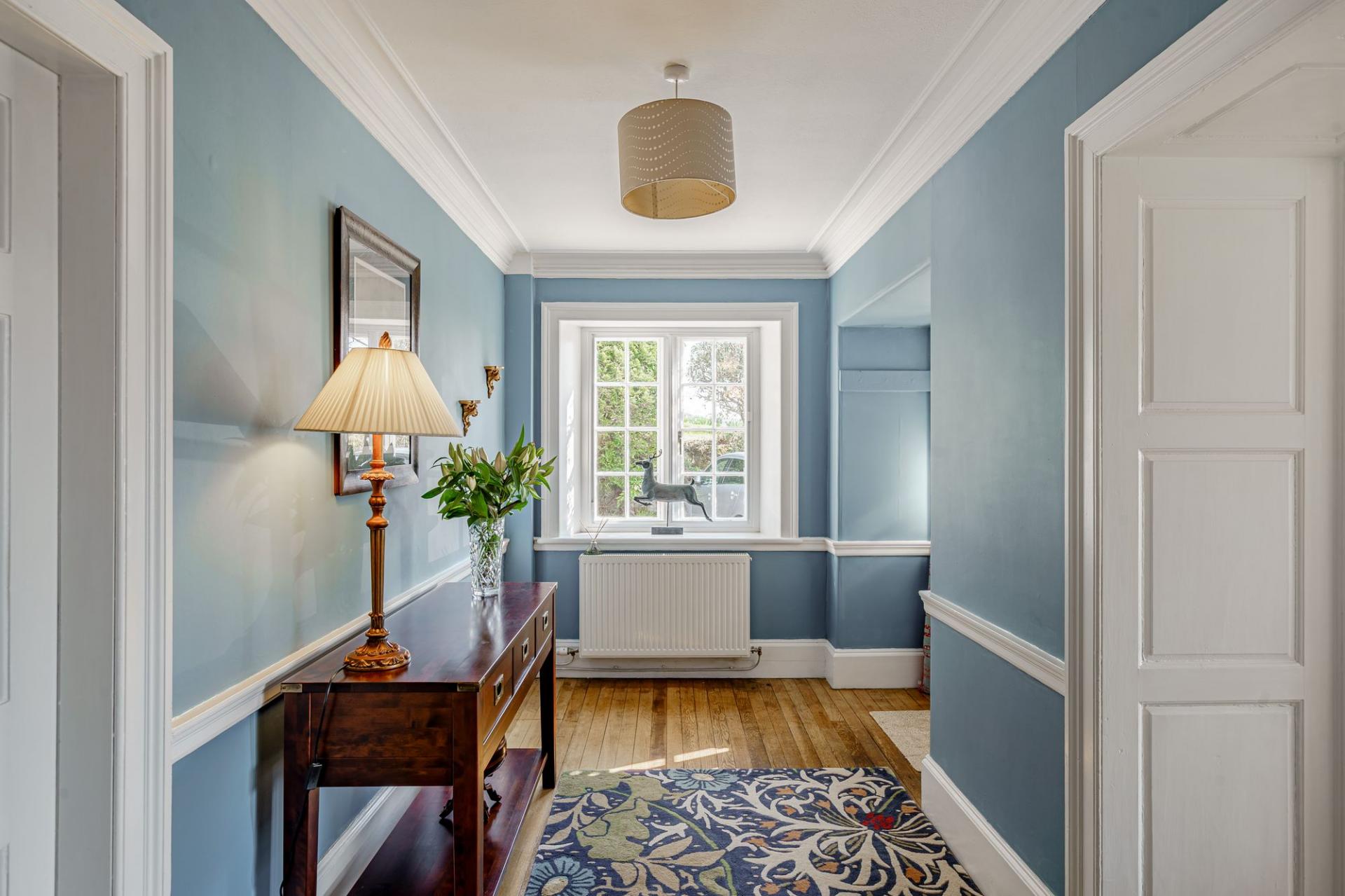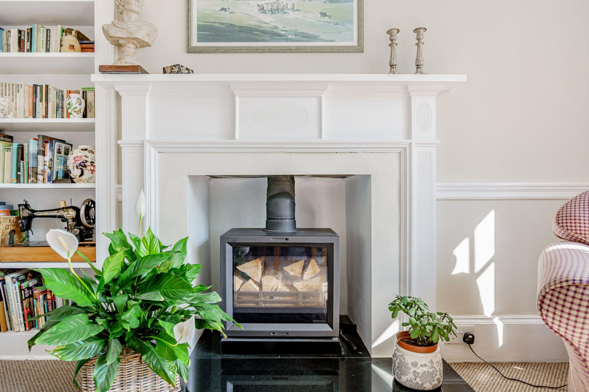 A solid timber front door opens into the vestibule, where a part glazed inner door leads into the reception hall. The impressive hall features original timber flooring to the floor, a charming fireplace (not in use) and a lovely staircase with barley twist balustrade. There are three principal reception rooms on the ground floor. The sitting room is filled with natural light and enjoys a dual aspect, with built-in window seat to the southern elevation and glorious views. There is a polished wood floor, built in shelving and a modern wood burning stove set within a timber surround.