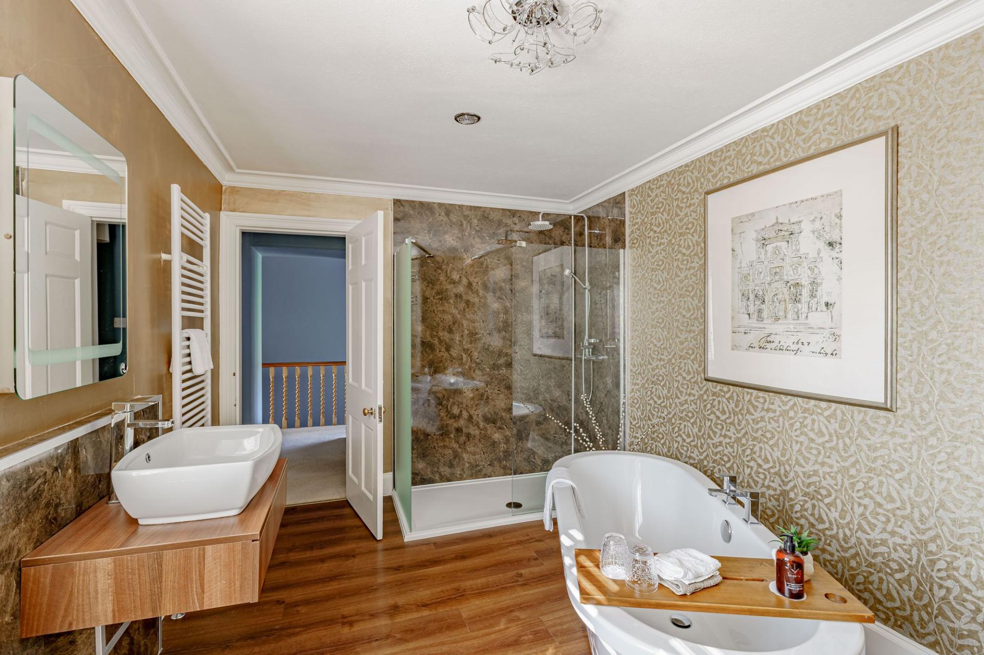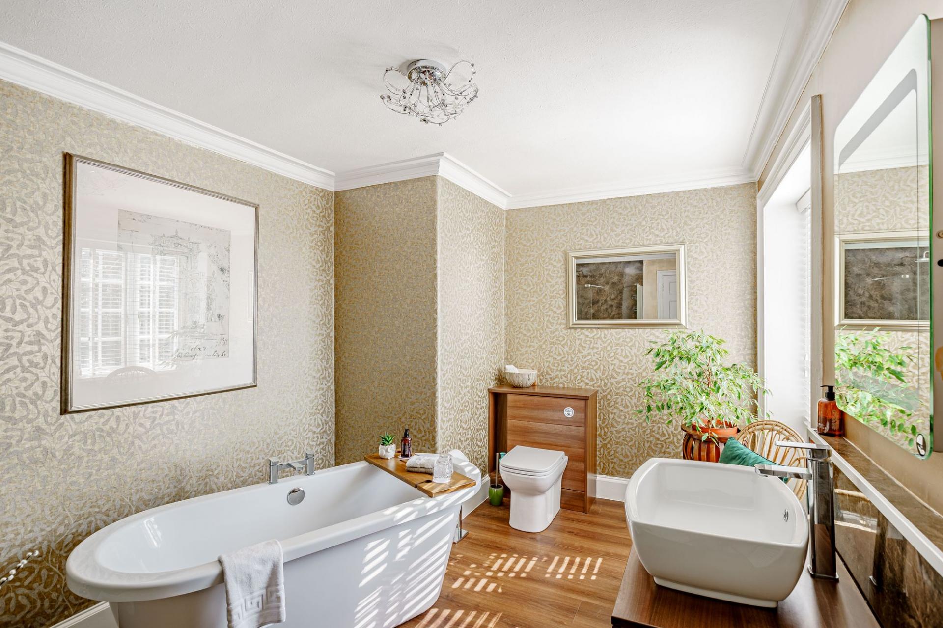 The fine staircase rises to a light and spacious first floor landing. The landing splits off to four double bedrooms on this level, with the fifth bedroom being located on the top floor. All bedrooms are bright and generously proportioned and feature lovely open outlooks. There are also three bathrooms on the first floor. The two principal bathrooms are simply exquisite, and feature free standing baths, generous walk-in showers and are naturally lit via large windows.