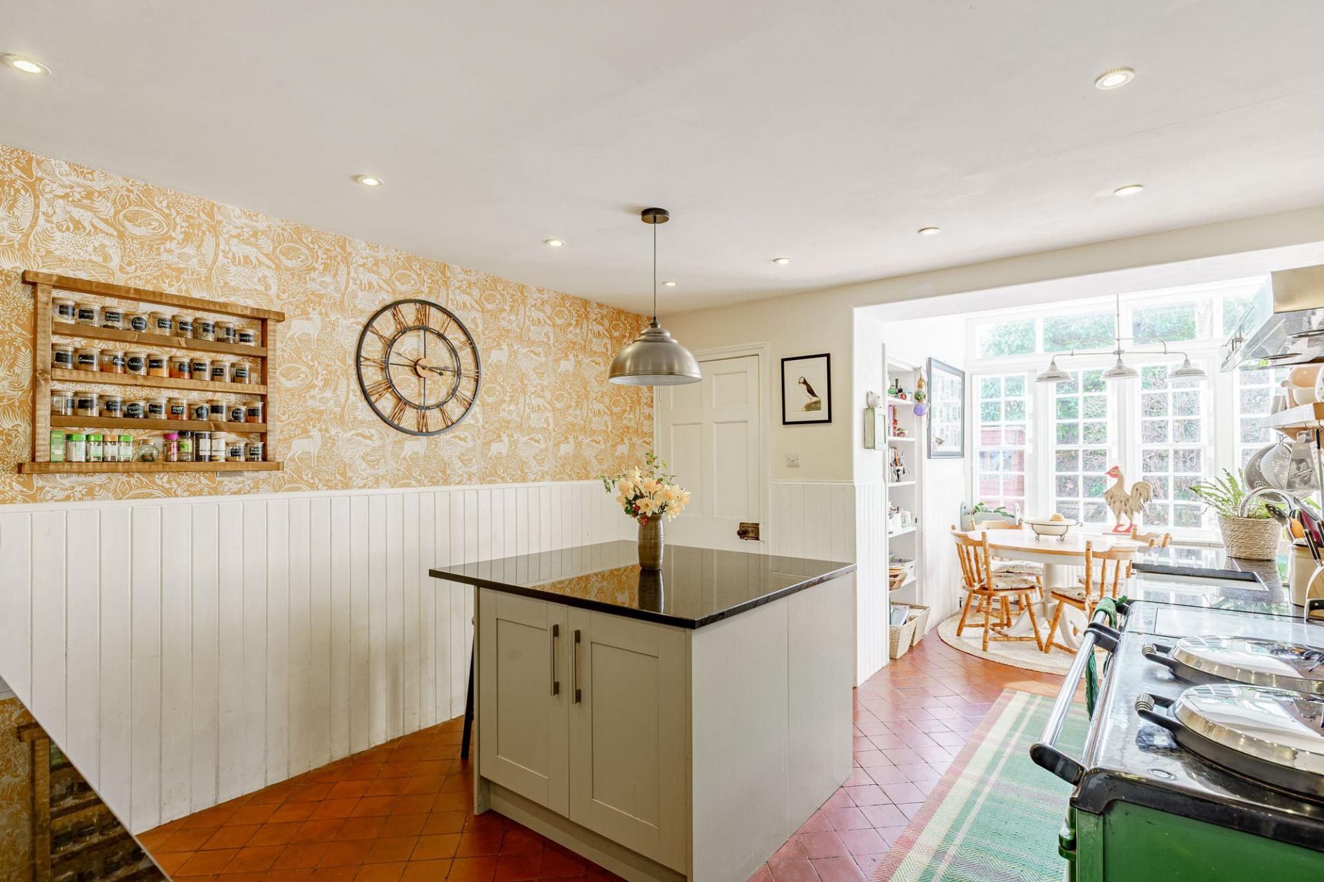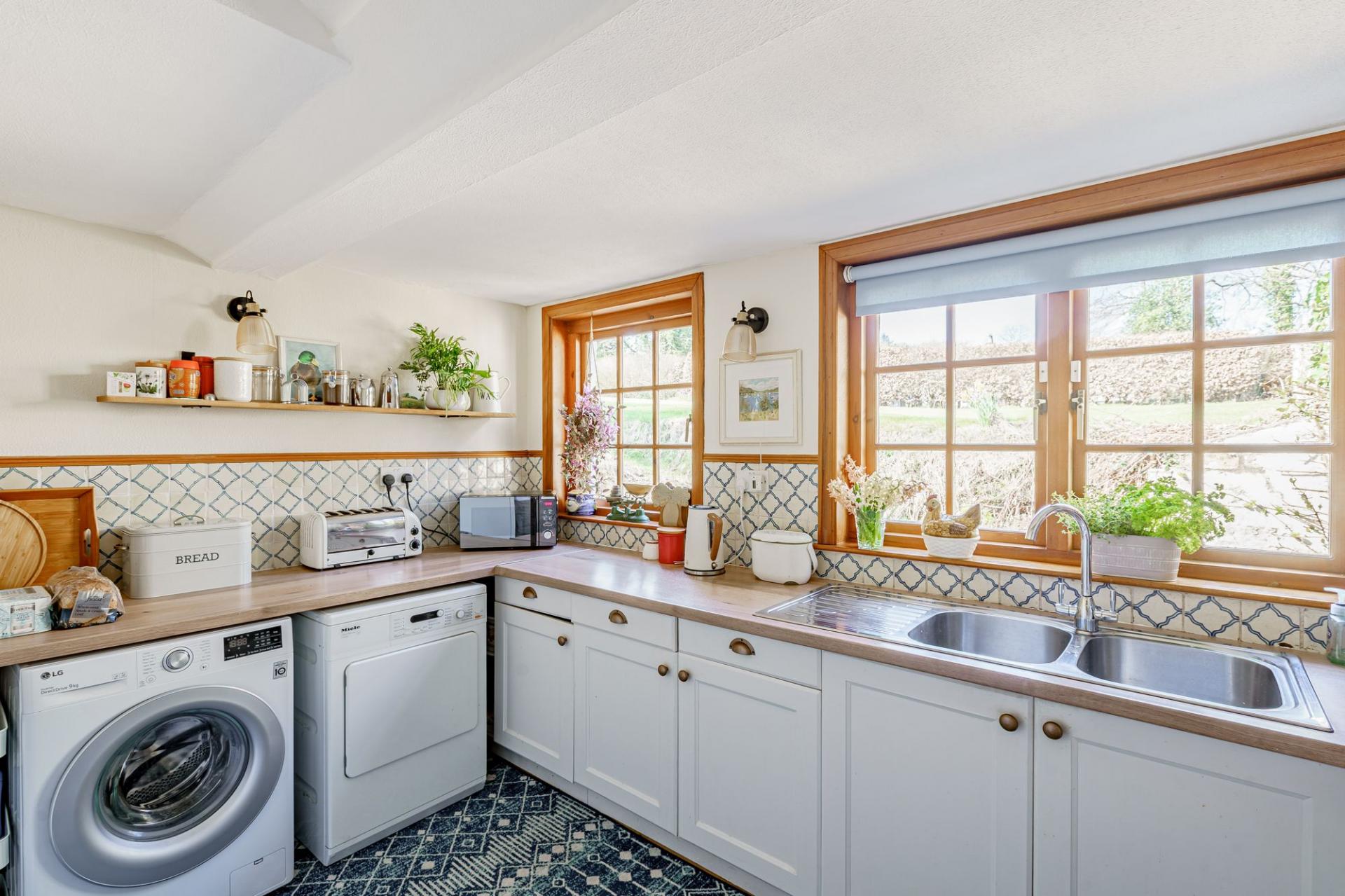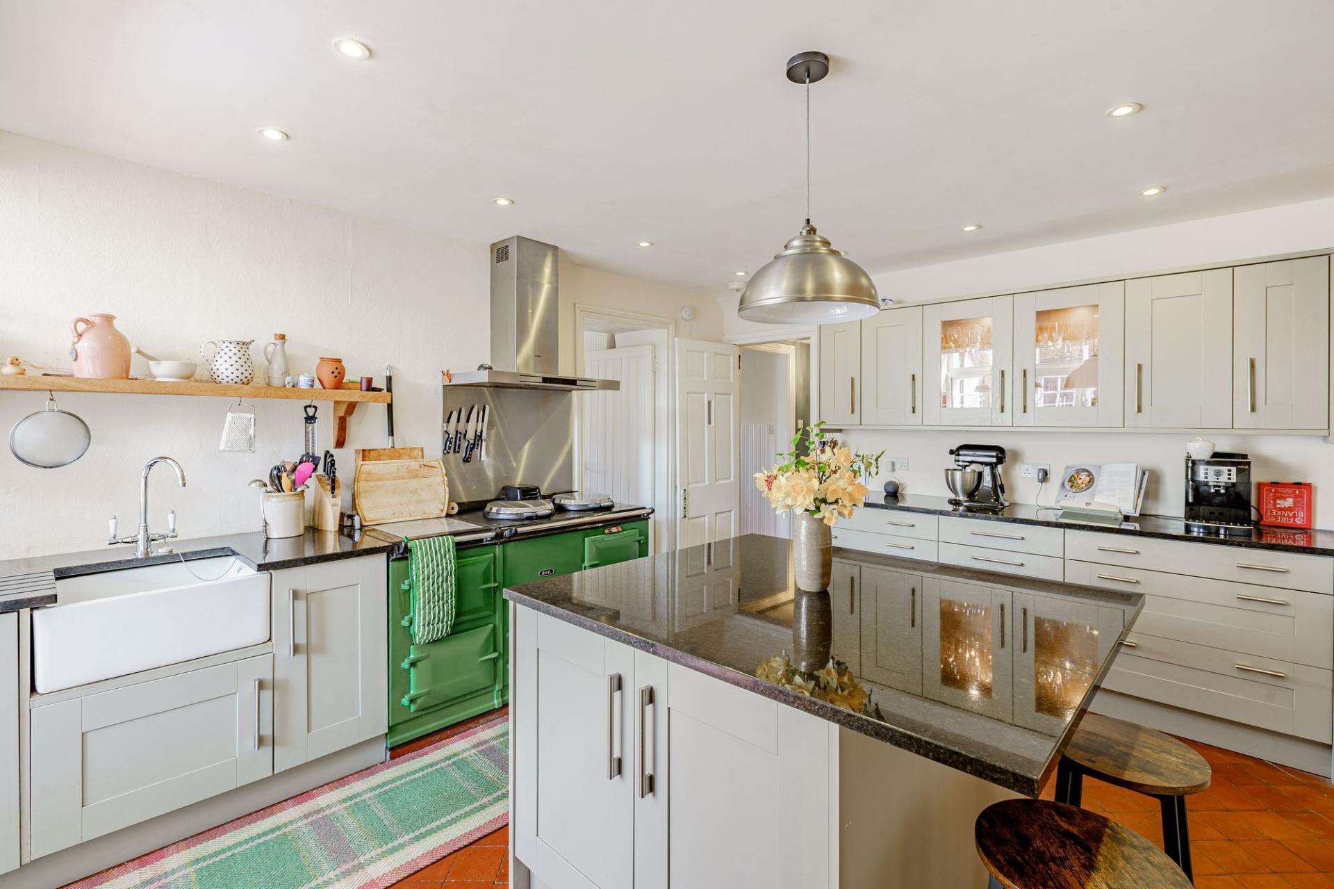 The kitchen/breakfast room is to the rear of the property and is fitted with an excellent range of units and a central island, all with solid granite worksurfaces. There is an oil-fired 4 oven Aga, an integrated dishwasher and a Belfast sink. A unique feature of this house is the secondary kitchen and utility room located adjacent. This spacious room offers additional kitchen storage, twin sinks and an electric hob and oven (ideal for use in the summer months when you may wish to turn the Aga off). There is also plumbing for white goods and space for a large fridge/freezer.