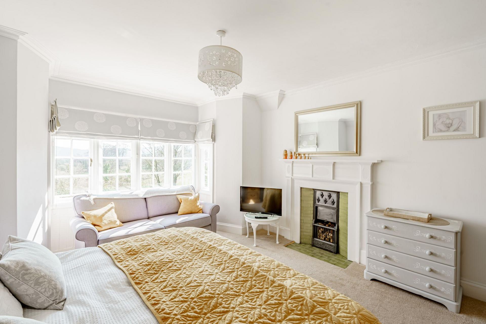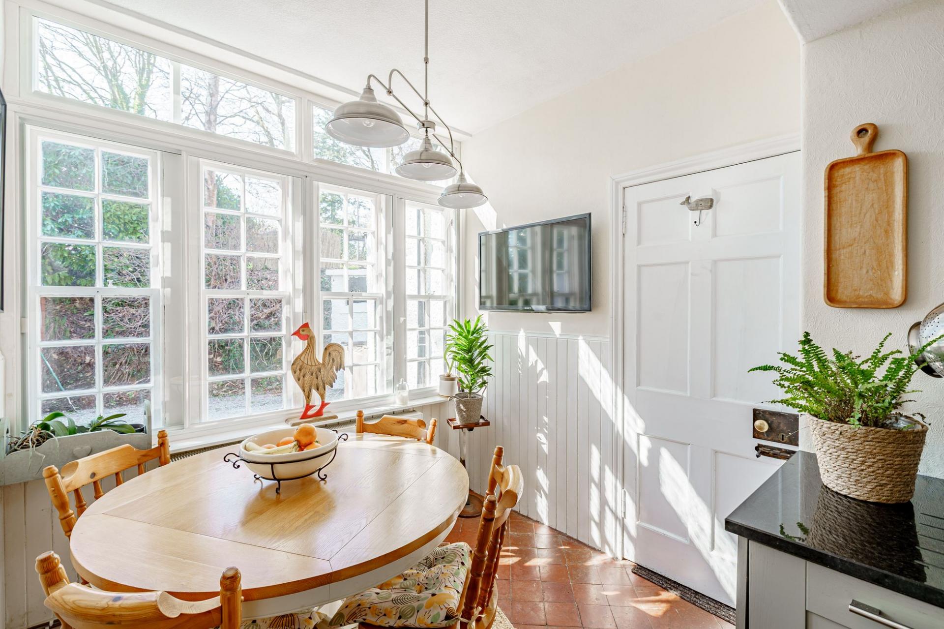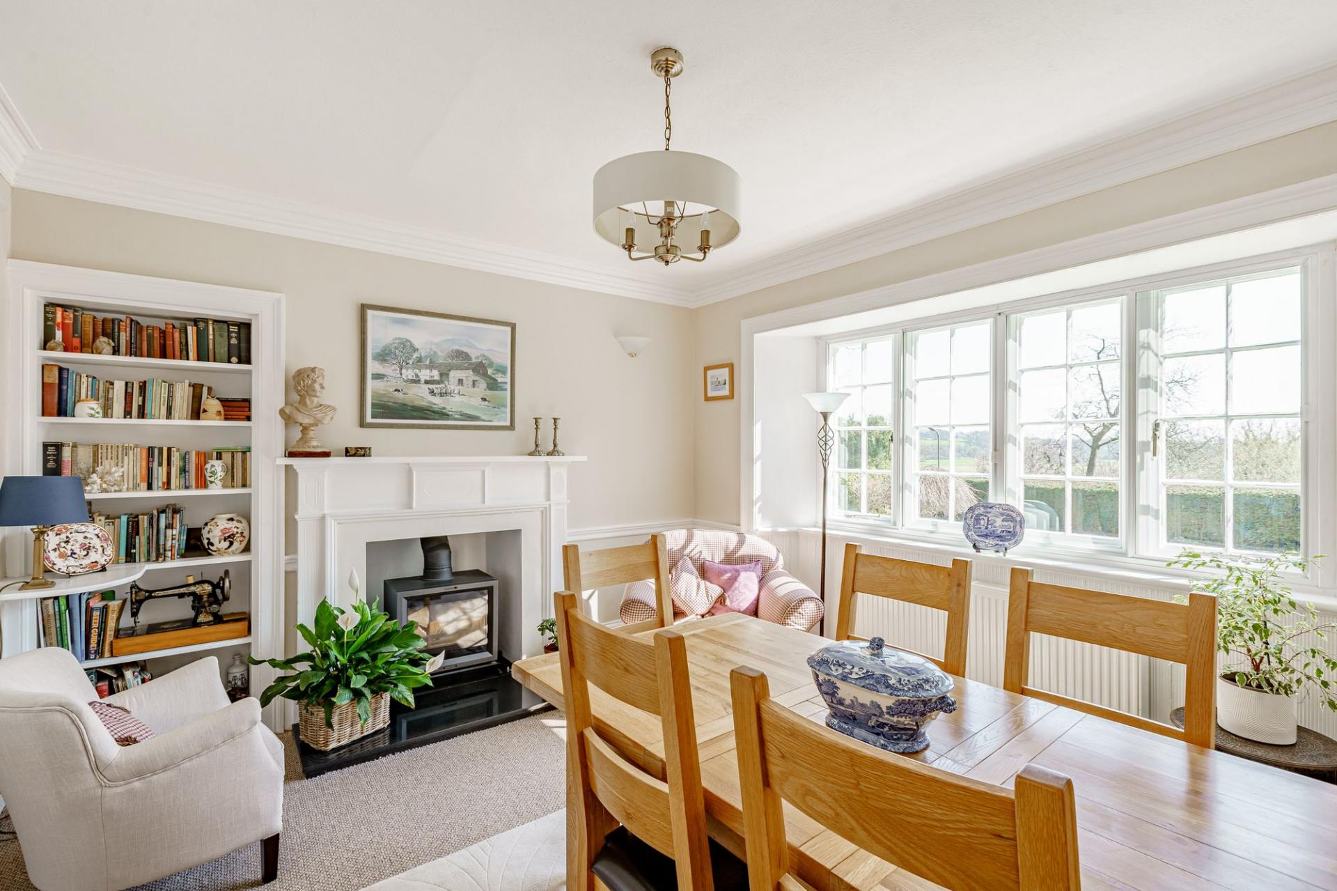The family room is also located directly off the hall and boasts windows on two elevations and a wood burning stove set within a timber surround. There is a large dining room which enjoys amazing views via the twin windows to the front elevation. A contemporary wood burning stove is a lovely feature of the room.