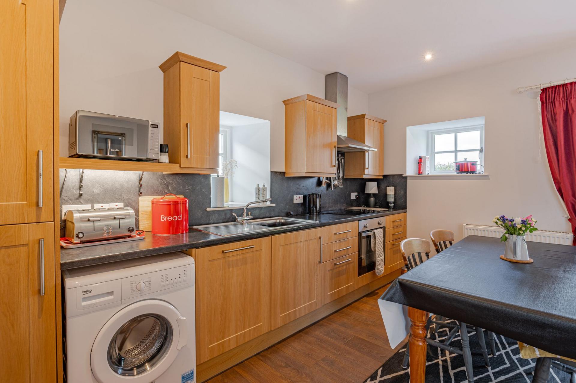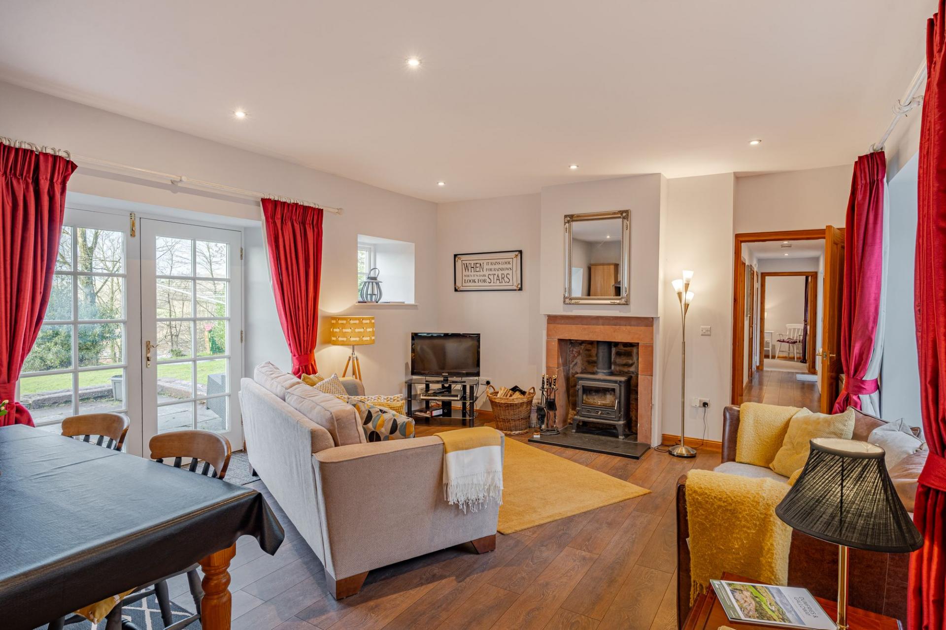 The entrance opens into a lovely open plan kitchen/dining/sitting room. The kitchen area comprises a range of modern fitted units with sink, electric hob and oven, integrated fridge/freezer and dishwasher. There is an attractive wood burning stove in a sandstone surround, views to the hills and double, glazed doors opening to the patio and garden, as well as a large window looking out to the courtyard. There are two double bedrooms, both with built in wardrobes, and one with an en-suite shower room and direct access to the garden. The main shower room, which is adjacent to the second bedroom, has a generous walk-in shower, and completes the accommodation.