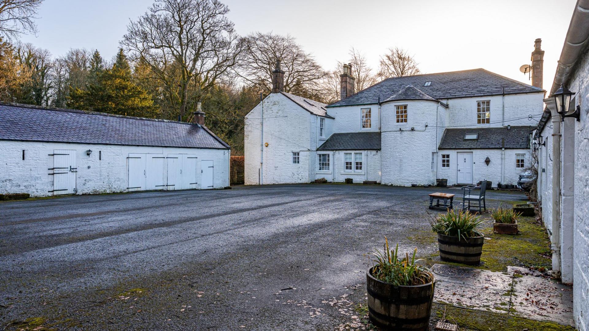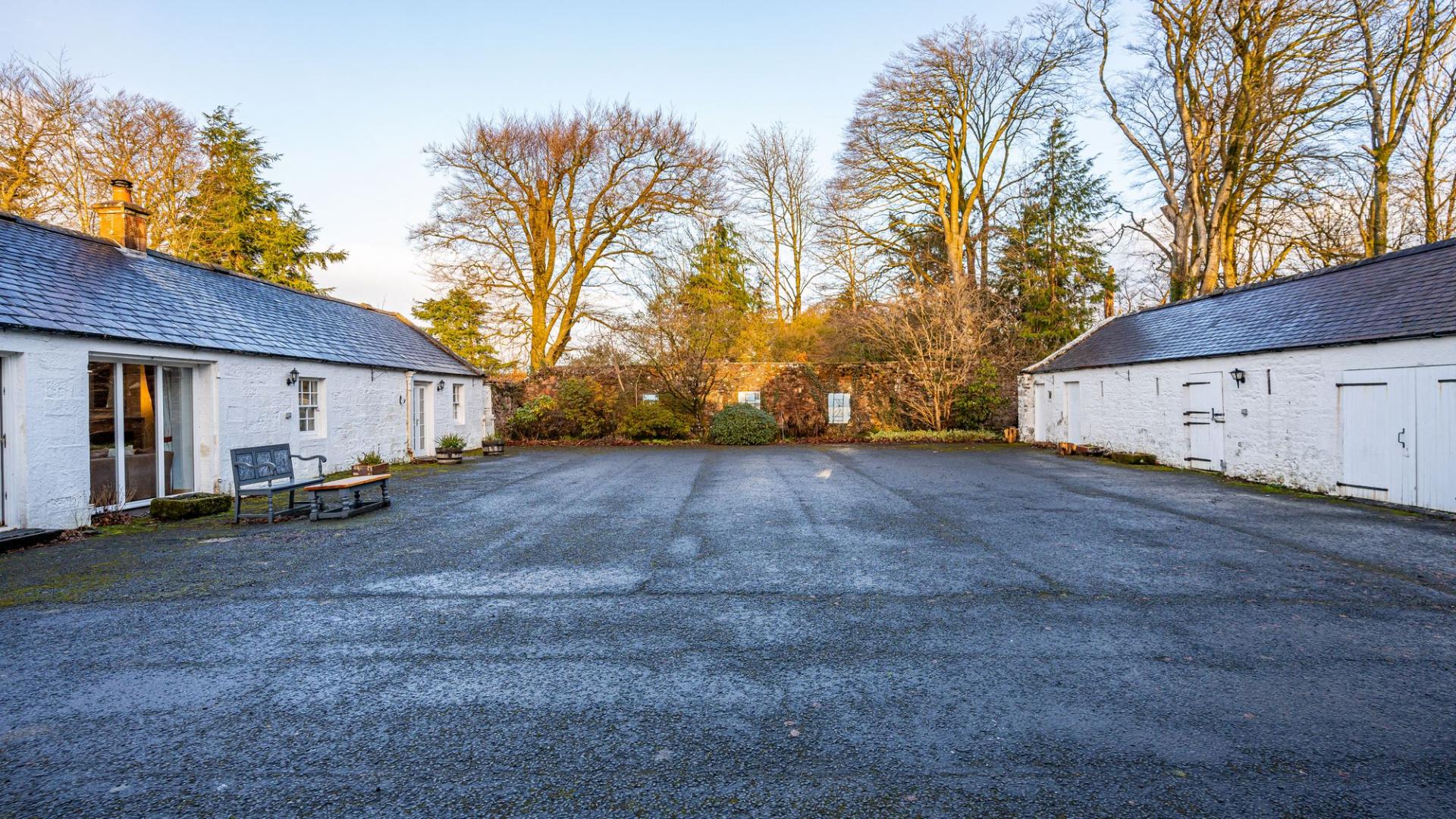 The property is accessed from the road (B731), where the driveway then splits and either culminates in a gravelled turning circle and parking area to the front of the house or a large, tarmac courtyard to the rear, with ample parking and turning and access to the outbuildings.