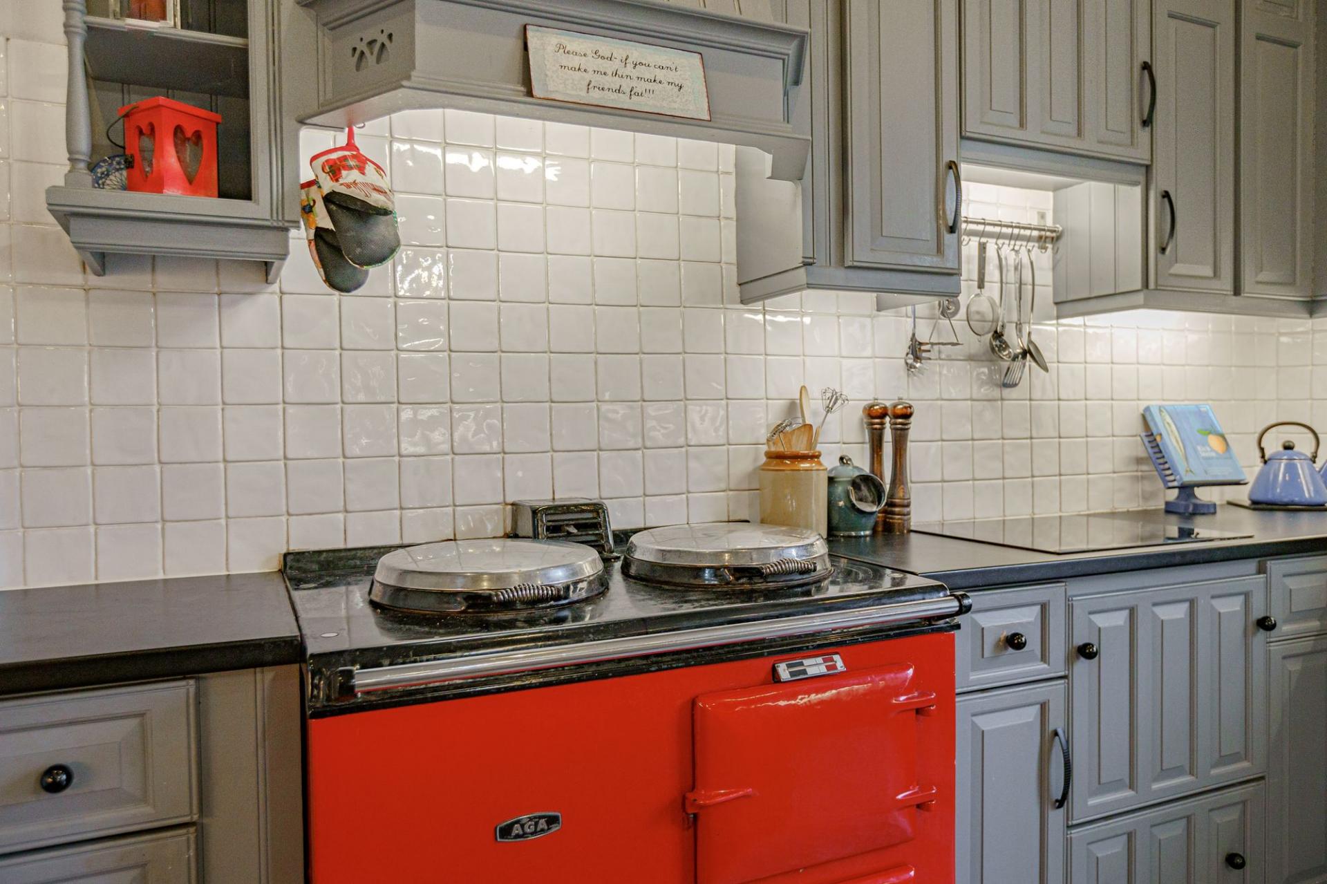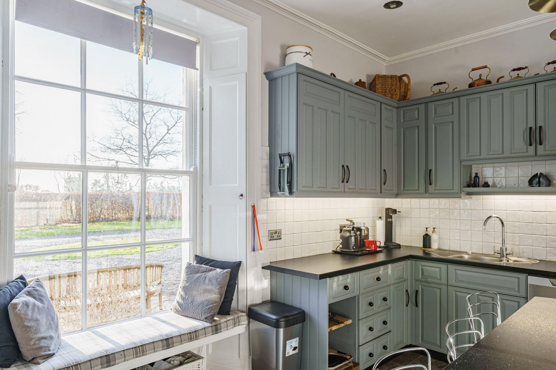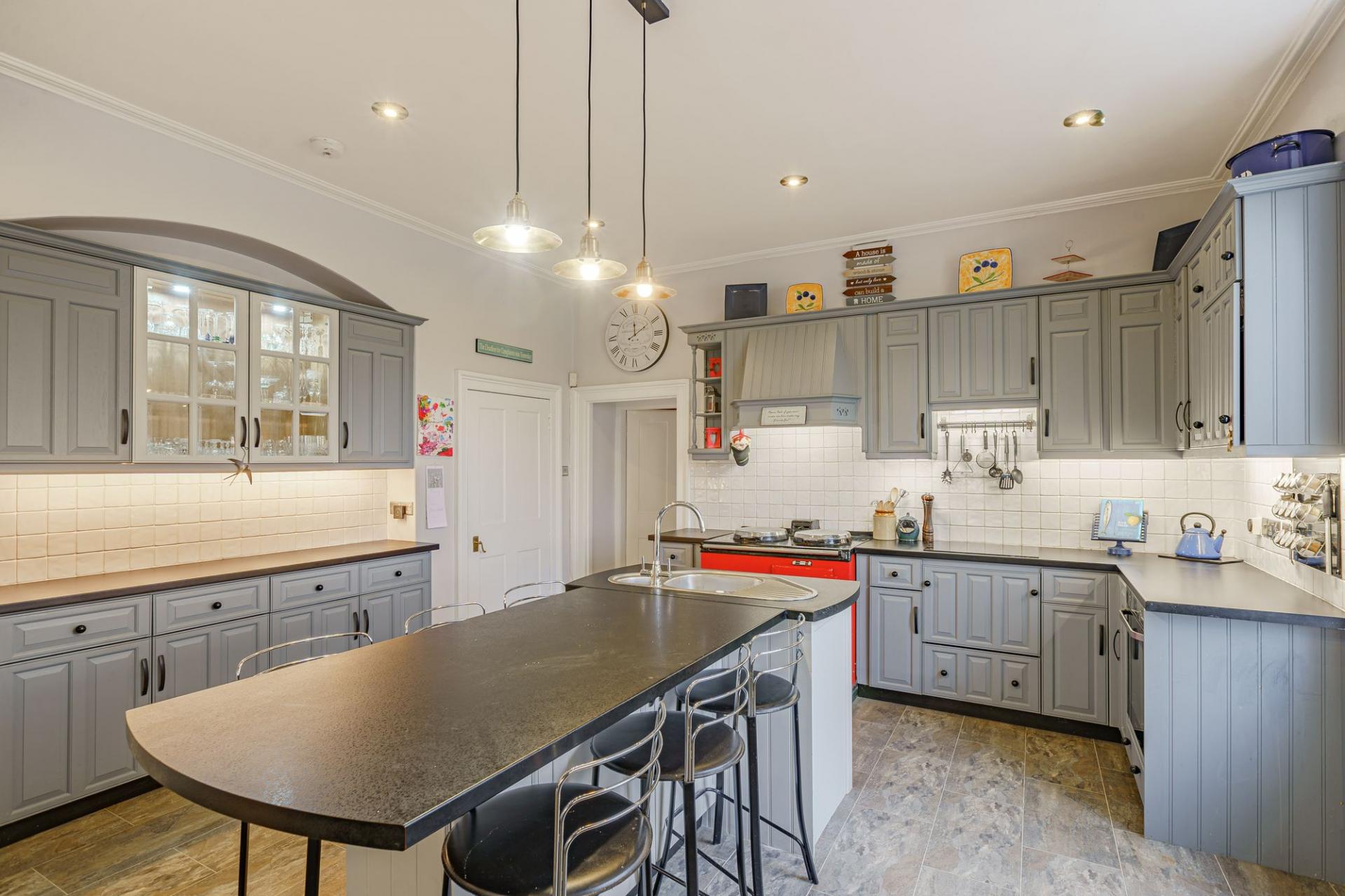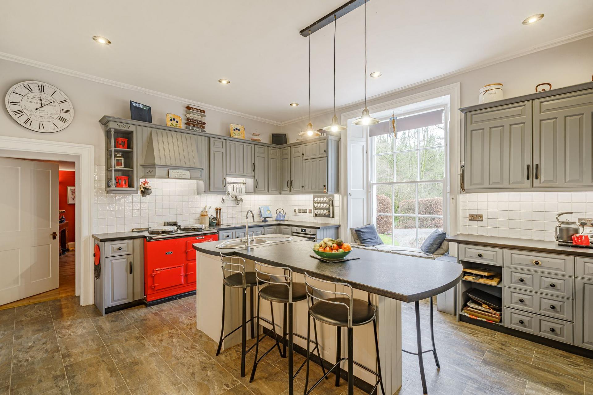 The kitchen offers an excellent range of fitted units with electric fired Aga, induction hob and oven, two sinks, and space for a dishwasher and fridge/freezer. There is a central island with breakfast bar and a large window to the front elevation, with window seat below.