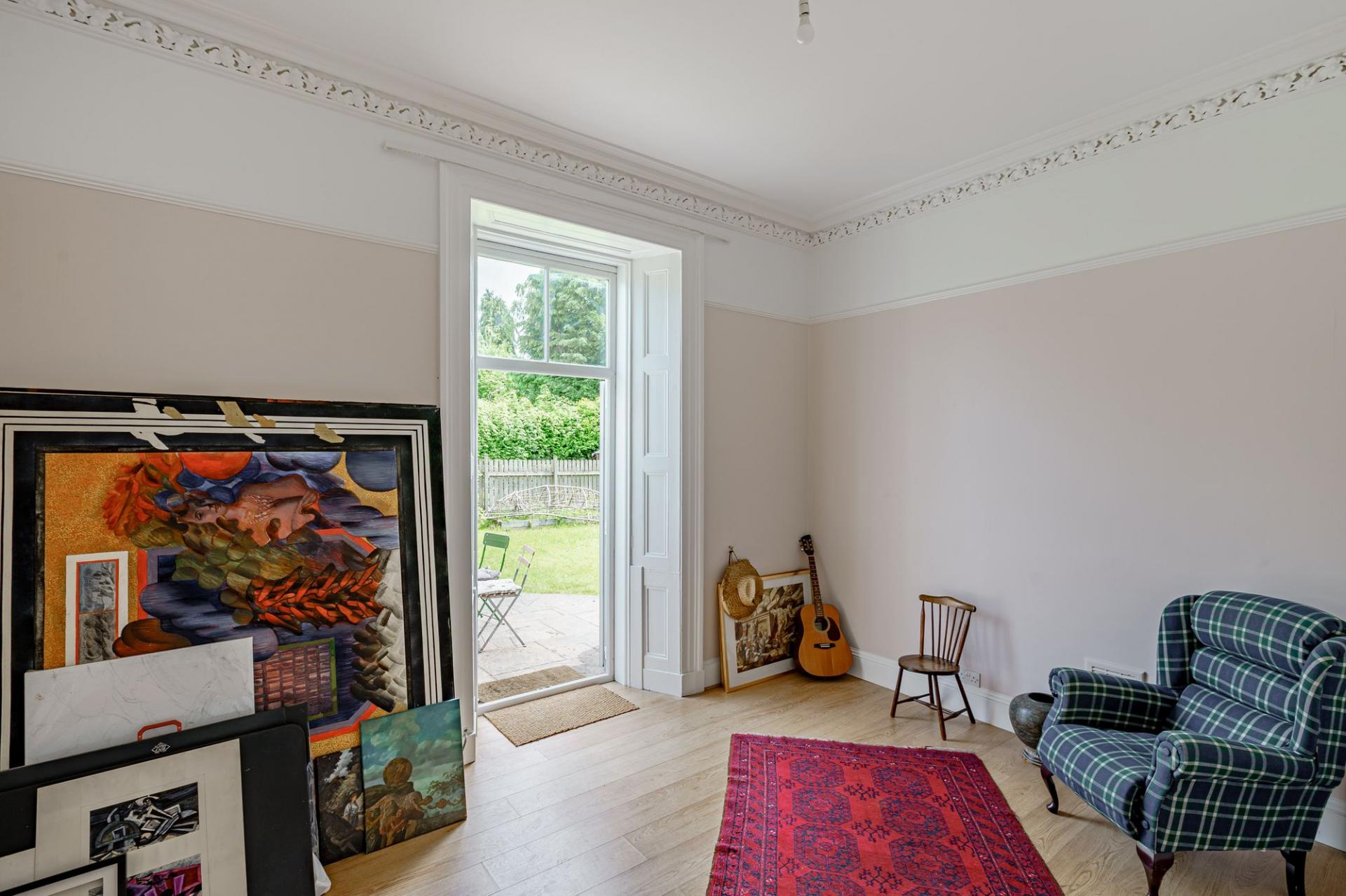 The sitting/dining room is also located directly off the hall and boasts a bay window to the front, wooden flooring, a shelved Edinburgh press cupboard and a multifuel stove within a stone surround. The third reception room is a multifunctional space with French doors that open to the rear garden and this room could be utilised as a further double bedroom if required, especially given that it boasts a modern en suite bathroom comprising bath with shower over.