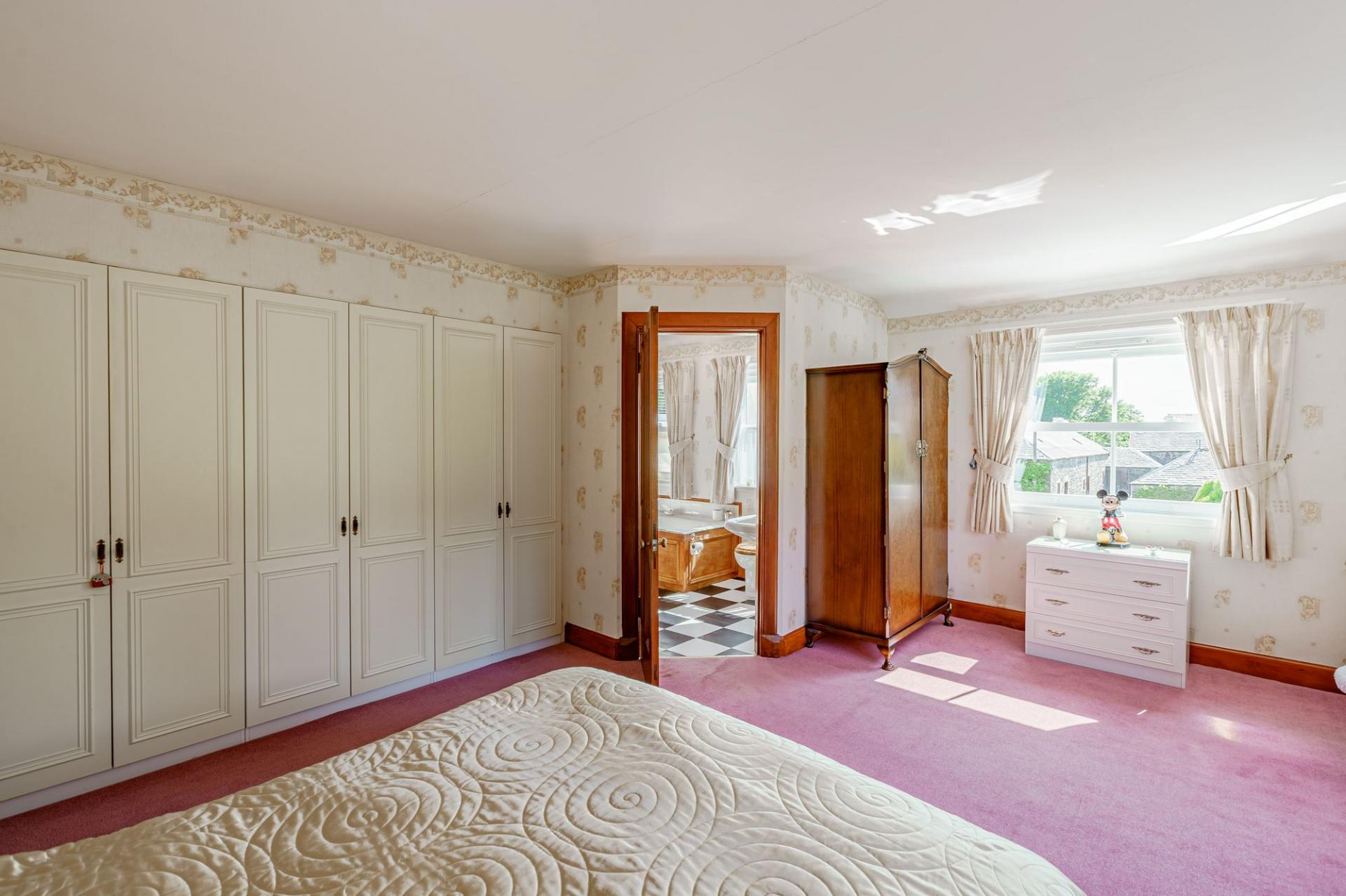 As you ascend the staircase, the landing splits off to the principal bedroom suite. The main bedroom is accessed through its ‘Jack and Jill’ bathroom, which offers a bath, wash hand basin and WC. The bedroom enjoys a dual aspect, views of the field and woodland to the rear, and has a wall of fitted wardrobes.