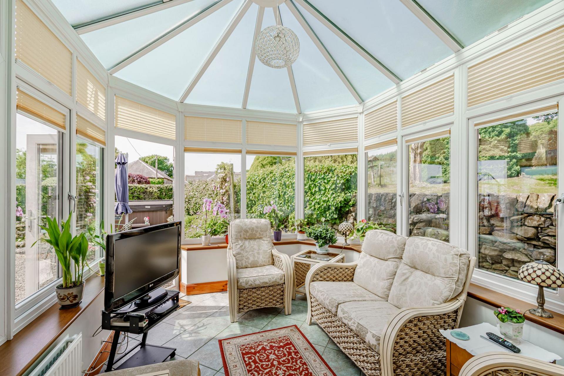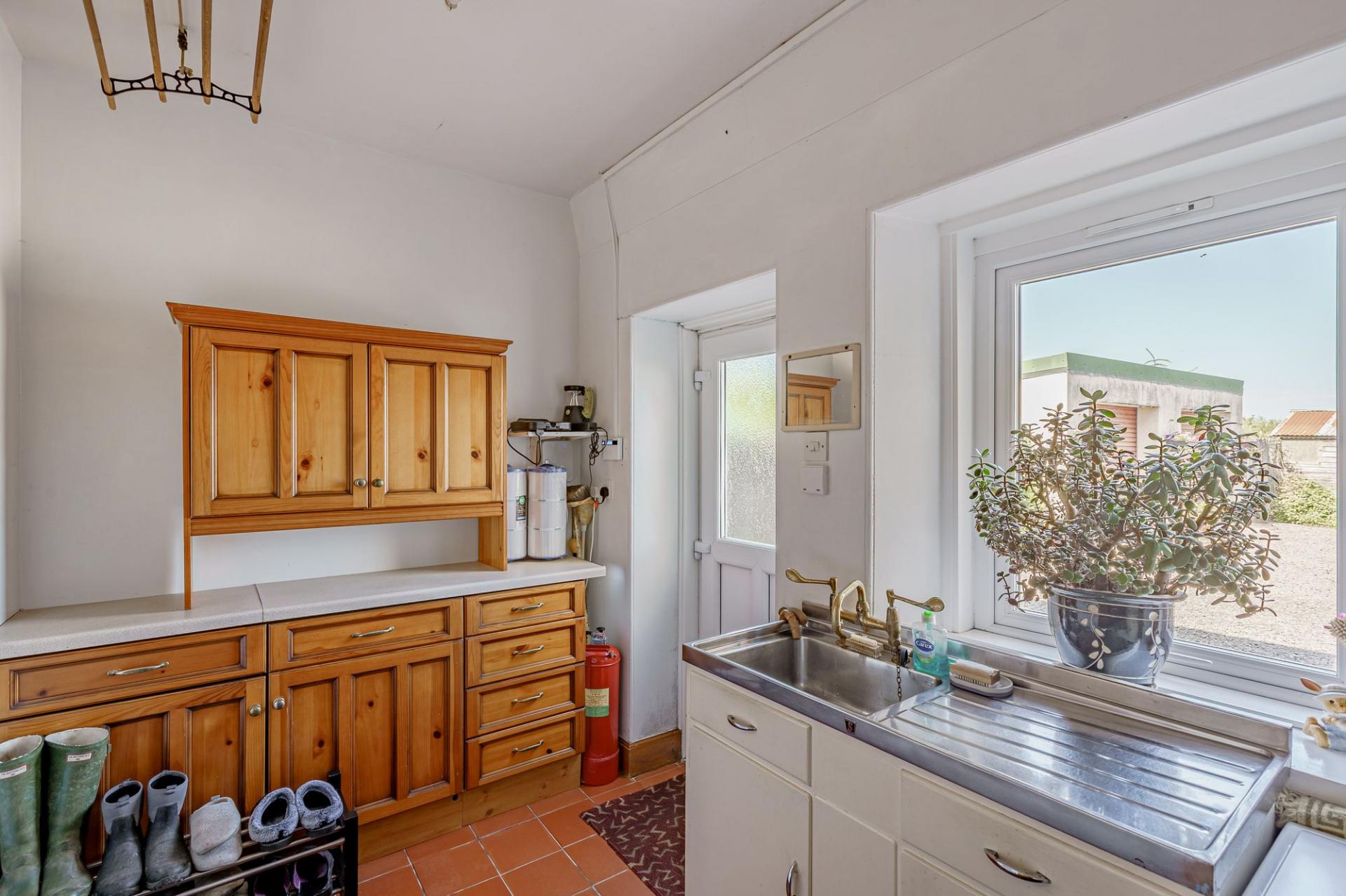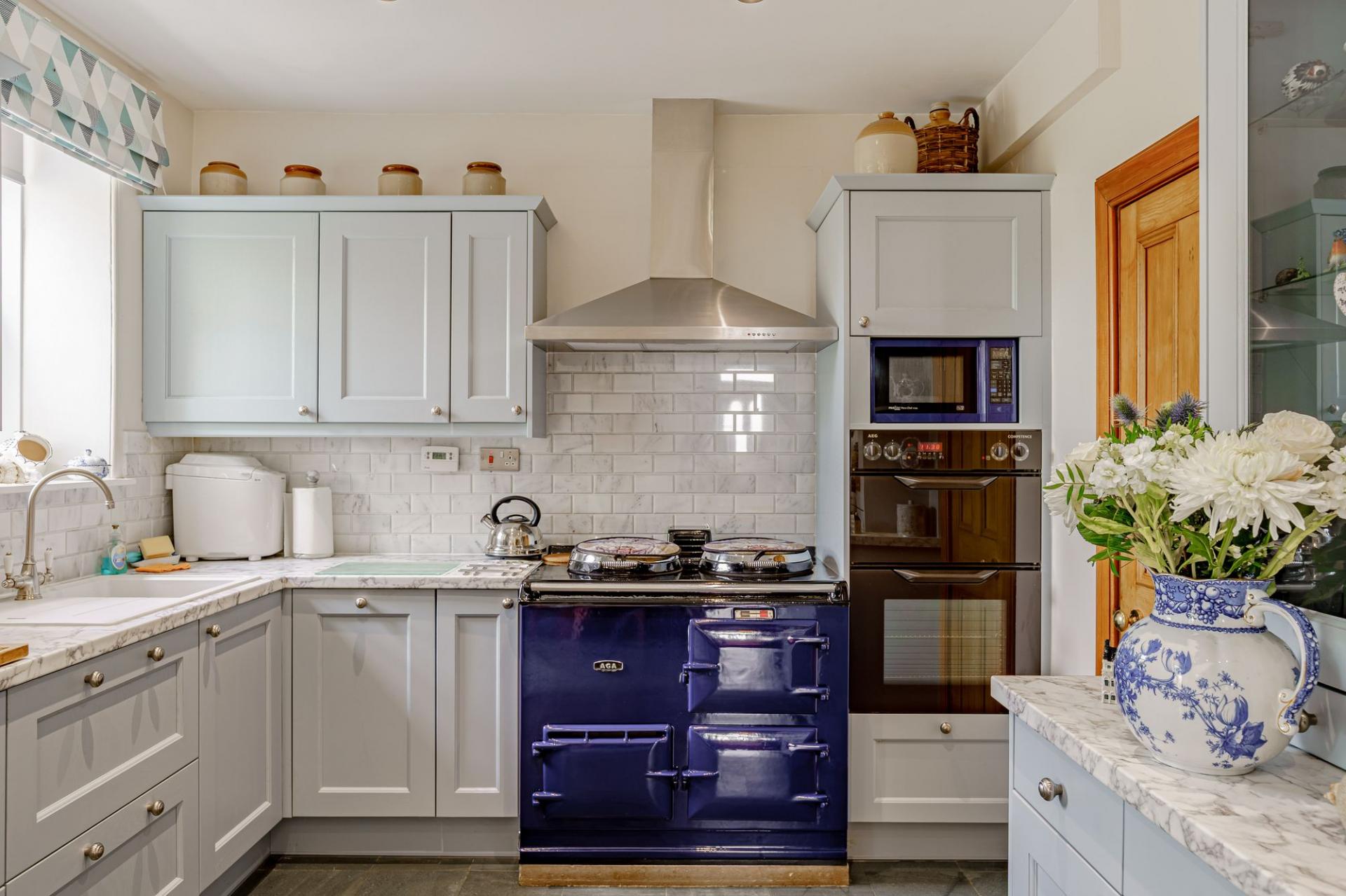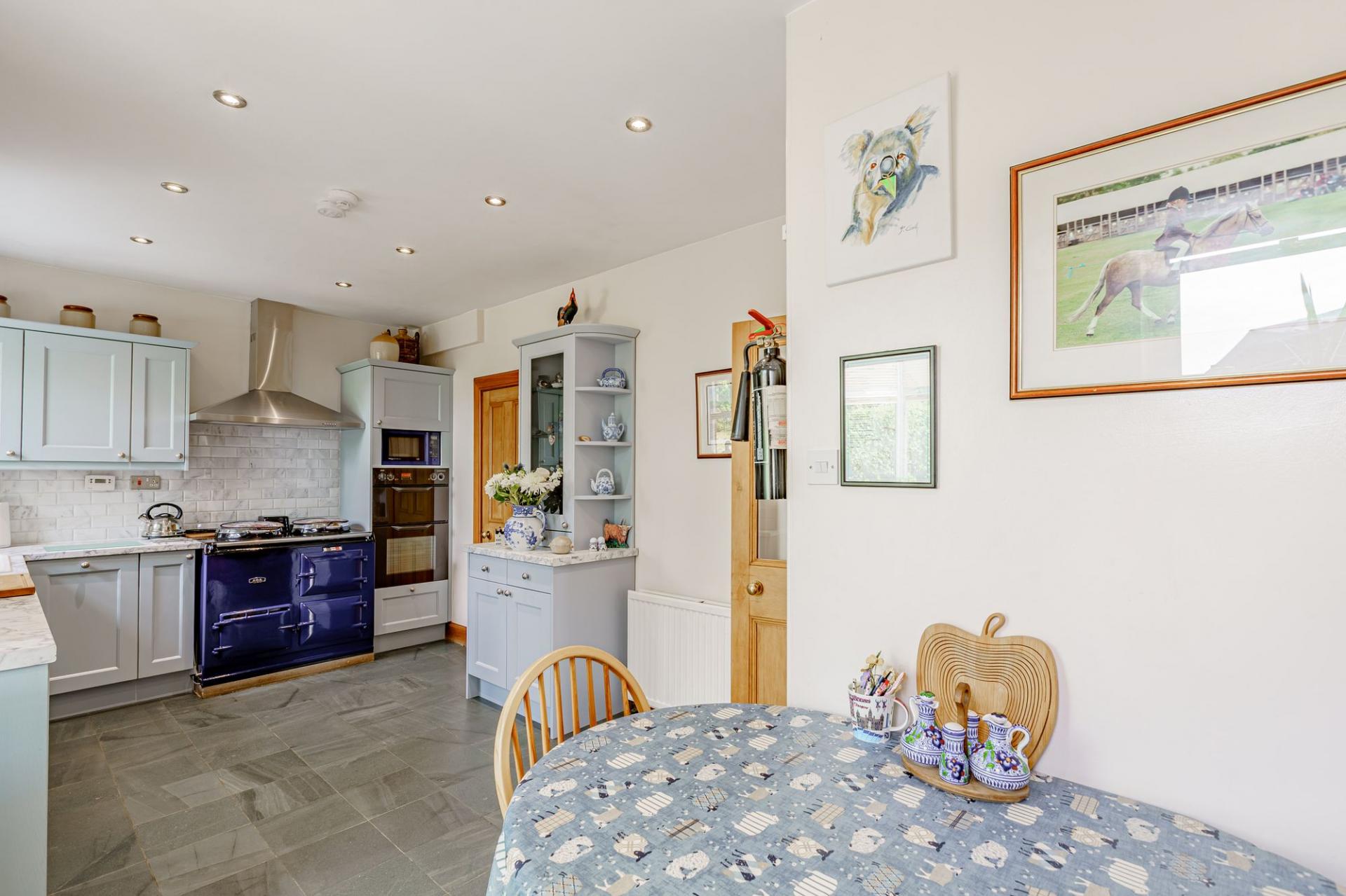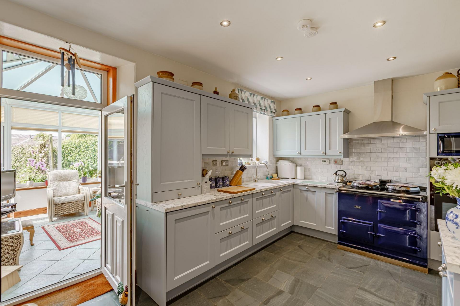 The kitchen offers an excellent range of modern shaker style units with complementary worksurfaces. Integrated appliances include a dishwasher, fridge, electric oven and grill and there is an attractive oil-fired Aga. There is attractive green slate flooring and space for a breakfasting table and chairs, and a shelved walk-in pantry. Directly off the kitchen is the conservatory, which is used all year round and provides direct access to the side garden. A utility room provides storage, a sink and plumbing for white goods, and it has a door to the driveway and garage.