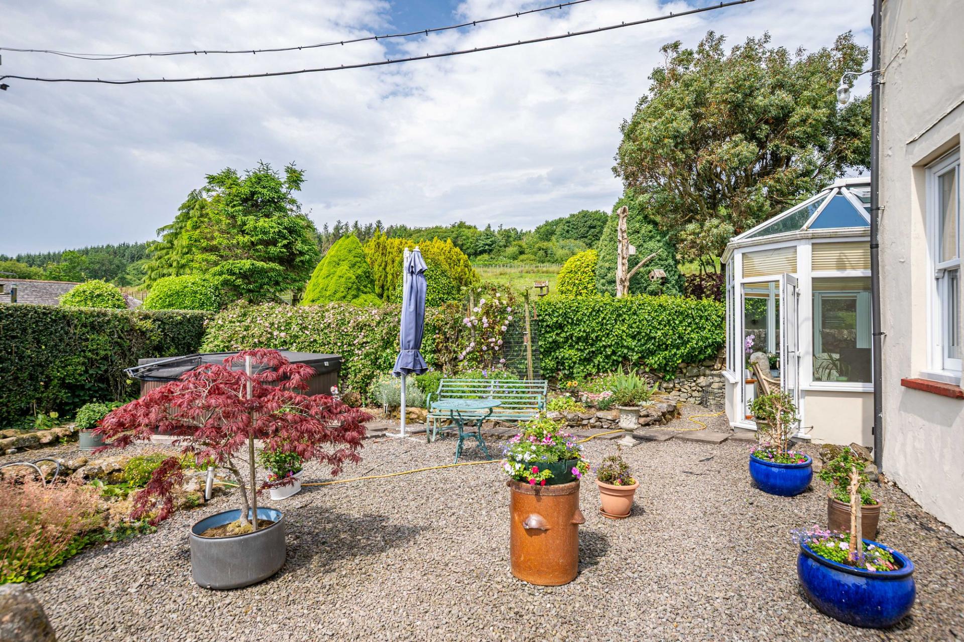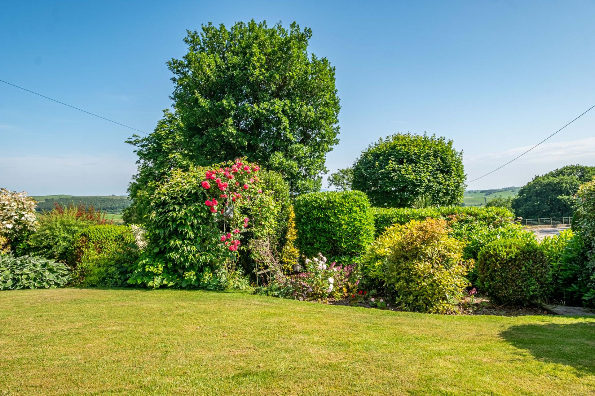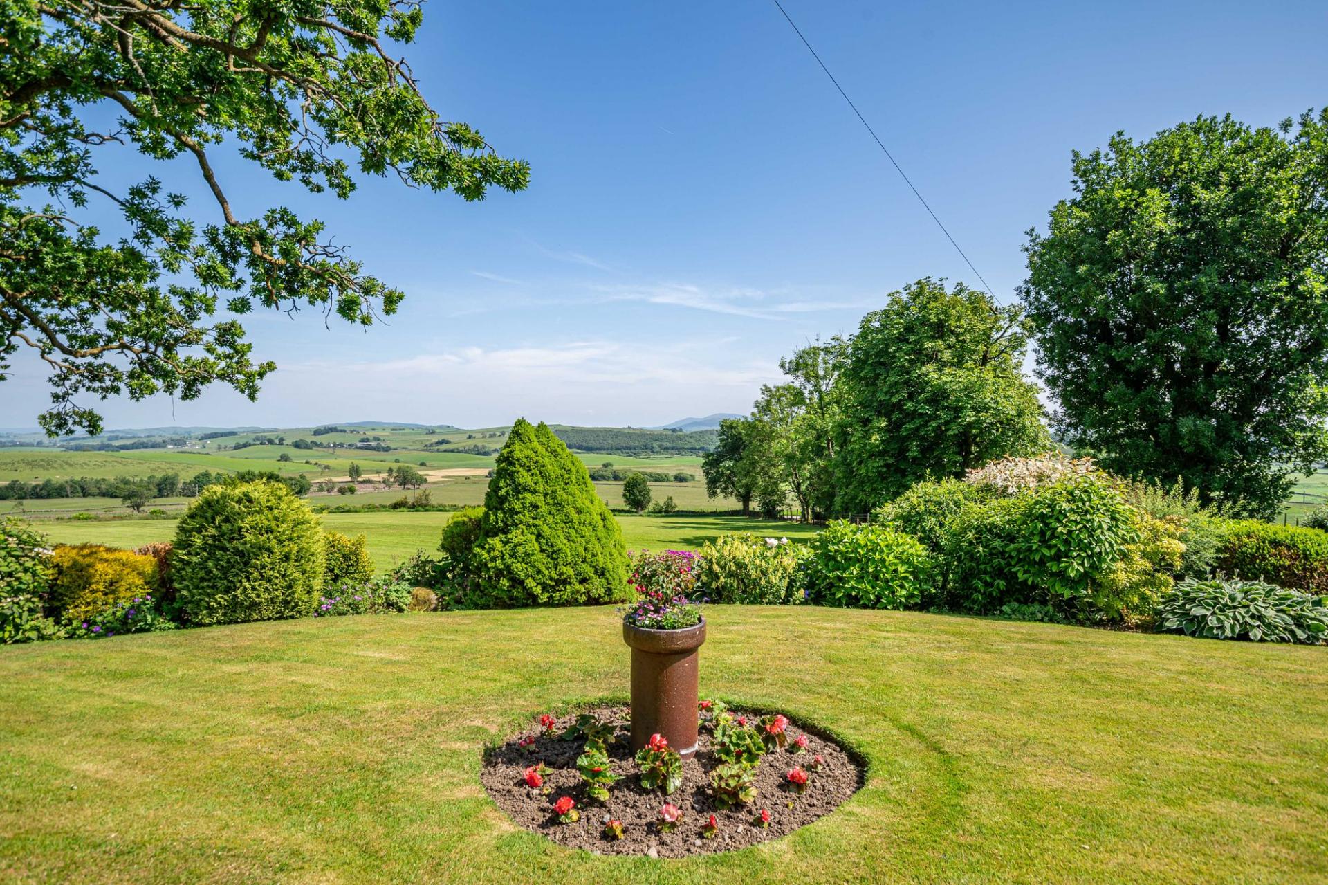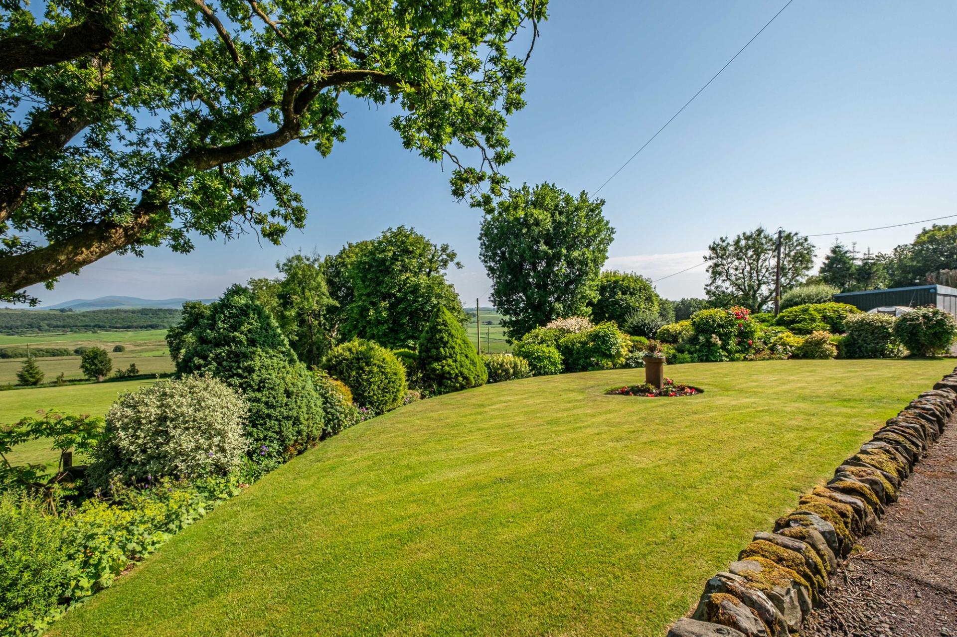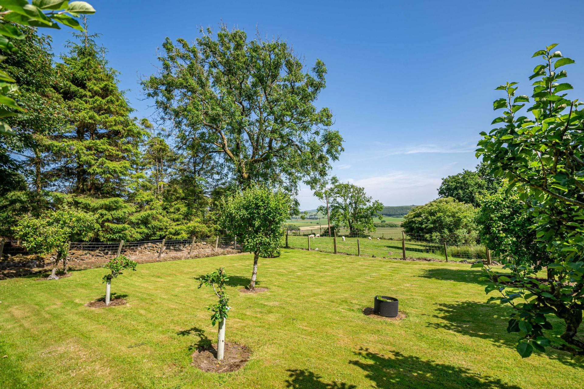 The mature, well-established garden is predominantly to the front and side of the house. Positioned on a sunny and slightly elevated site, the garden enjoys a high level of privacy and far reaching views. The garden areas are immaculately maintained with lawned area, flowering borders and mature shrubs and bushes. The side garden, adjacent to the conservatory, is a lovely sheltered suntrap, gravelled for ease of maintenance, with a flowering border, greenhouse and hot tub (included in the sale). Located between the house and steading is a pond, and in addition there is a polytunnel and an established orchard, offering apple and plum trees, and gooseberry bushes.