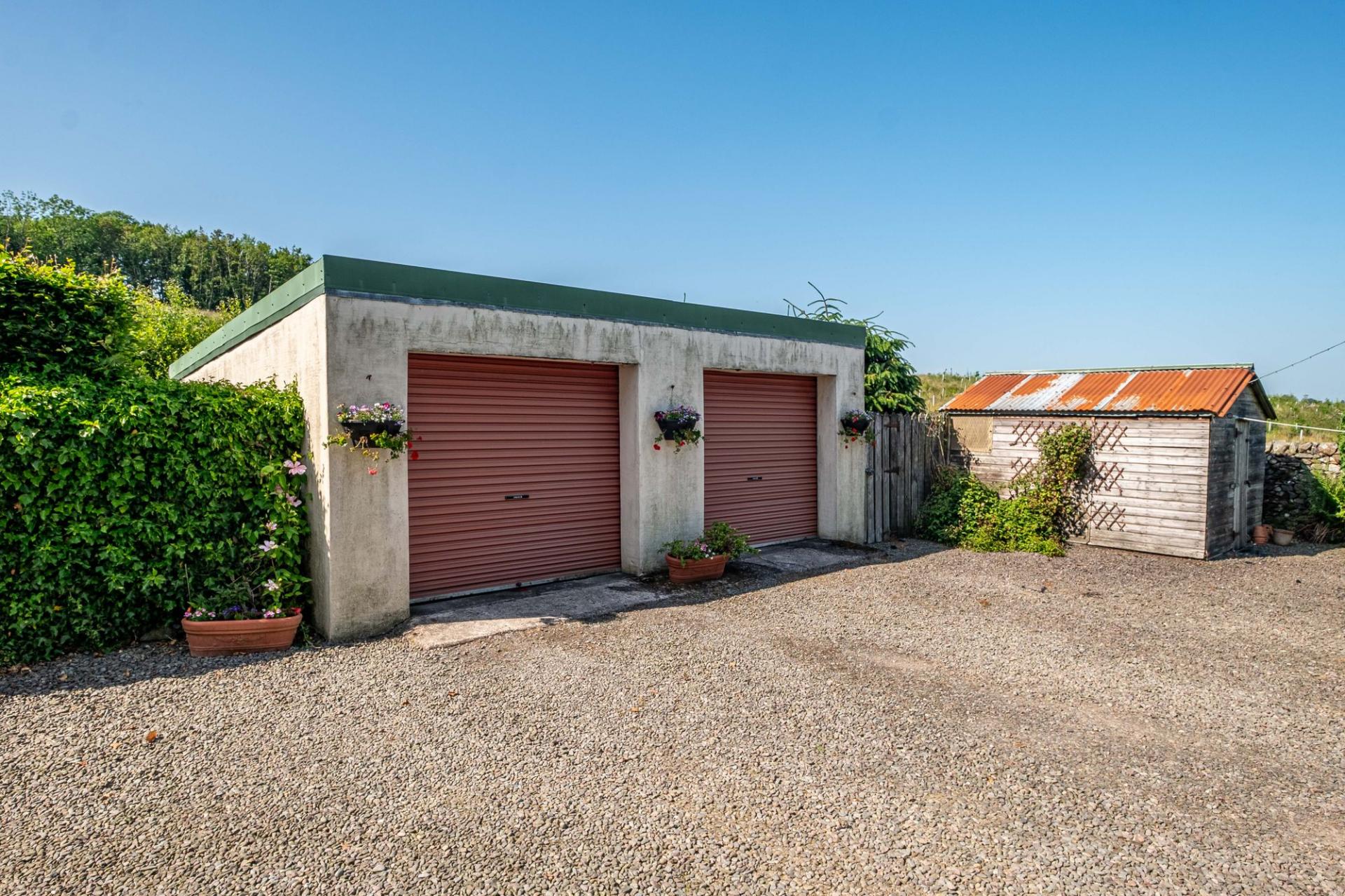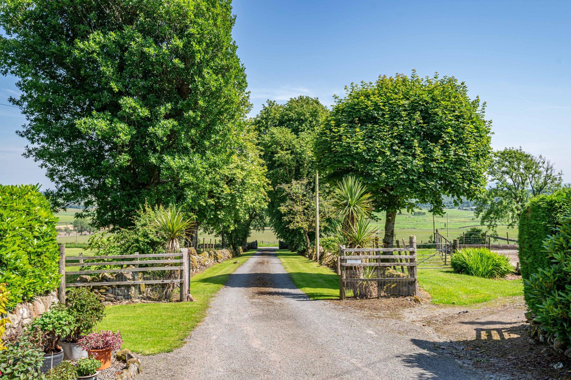 A private, gated entrance with tree lined driveway splits in front of the house. To the left is access to the steading and modern sheds, and to the right is the gravelled parking and turning area, with detached double garage.