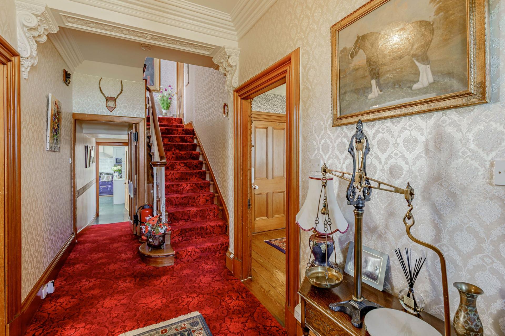 This fine, stone built period house boasts sandstone lintels and steps, under a slate roof, and boasts many original features internally, such as original skirting boards, ceiling cornices and an impressive staircase with wrought iron balustrade. The property has been extremely well maintained by the present owners, who have lived here for approximately 33 years, and has been upgraded over the years to include a modern shaker style kitchen and double glazing throughout. In addition, a biomass boiler provides the central heating and hot water.