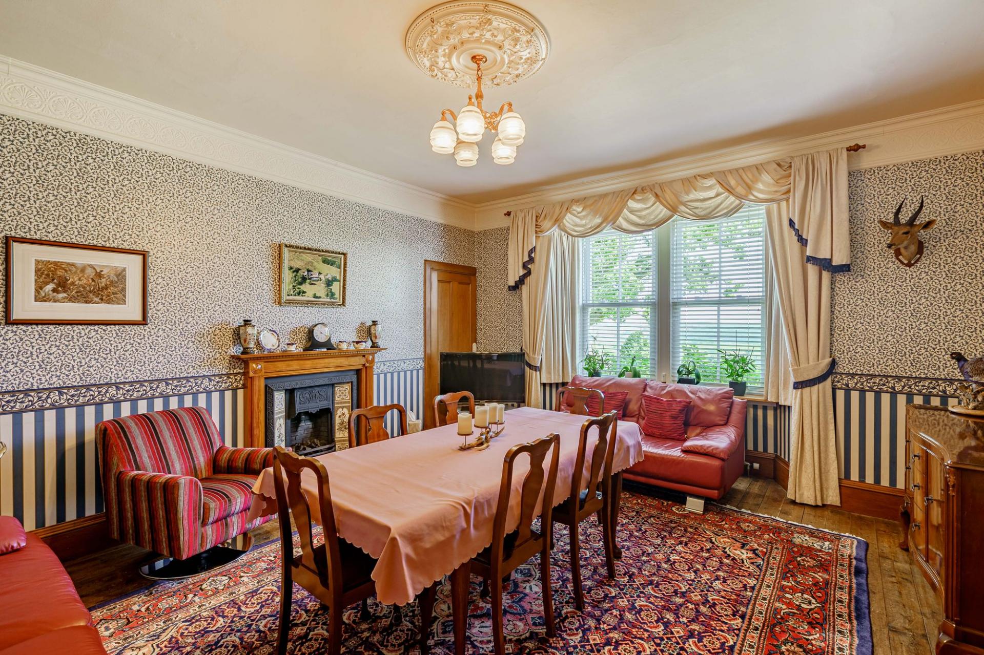 A part glazed front door opens into the vestibule, with its attractive original tiled floor and where a glazed inner door leads into the reception hall. The impressive hall features a lovely timber staircase with wrought iron balustrade, and ceiling cornices. There is also a handy WC tucked under the staircase.