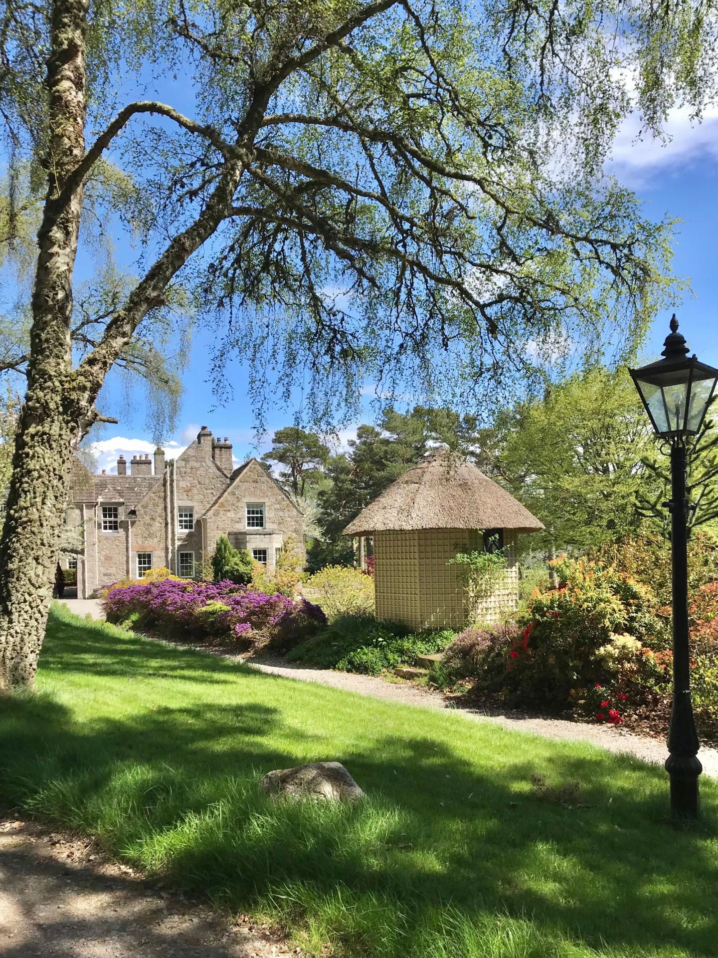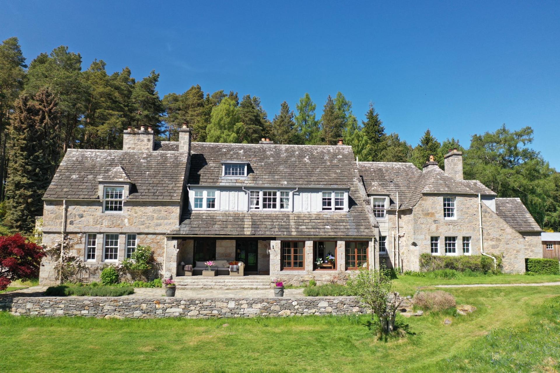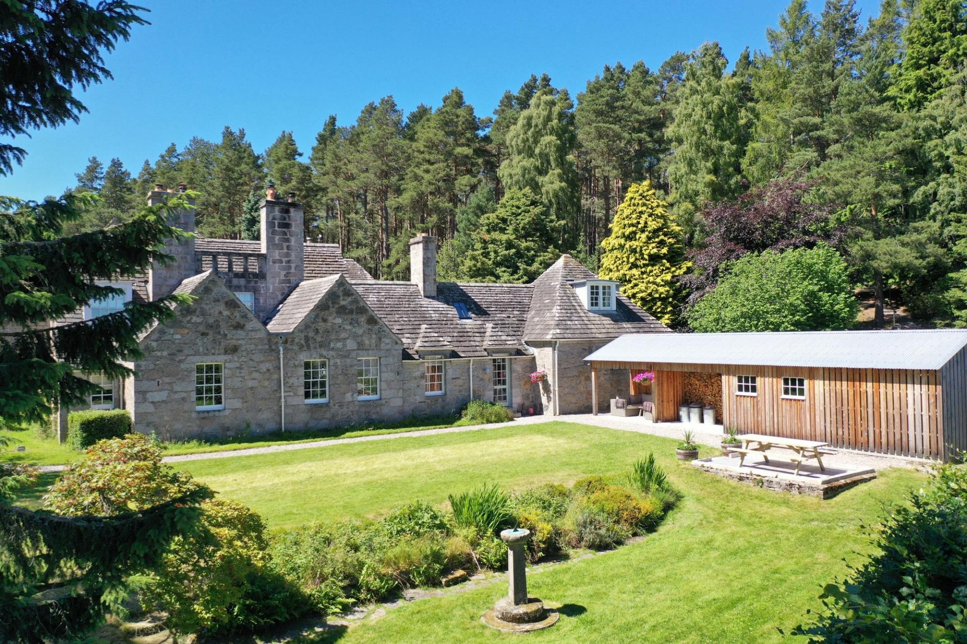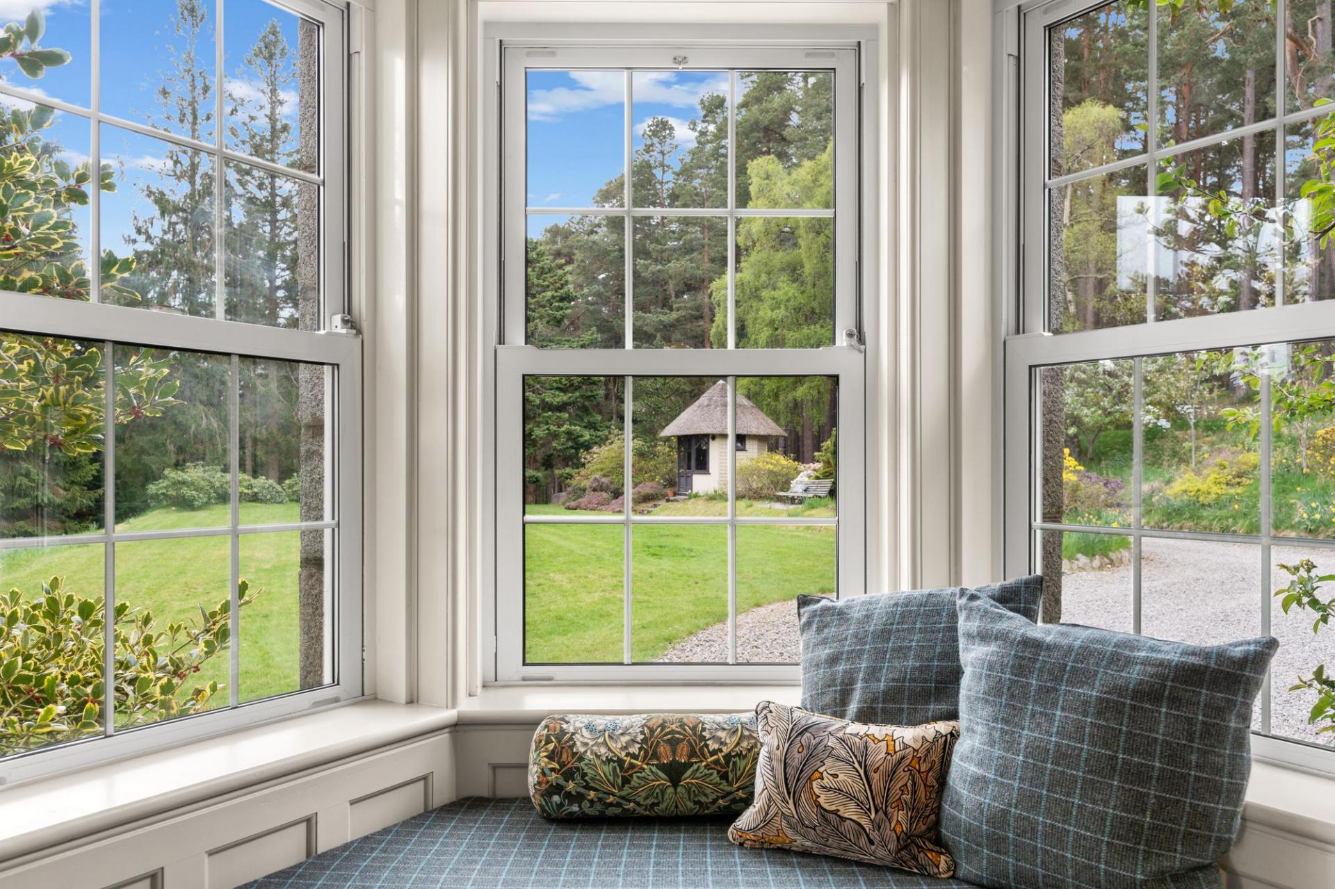 The mature gardens are easy to maintain and extend to approximately 6 acres, providing sunny expansive lawns, well established herbaceous borders, and magnificent scenic views across the river Spey and its valley to the highest Cairngorm mountains. The gardens are south-facing and benefit from sun throughout the day with the verandah providing shade for alfresco entertaining. The former lawn tennis court with its thatched pavilion is a charming feature offering the perfect area for drinks or other social gatherings. The house and gardens are framed by mature trees which extend into ancient Caledonian pine forest to the rear of the property.