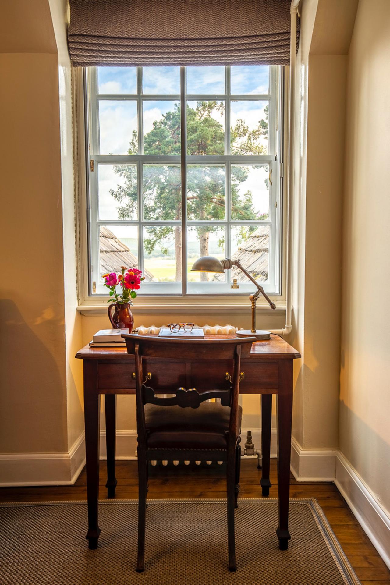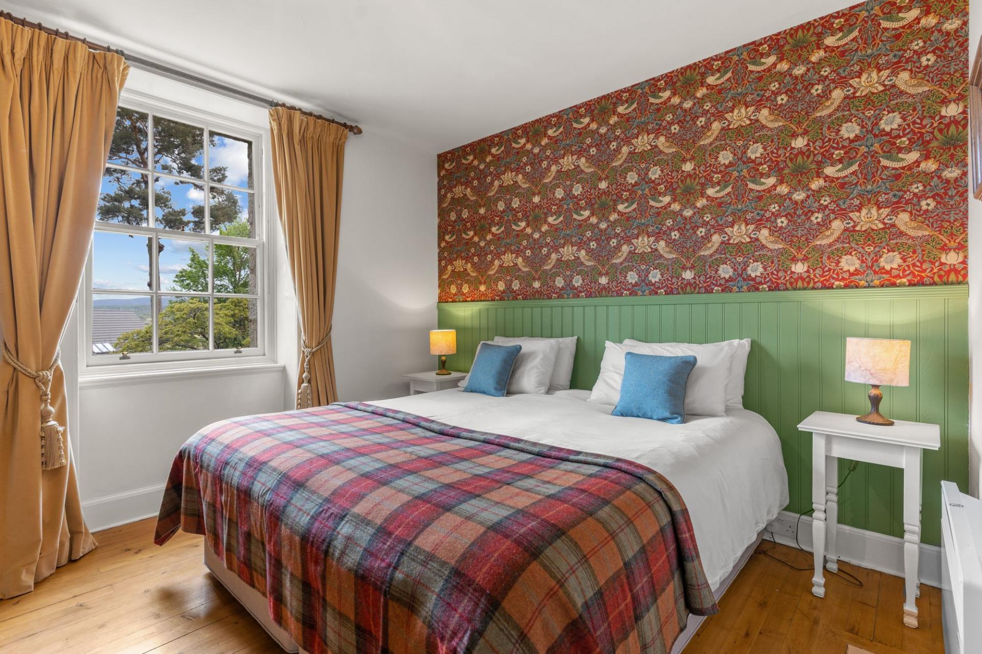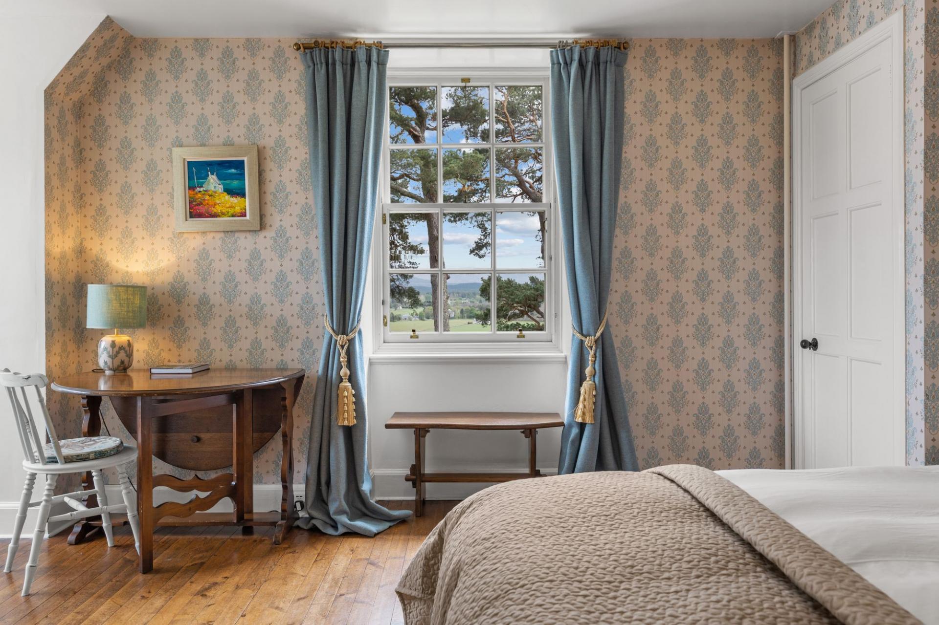 The bedrooms are all centred off the main corridor and enjoy a southerly aspect and far-reaching views. The bedrooms are all substantial in size and each features a seating area or desk. Each bedroom has been decorated to reflect its own unique style with layered textures and a thoughtful use of natural fabrics and a muted natural palate with accent colours reflecting the historical period of the house, whilst use of Scottish designer wares, William Morris wallpapers and natural fibres bring a chic elevated country style to the property whilst still reflecting its past and emphasising the doctrine of the Arts and Crafts Movement:- the use of vernacular design, patterns inspired by nature and simplicity of design. The bathrooms have all been sympathetically upgraded with original fixtures retained where possible, and high quality fittings.