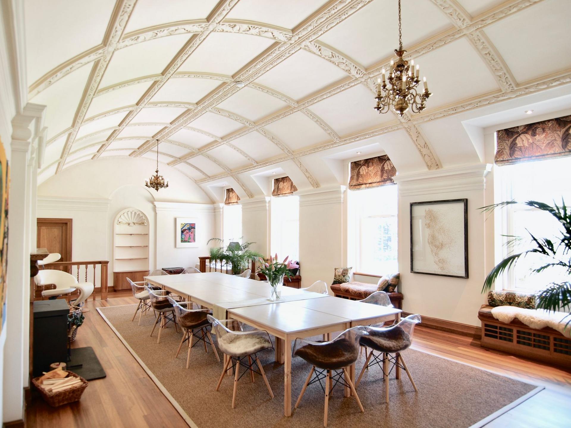 One of the bedrooms also gives access to the roof terrace overlooking the courtyard to the rear of the property. The spectacularly lavish vaulted music/living room is a later addition and is a superb reception space with a barrel-vaulted ceiling that was designed by Sir Basil Spence, a pristine Indian rosewood wood floor and a large woodburning stove. Formerly used as a room for entertainment it has also been used as a library and is now set up as a meeting room. Alternative uses are endless with scope to provide a boardroom, informal zoned family living space or as a grand reception hall for guests, if the house would become a non-domestic living space.