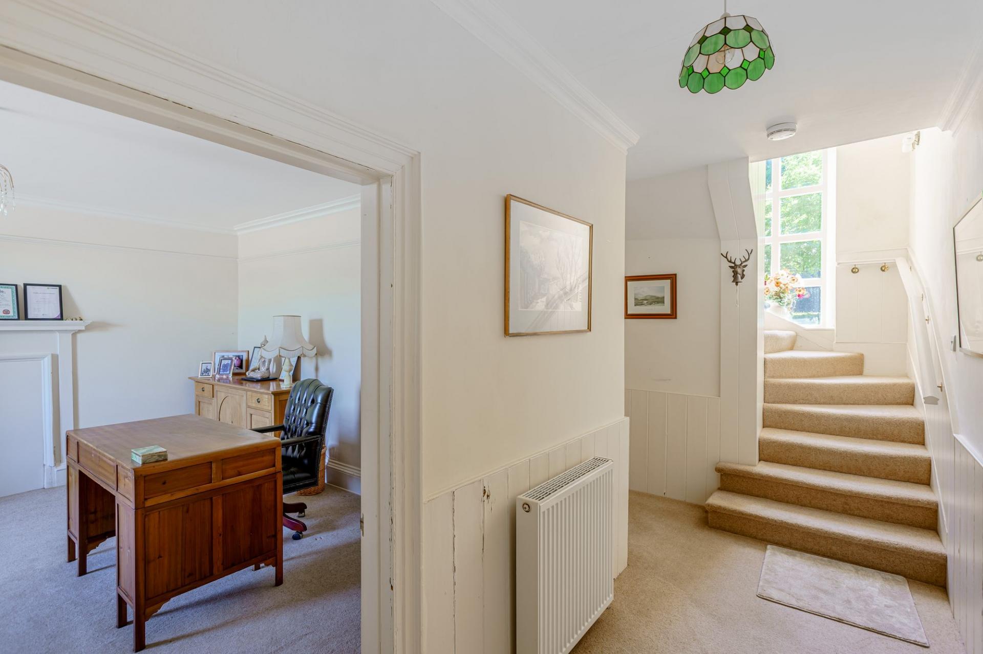 The solid front door opens into a vestibule, with part glazed inner door to the hall. Directly off the main hall is the drawing room, dining room and the study. The drawing room is filled with natural light via three large sash windows set into a bay, and enjoys far reaching views. There is an additional window to the side, ornate cornice work to the ceiling, and an open fire set in a marble surround. The adjacent dining room is equally large in proportion, and is a fabulous space for entertaining, with large windows to the side elevation and a black marble fireplace.
