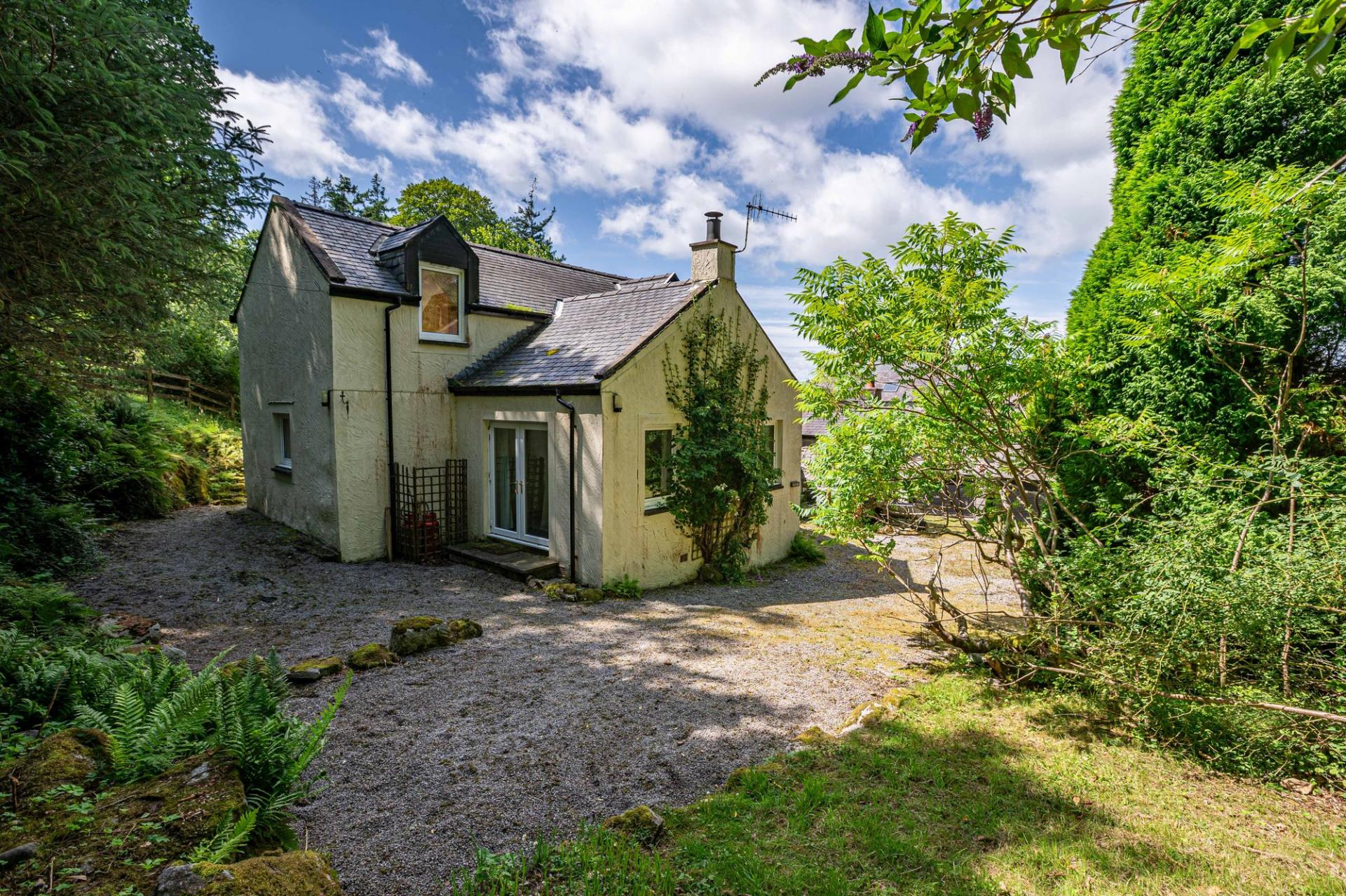 Tucked behind the garage and workshop, with private parking space and small wooded garden area, this cottage offers a kitchen/breakfast room, cosy sitting room with multi-fuel stove, utility cupboard, two double bedrooms, an attic room/den, bathroom and an additional WC.