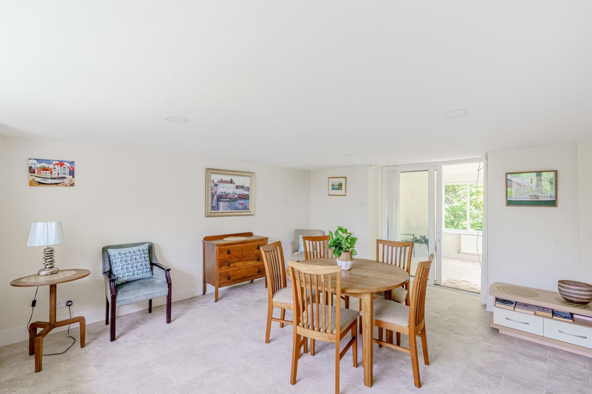 The study is a multi-purpose room, that could equally become a child’s playroom, and there is a sunny garden room to the rear of the house, with French doors leading directly out to the patio and garden.