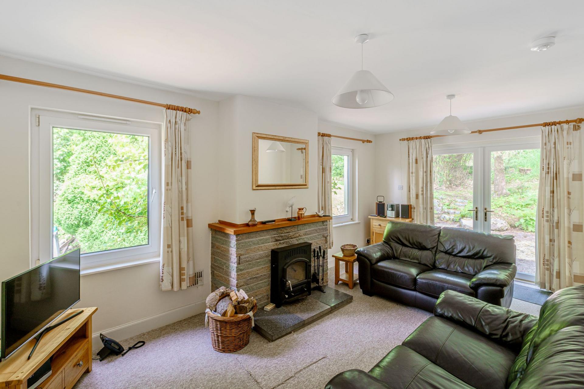 This bright and spacious cottage offers a modern fitted kitchen, a large double height sitting room with multifuel stove and direct access to a patio, a family room, garden room, WC, and two generous en-suite double bedrooms.