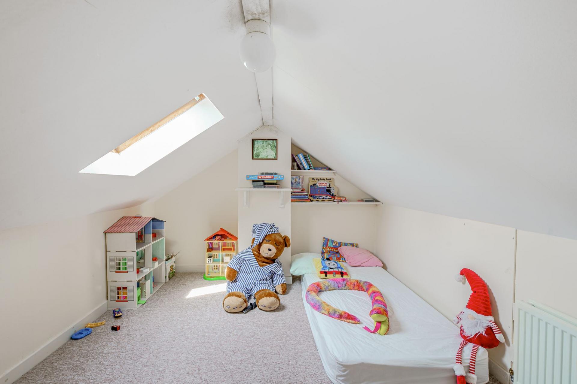From the first floor stairs rise to the second floor. This floor comprises three separate areas, which would make an ideal children’s wing or teenage den perhaps. The large central area is an open plan flexible use space with skylights, WC and deep storage cupboard (there is certainly potential to create a shower room if desired). A set of open tread wooden stairs lead to a charming office/bedroom 5, which has a dual aspect, great views, exposed beams and access to attic storage. A further set of open tread stairs from the central area leads up to an attic room/den.