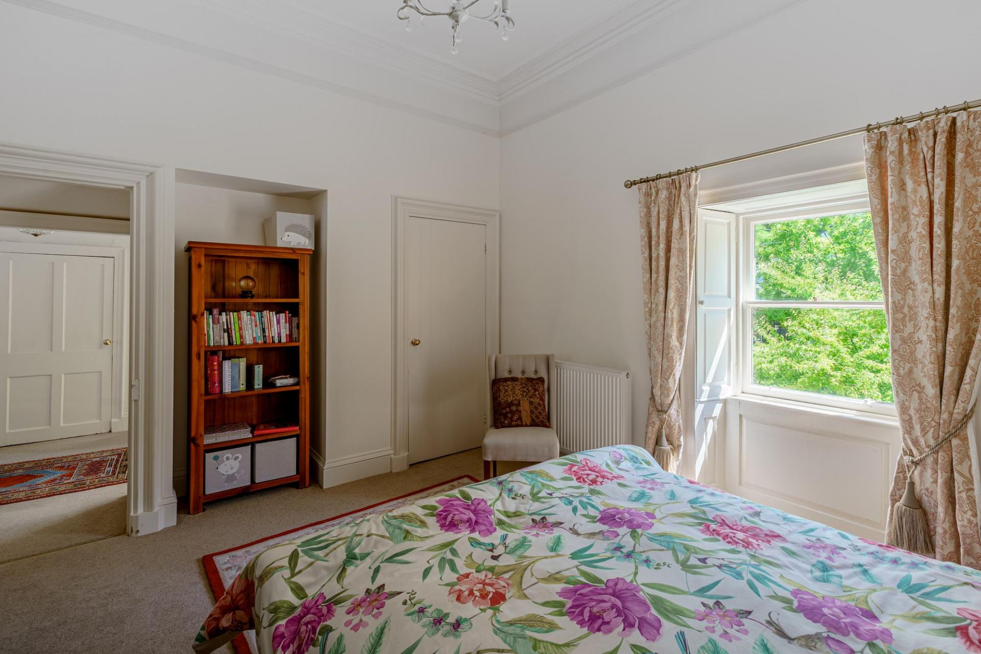 Carpeted stairs rise to the first floor, where four well-proportioned double bedrooms can be found. The principal bedroom suite is accessed via three further stairs, and offers an area with fitted wardrobes, a separate dressing room and an ensuite bathroom comprising free standing bath, corner shower cubicle, WC and wash hand basin. The bedroom itself is very generous in size and boasts an ornate ceiling cornice, an original fireplace and a wide bay window that offers fantastic views.