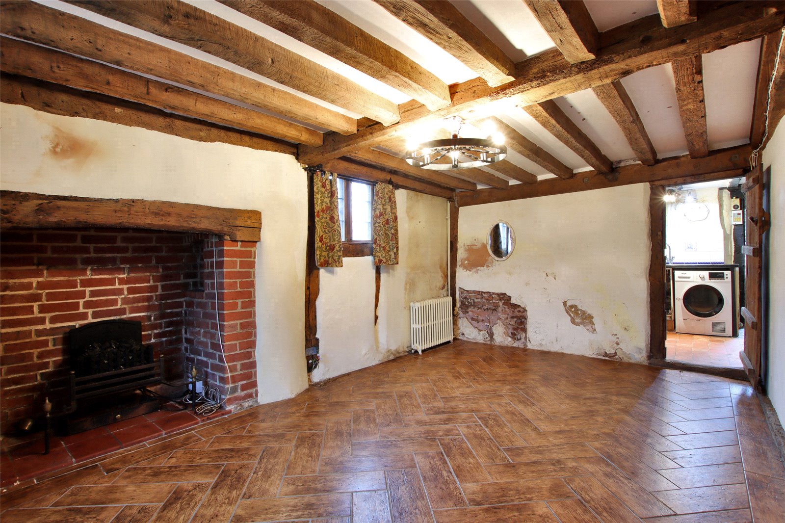 Entrance Hall Period door to front. Two leaded light effect secondary glazed windows to side. Beamed ceilings and walls. Radiator. Stairs leading to landing.