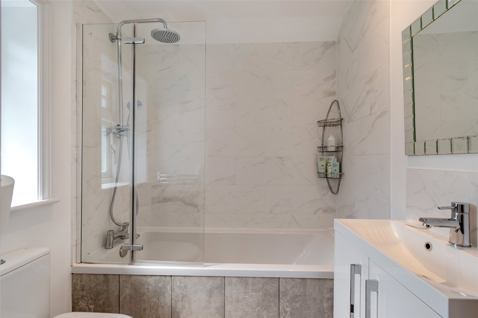En-Suite Bathroom 5'10" x 5'1" (1.78m x 1.55m). Tiled flooring. Plain ceiling with downlights. Panelled bath with shower over. Wash hand basin in vanity unit. Low level WC. Local tiling to walls.
