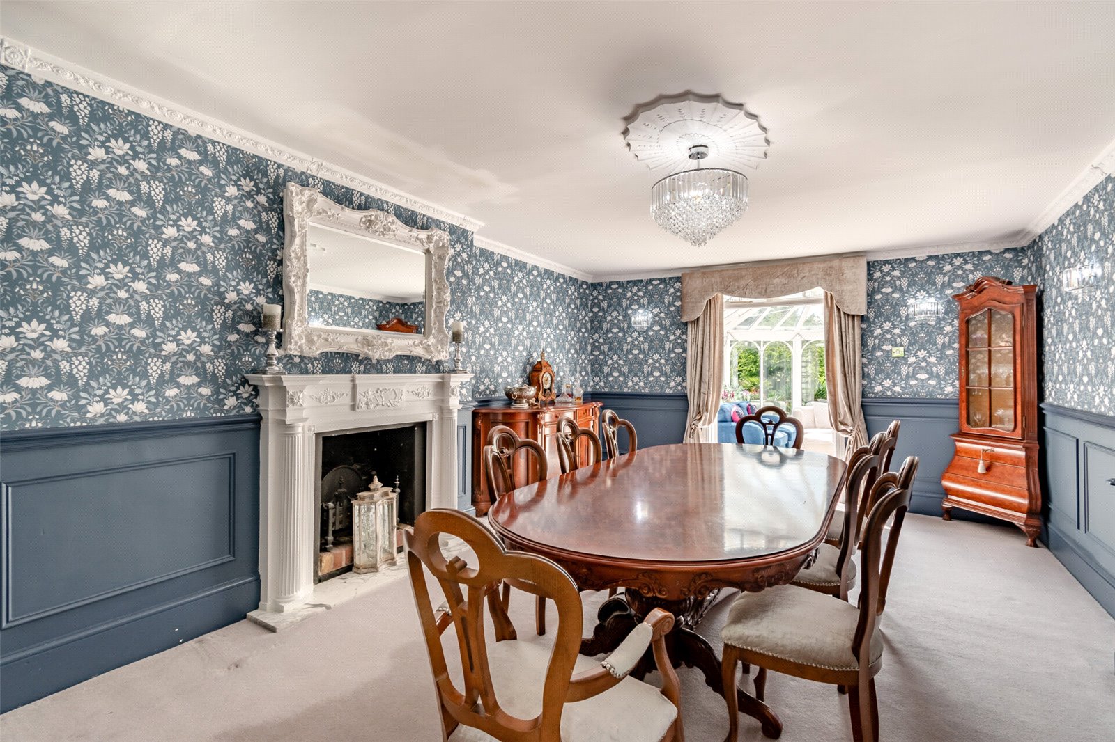 Dining Room 21'11" x 13'9" (6.68m x 4.2m). Window to front. French doors to rear conservatory. Plain coved ceiling. Two radiators with covers. Panelled walls. Period style working fireplace.
