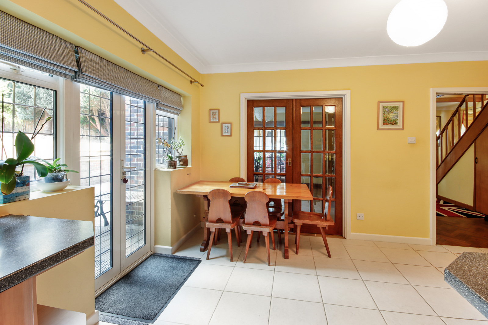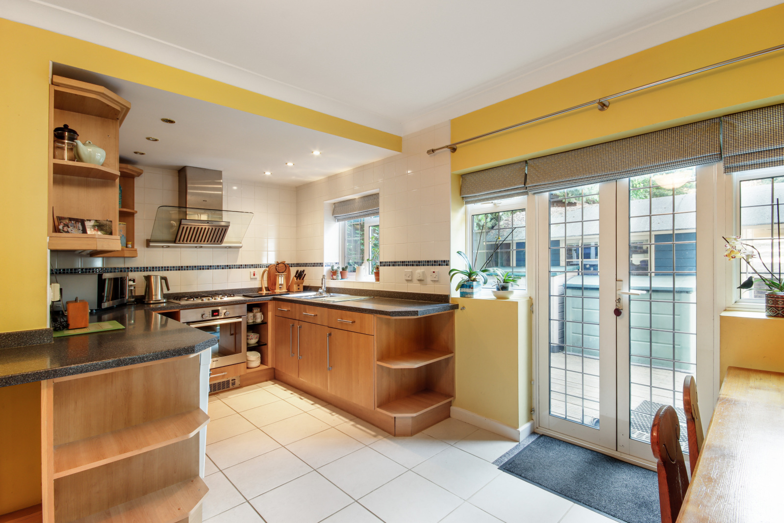 Kitchen/Breakfast Room 16'3" (4.95m) x 12'11" (3.94m) narrowing to 7'7" (2.3m). L'shaped. Double glazed leaded light effect window to rear. Double glazed leaded light effect French doors to rear with windows to either side. Tiled flooring with underfloor heating. Plain coved ceiling. Radiator. Fitted wall and base units. Stainless steel sink and drainer unit with mixer taps. Stainless steel Bosch gas hob and oven with stainless steel filter hood over. Local tiling to walls. Bosch dishwasher. Bevelled glass panelled double doors leading to the dining room.
