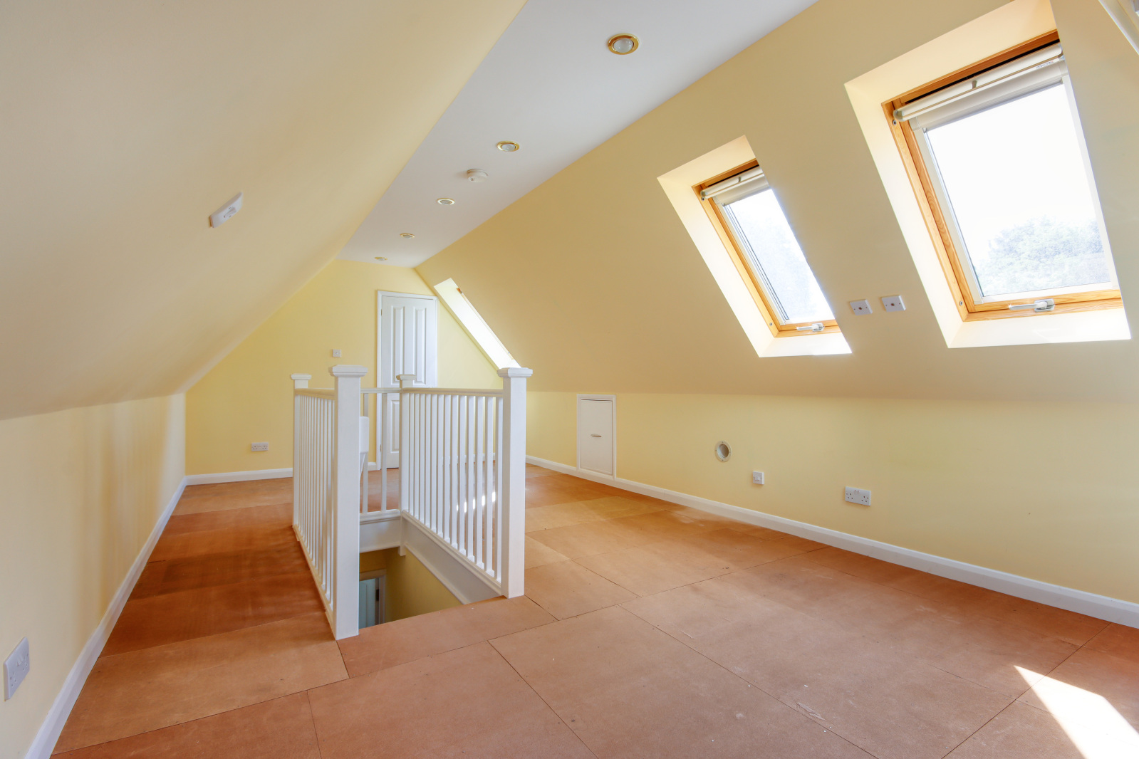 Attic Bedroom 22'6" x 11'4" (6.86m x 3.45m). Three Keylite windows to rear. Keylite frosted window to side. Plain ceiling with downlights. Two eaves storage. Door to: